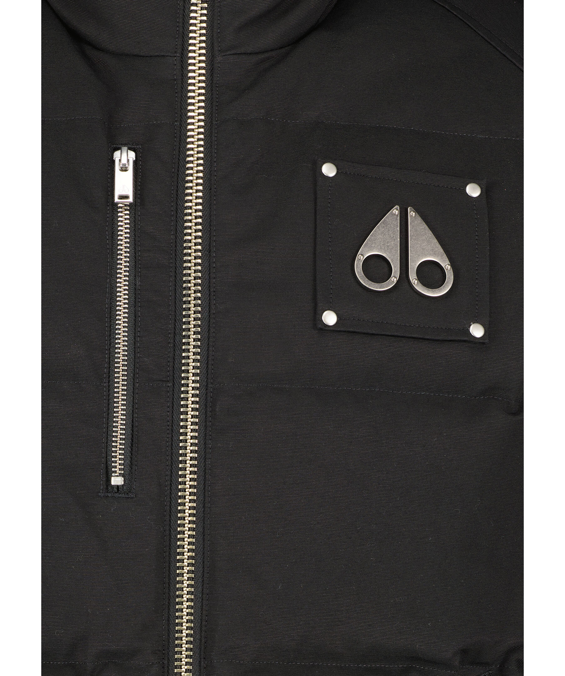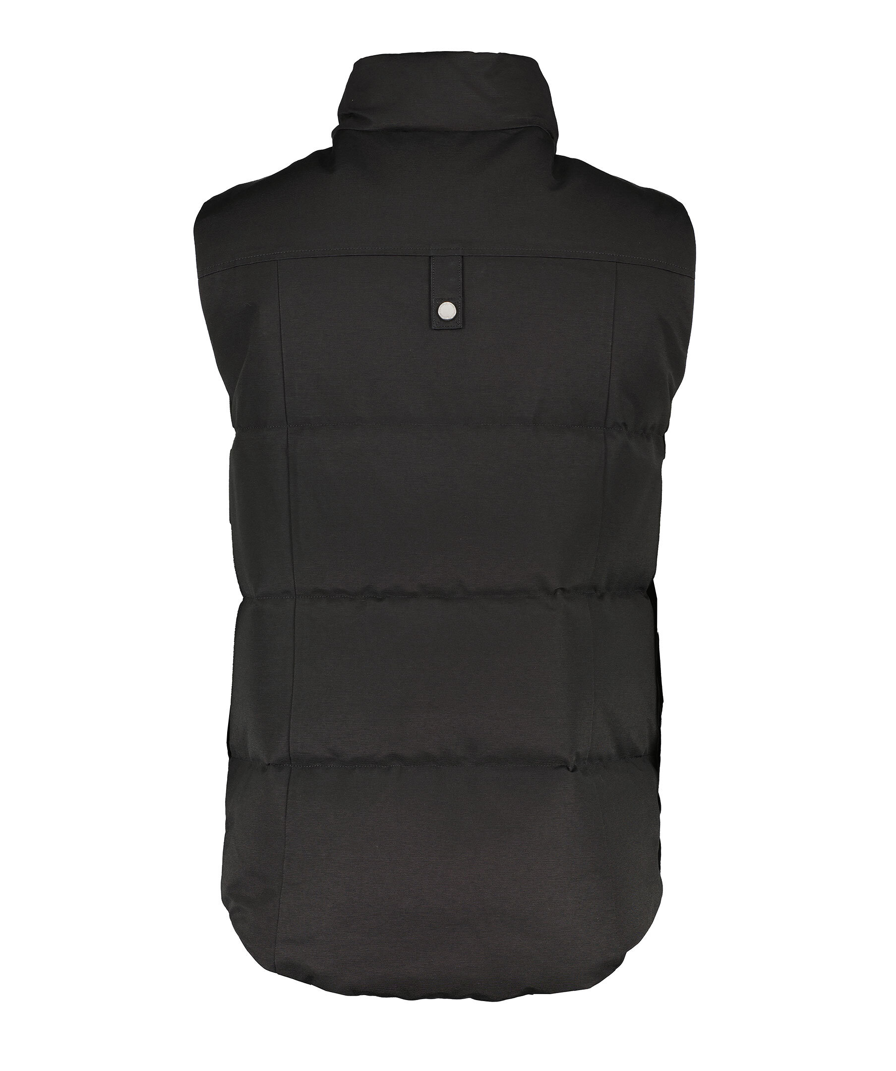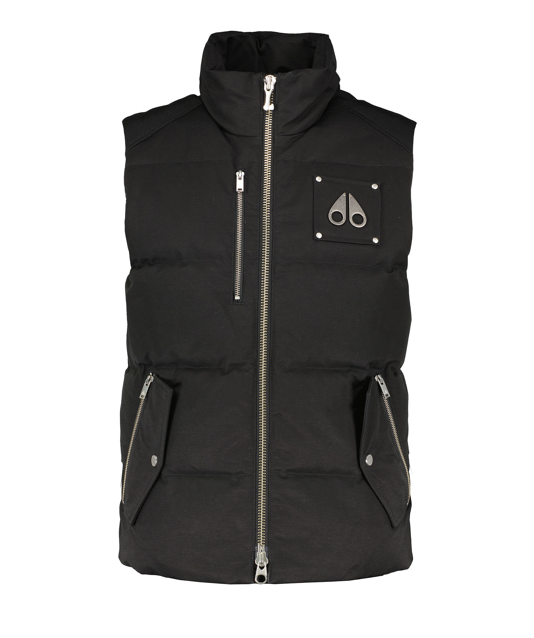 Svart quiltad väst från Moose Knuckles. Västen stängs framtill med tvåvägsdragkedja och har två sidfickor med dragkedja och två med tryckknapp, en bröstficka med dragkedja samt patch med metallogotyp på bröstet. Tillverkad i en bomullsblandning.