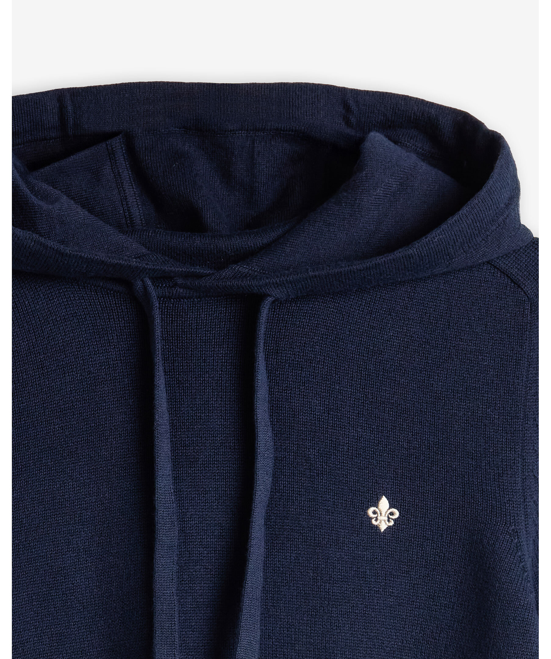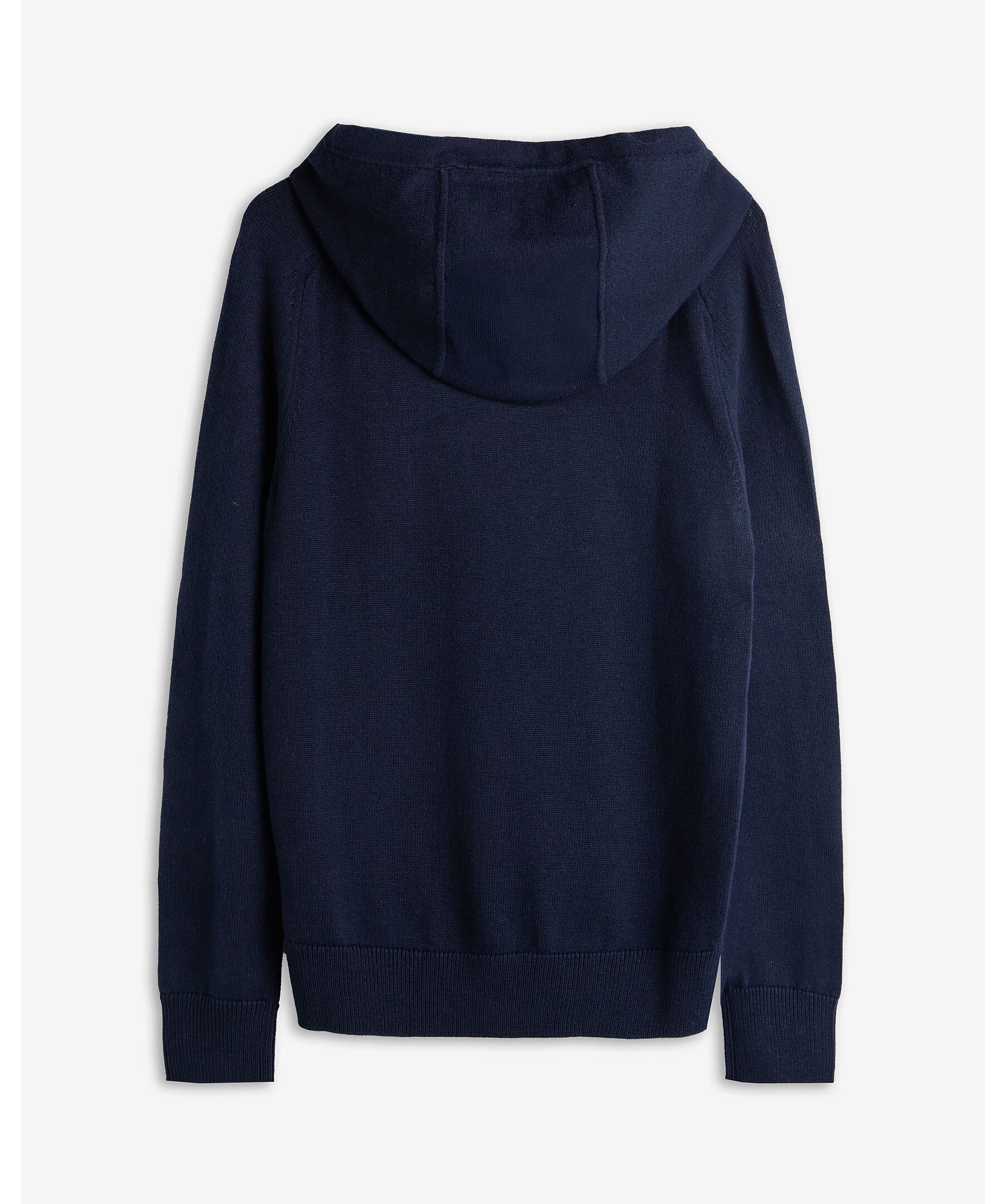Mörkblå, finstickad huvtröja från Morris. Tröjan har huva med snörning samt ribbstickade muddar vid ärm- och plaggslut och broderad logotyp på bröstet. Tillverkad i en bomull- och merinoullblandning.