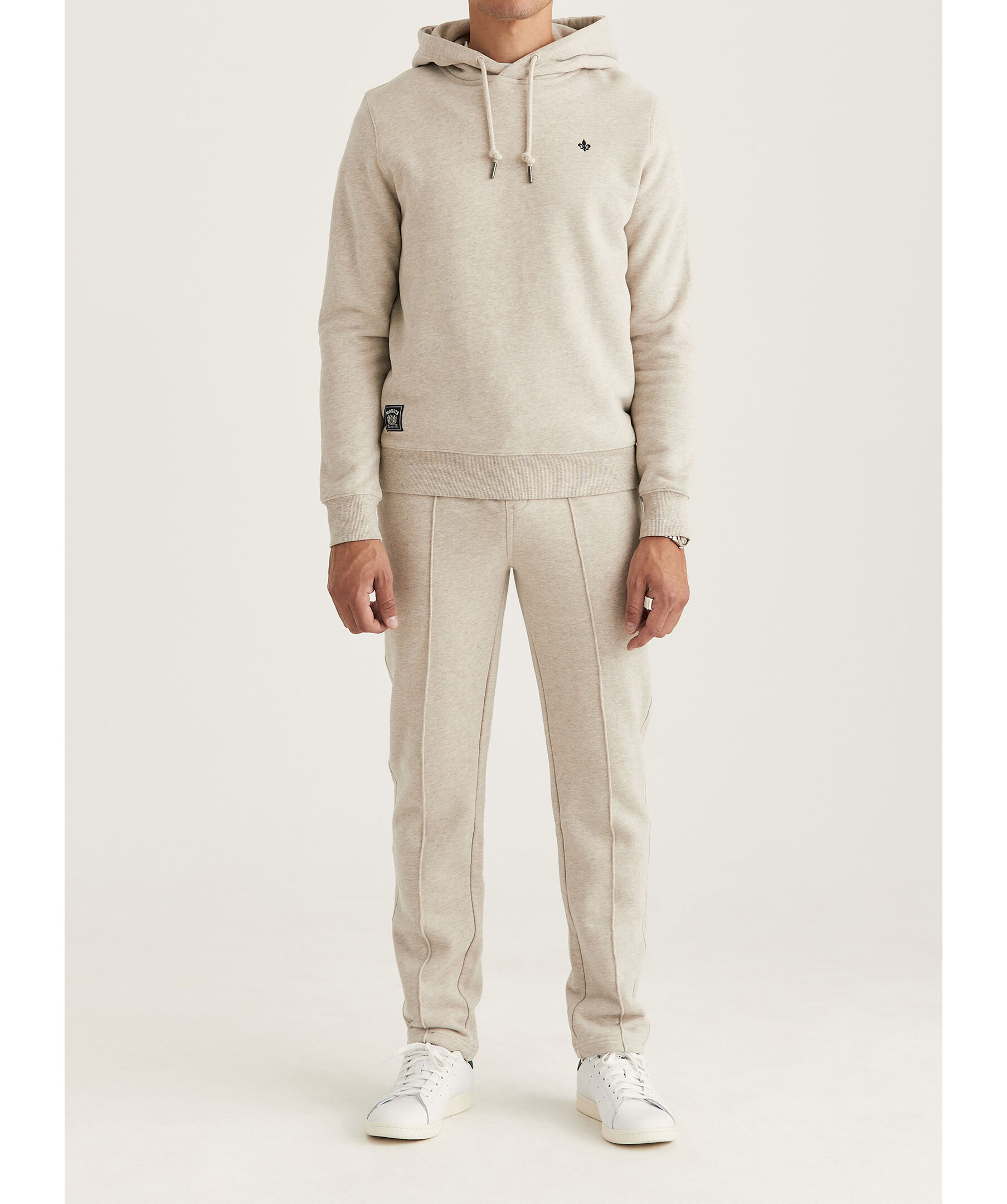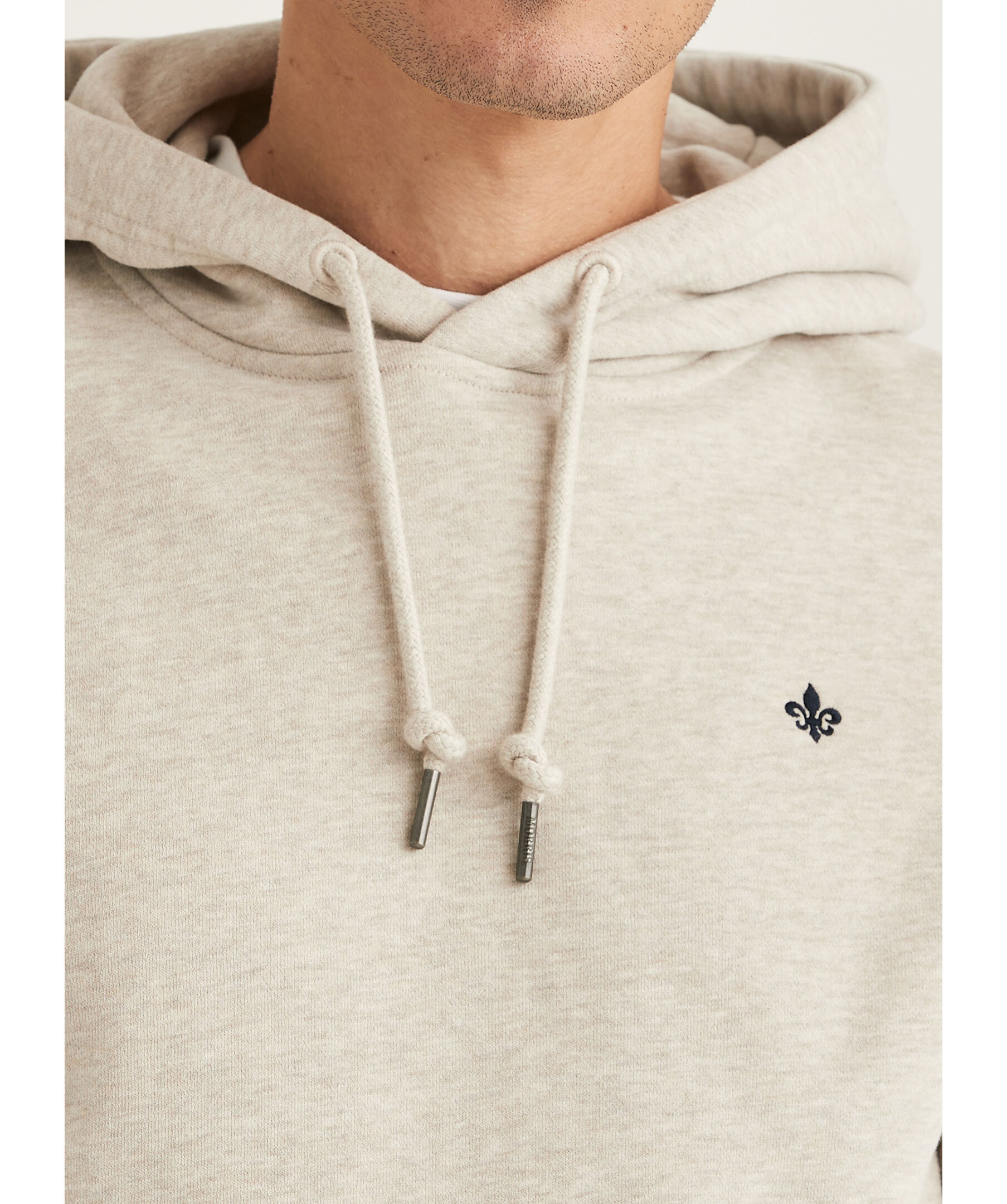 Khakifärgad hoodie från Morris. Tjocktröjan har huva med dragsko, ribbstickade muddar samt broderad signaturlilja på bröstet. Tillverkad i 100% borstat bomullstyg.