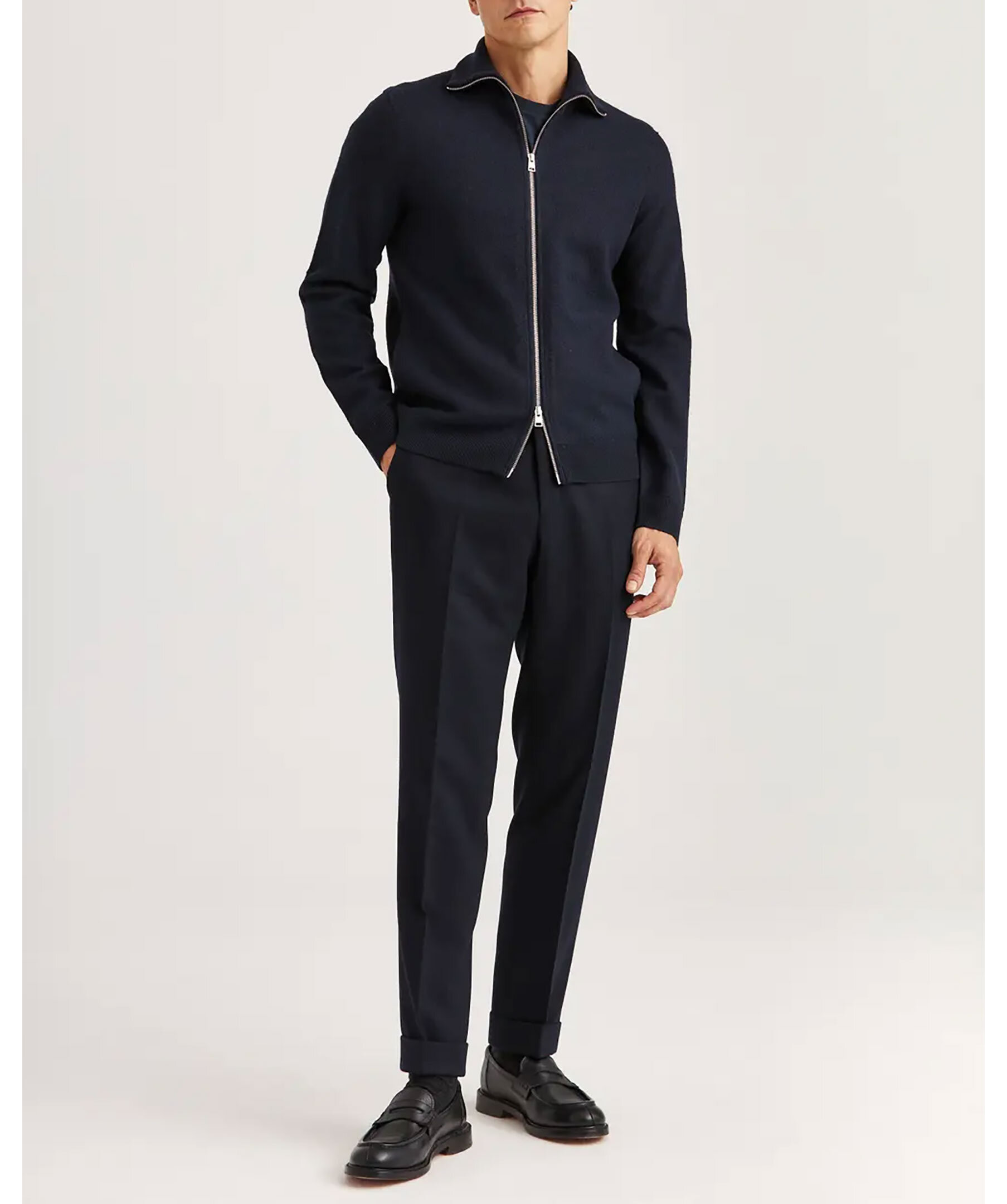 Cork Knitted Zip Jacket i färgen Navy är en zip-tröja från Morris Stockholm. Den har hel dragkedja fram, ståkrage och ribbstickade detaljer vid ärmslut, kant och krage. Tillverkad i mjuk merinoull som kombinerar värme och andningsförmåga. En elegant mellanlager-plagg som passar både under kappa och för sig själv i övergångsperioder.