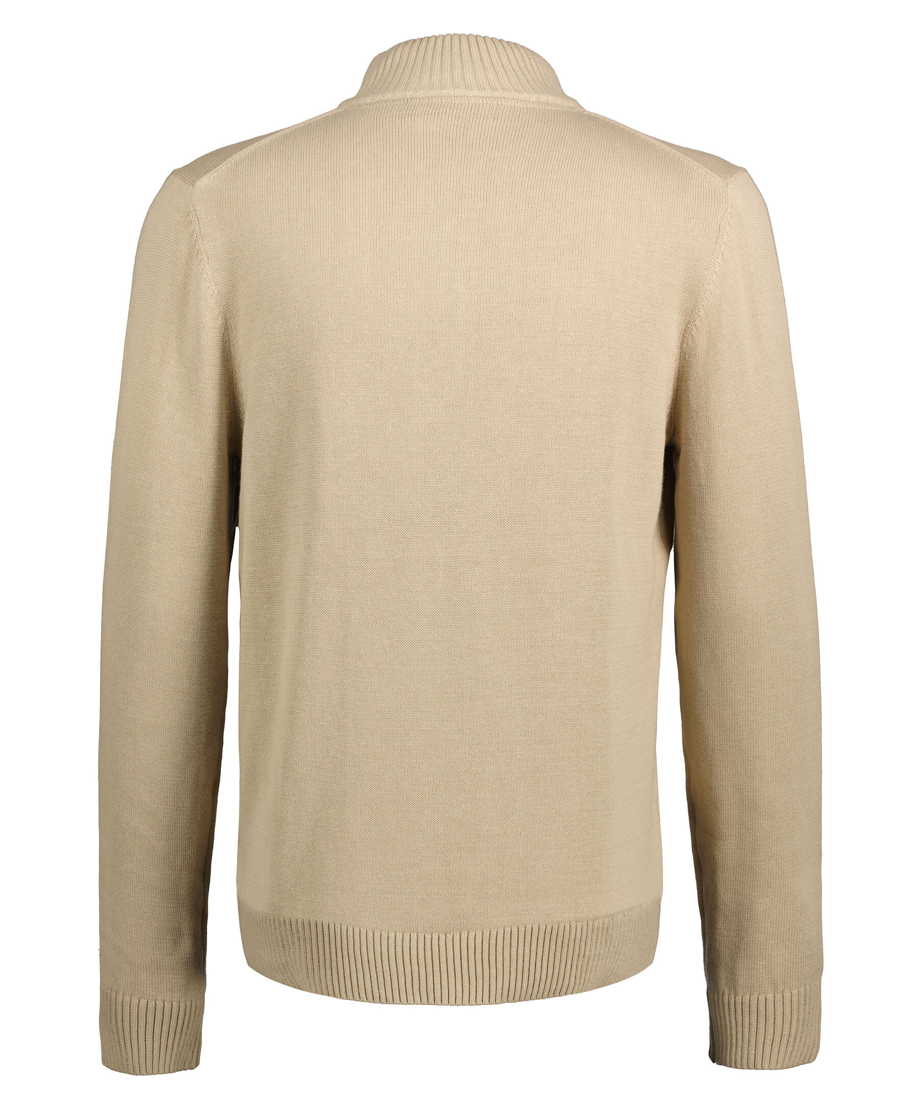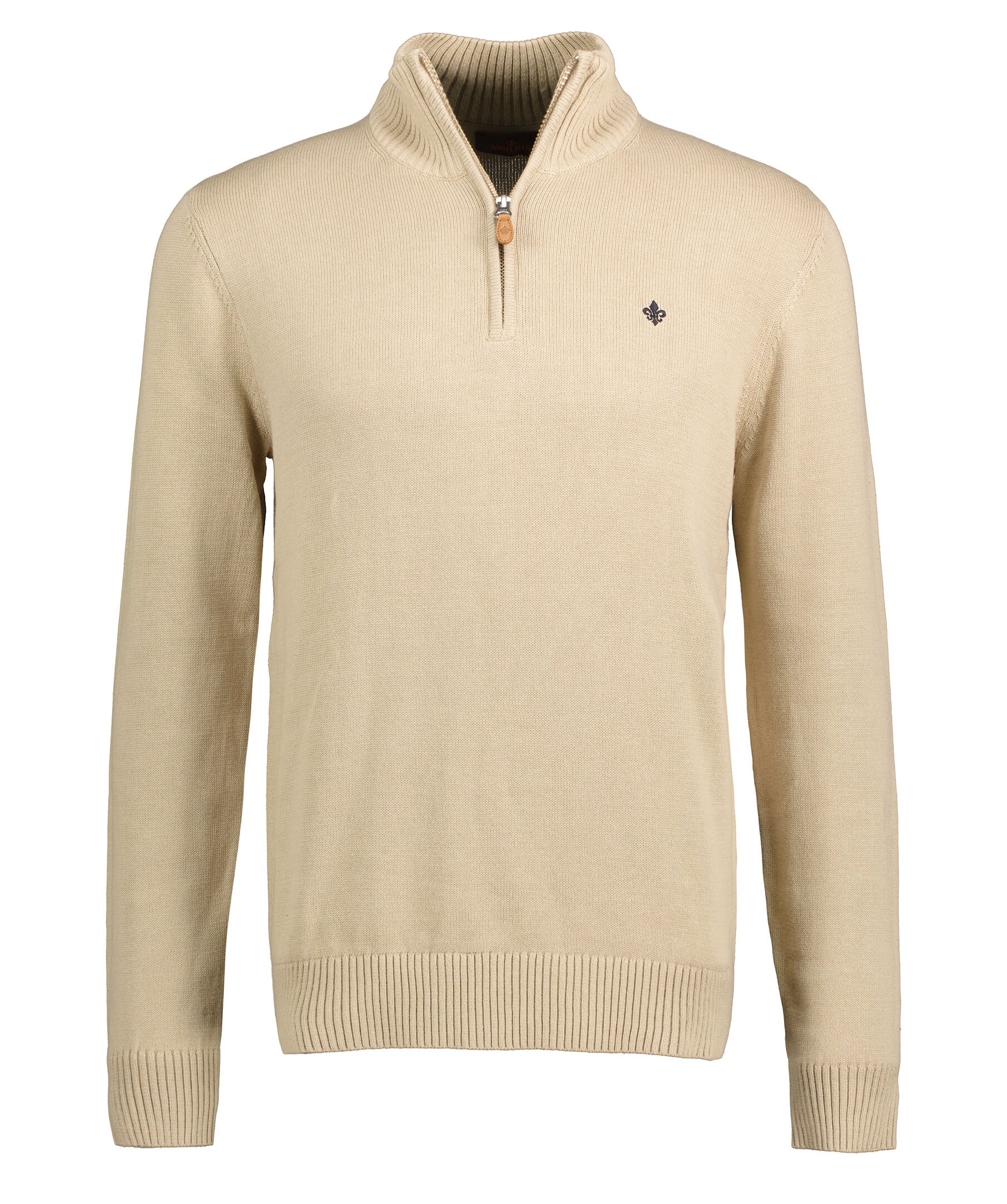 Beige stickad half-zip tröja från Morris. Tillverkad i 100% bomull. Tröjan har en hög krage med dragkedja, ribbstickade muddar vid ärm och plaggslut. Broderad lilja på bröstet.