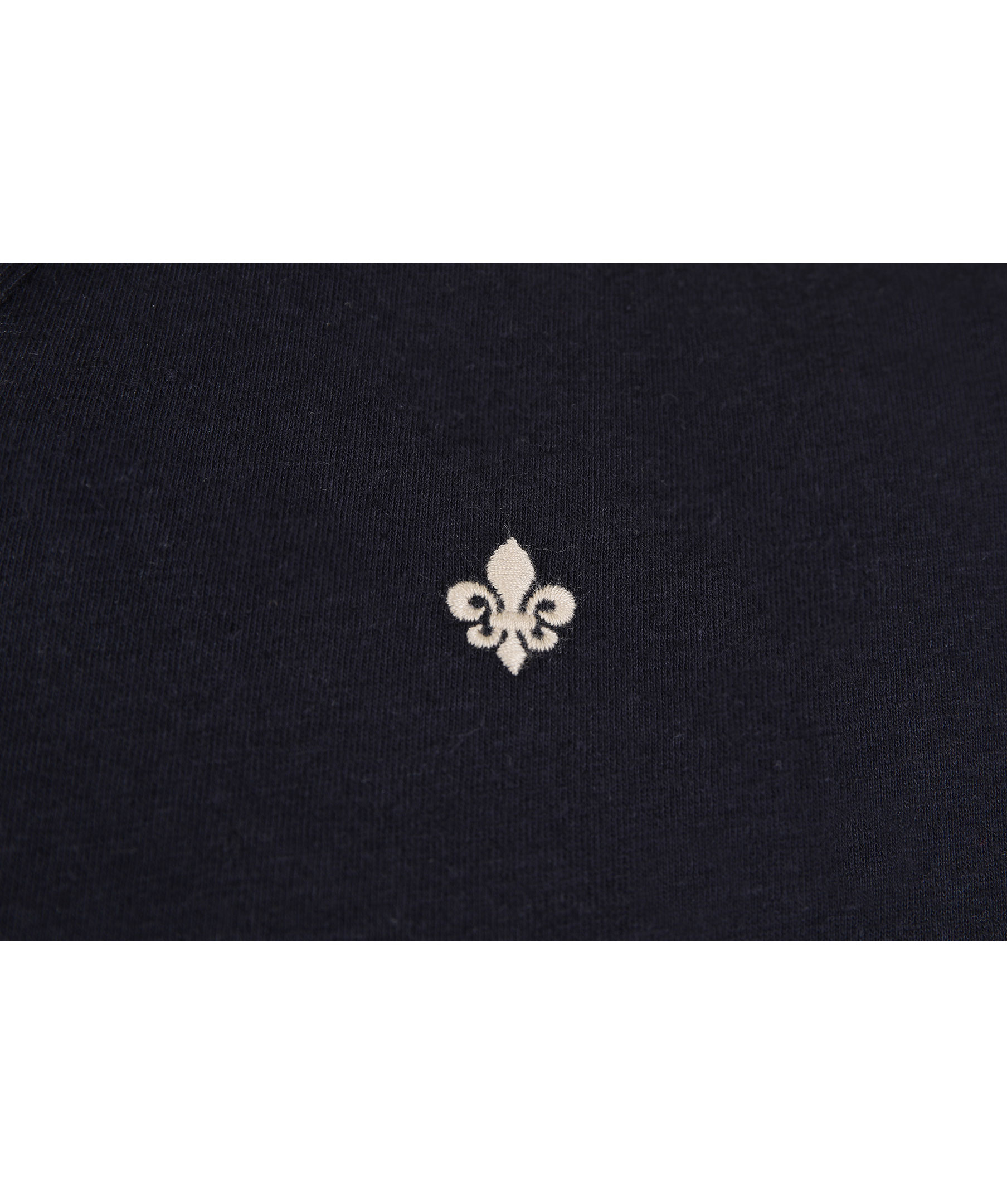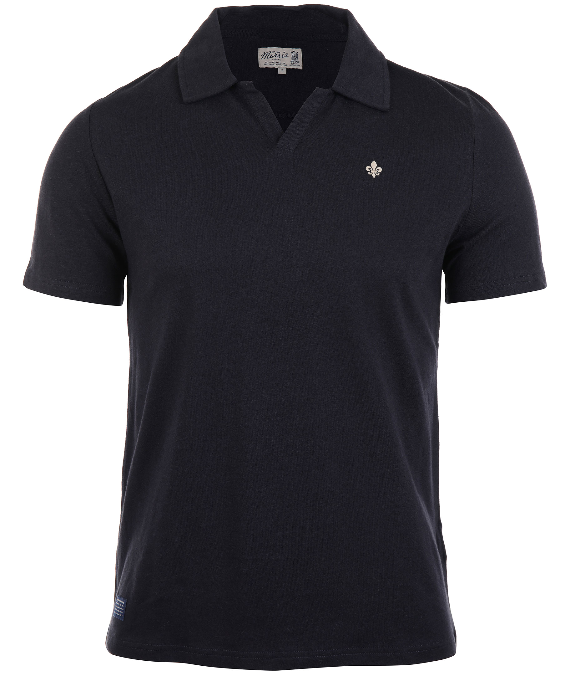 Marinblå pikétröja från Morris. Tillverkad i bomull och linnemix. V-ringning, broderad logga på bröstet.