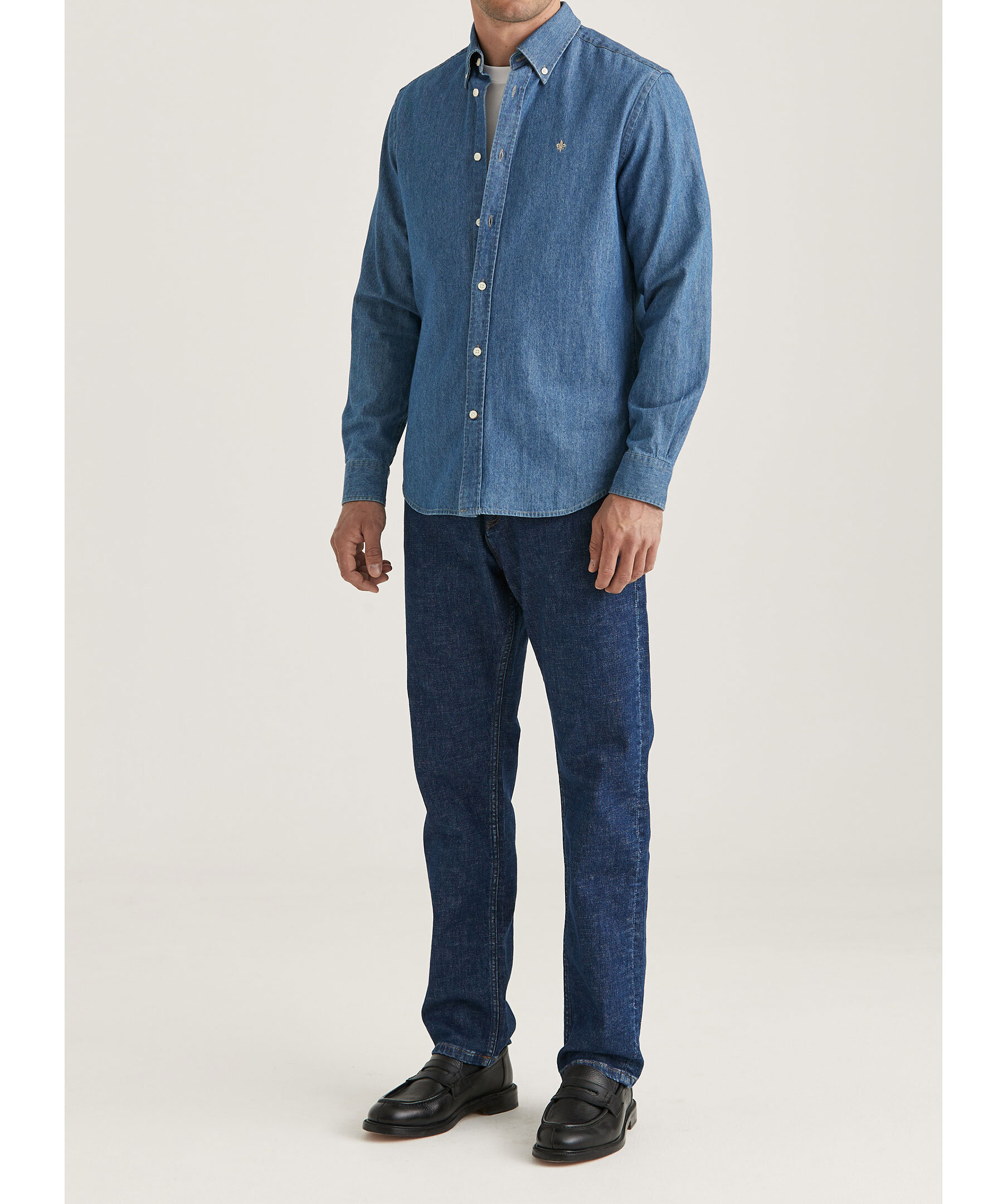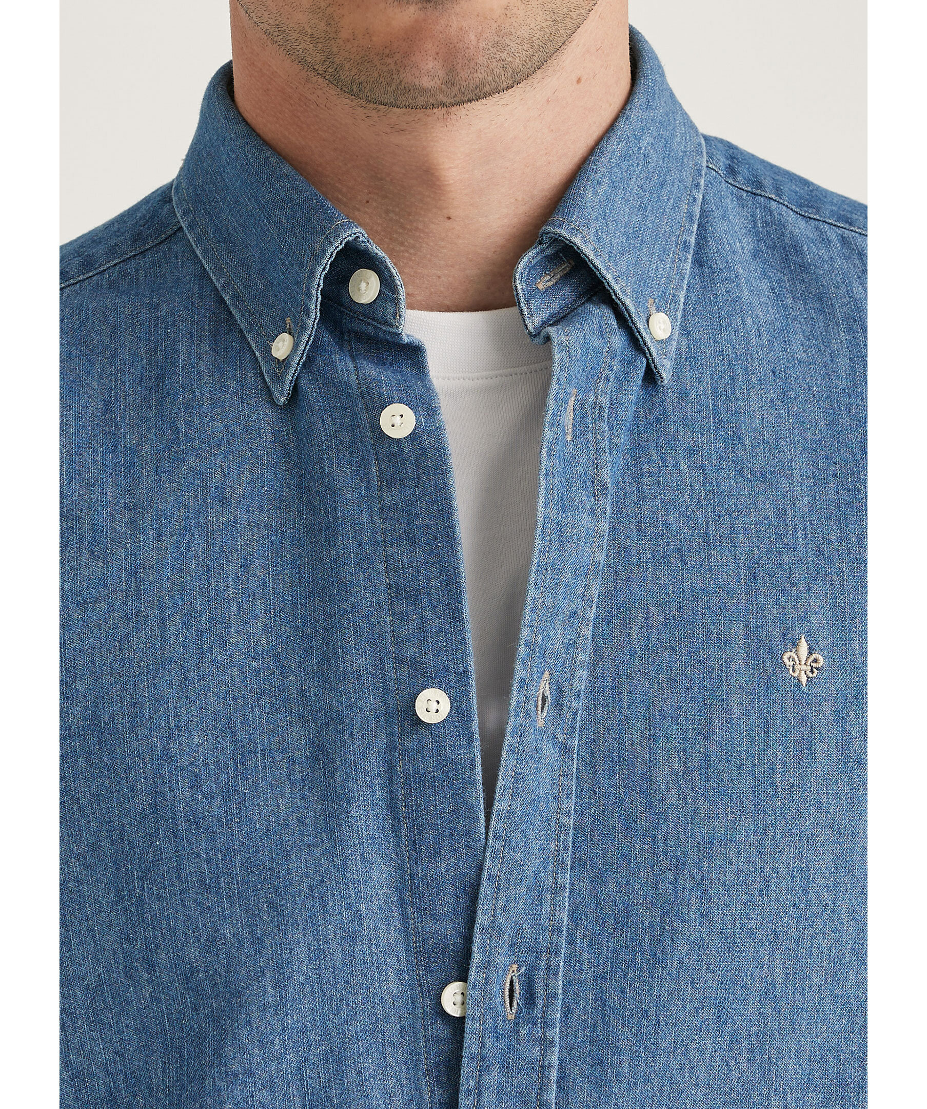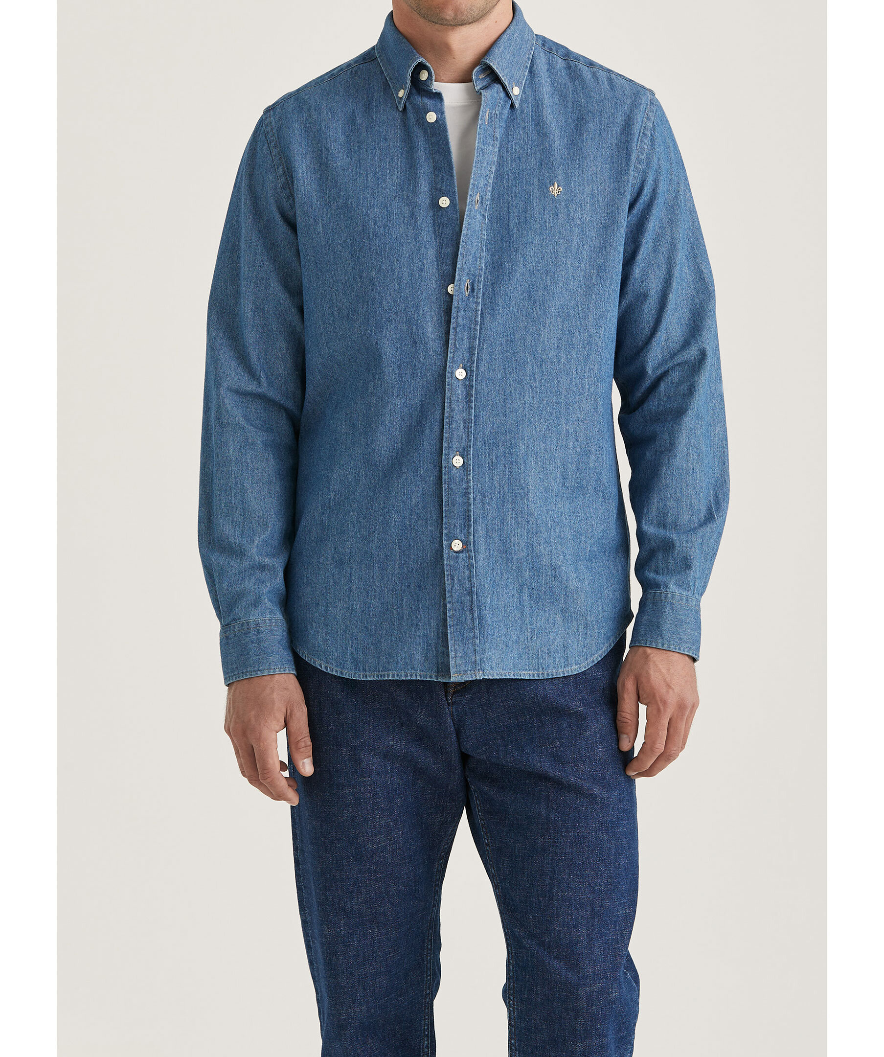 Blå denimskjorta från Morris. Skjortan har button-down krage, enkel manchett med två knappar samt broderad signaturlilja på bröstet. Tillverkad i bomull.