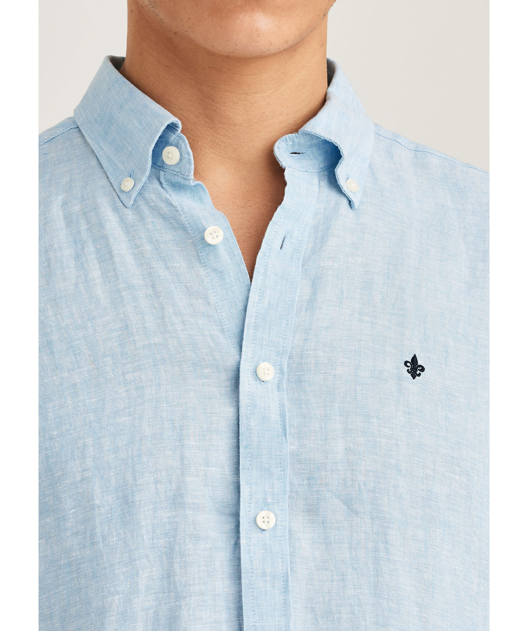 Ljusblå, kortärmad linneskjorta från Morris. Skjortan har button down krage och broderad lilja på bröstet. Tillverkad i linne.