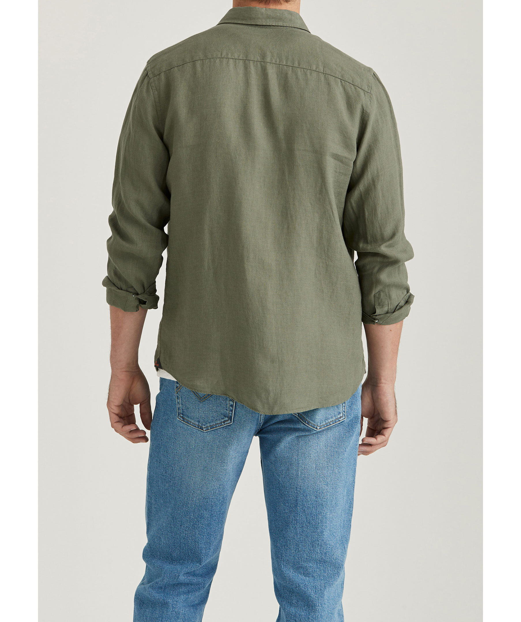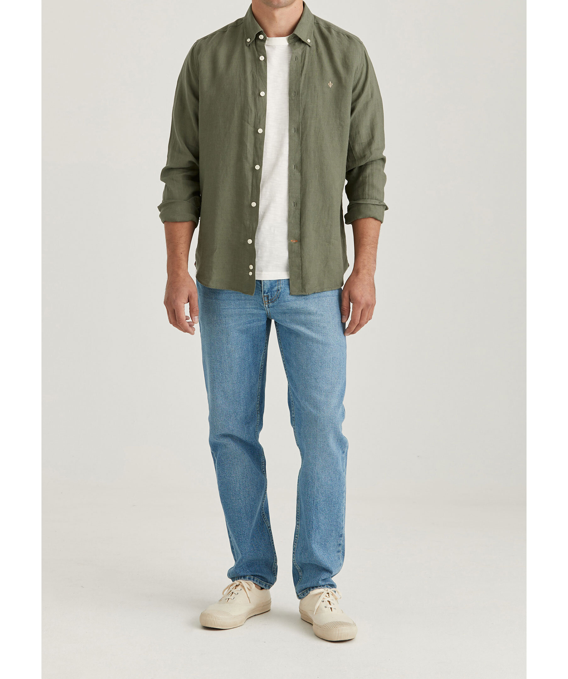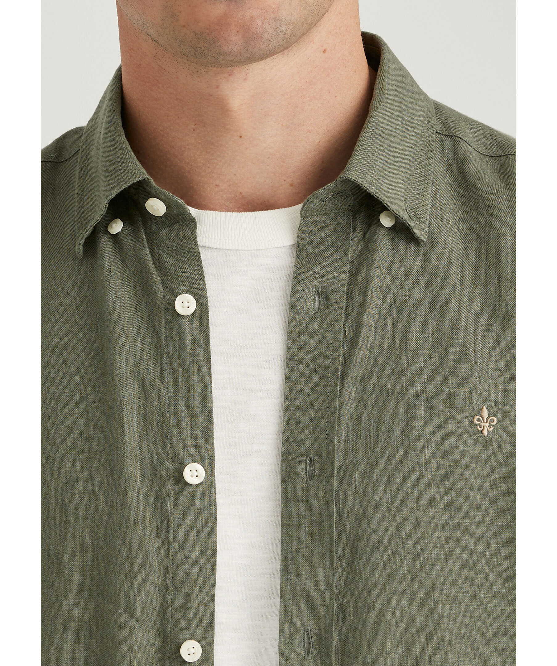 Olivgrön långärmad linneskjorta från Morris. Skjortan är gjord i 100% linne och har en button-down krage, enkel rundad manschett som regleras med två knappar samt en broderad lilja på bröstet.