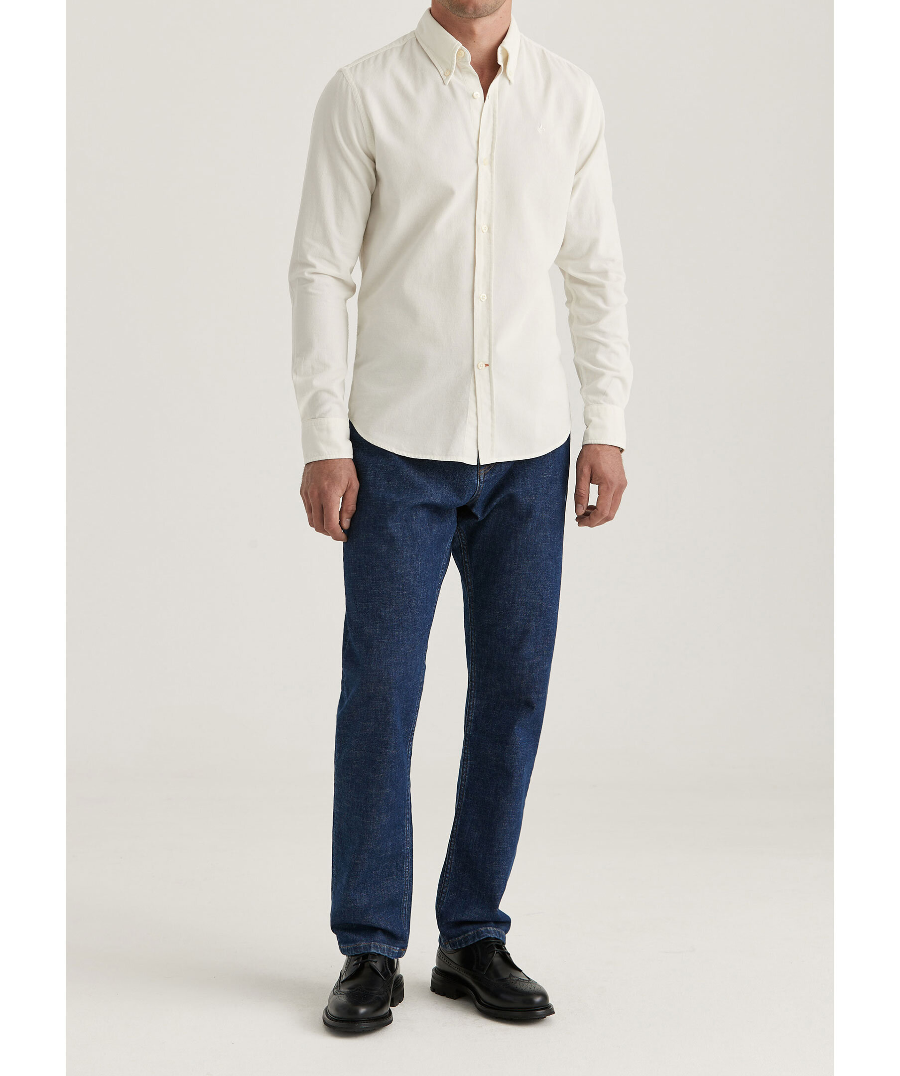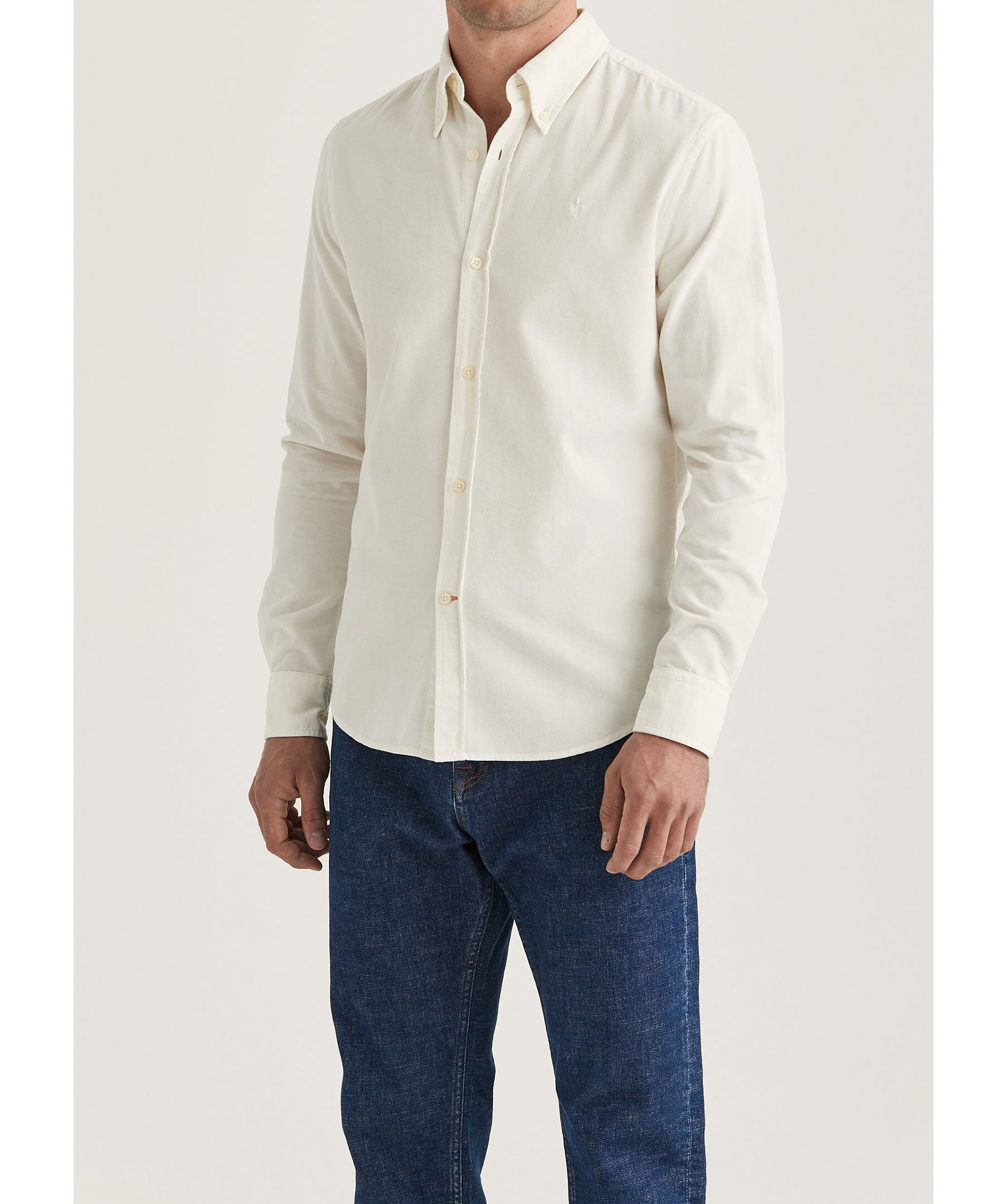 Benvit manchesterskjorta från Morris. Skjortan har button-down krage, enkel manschett lätt rundad med två knappar samt Morris signaturlilja broderad på vänster bröst. Tillverkad i bomull.