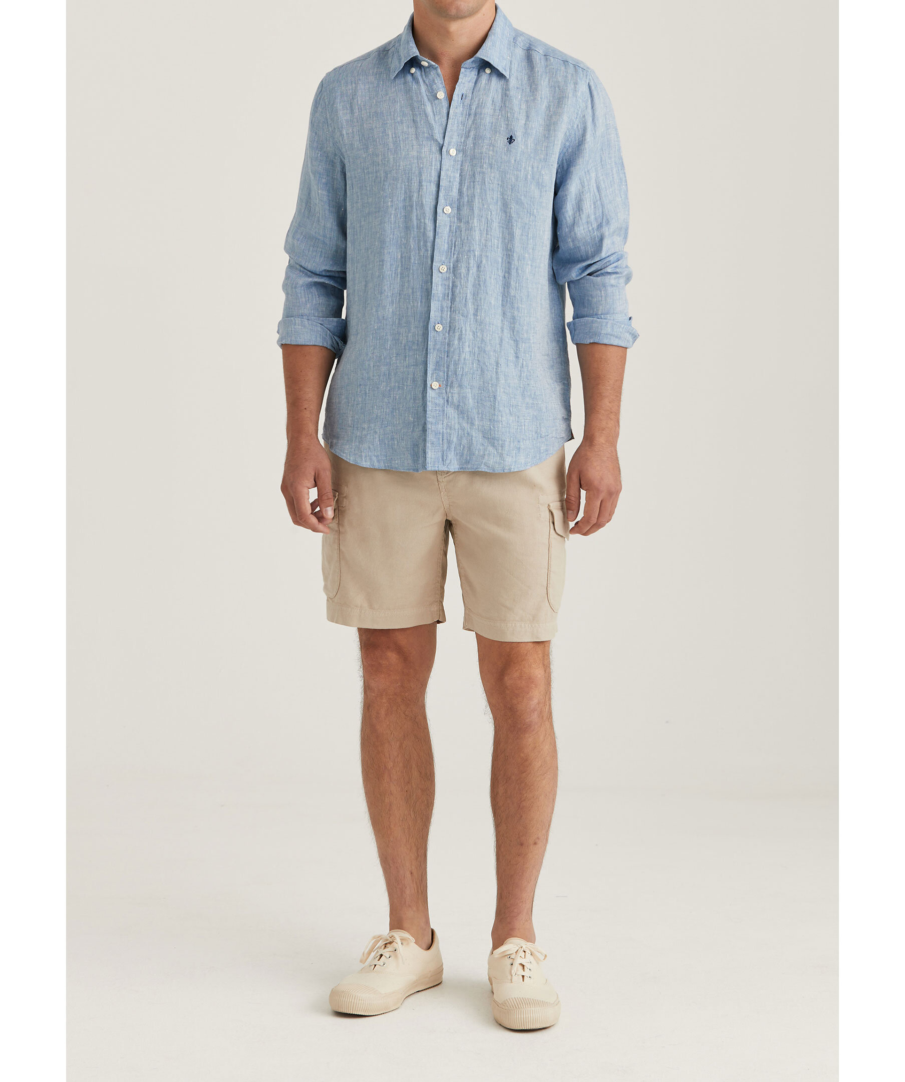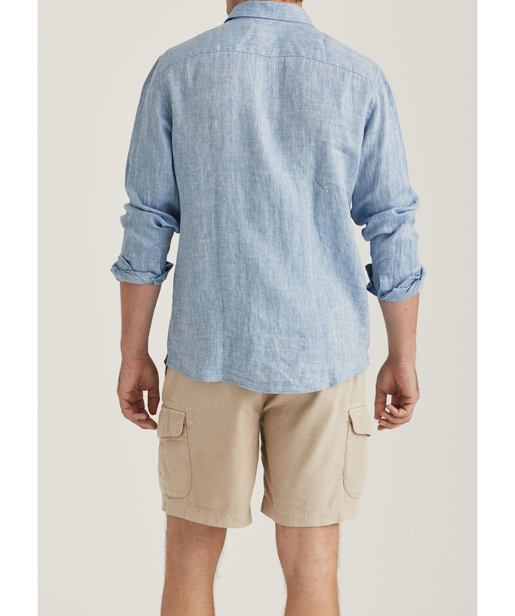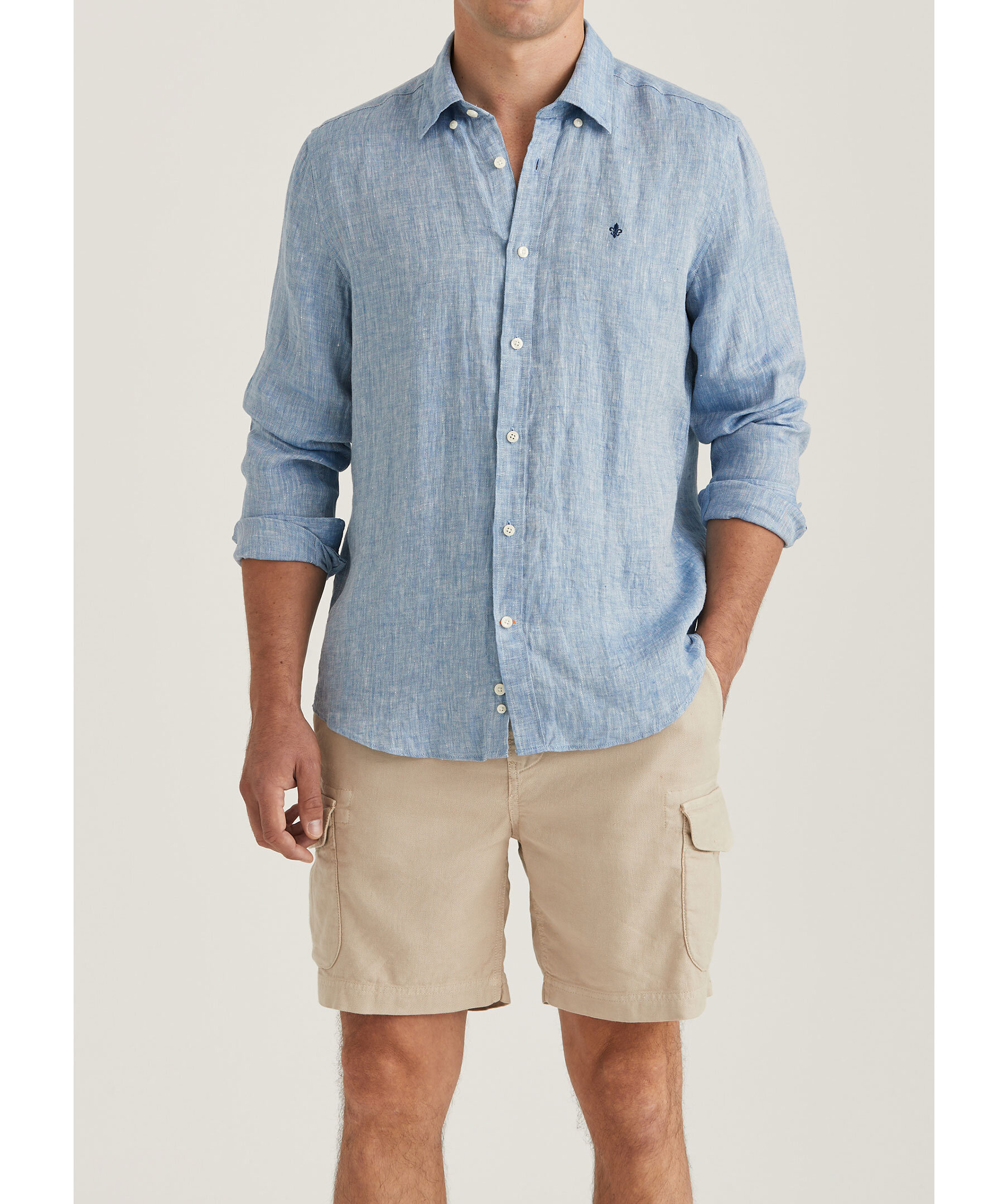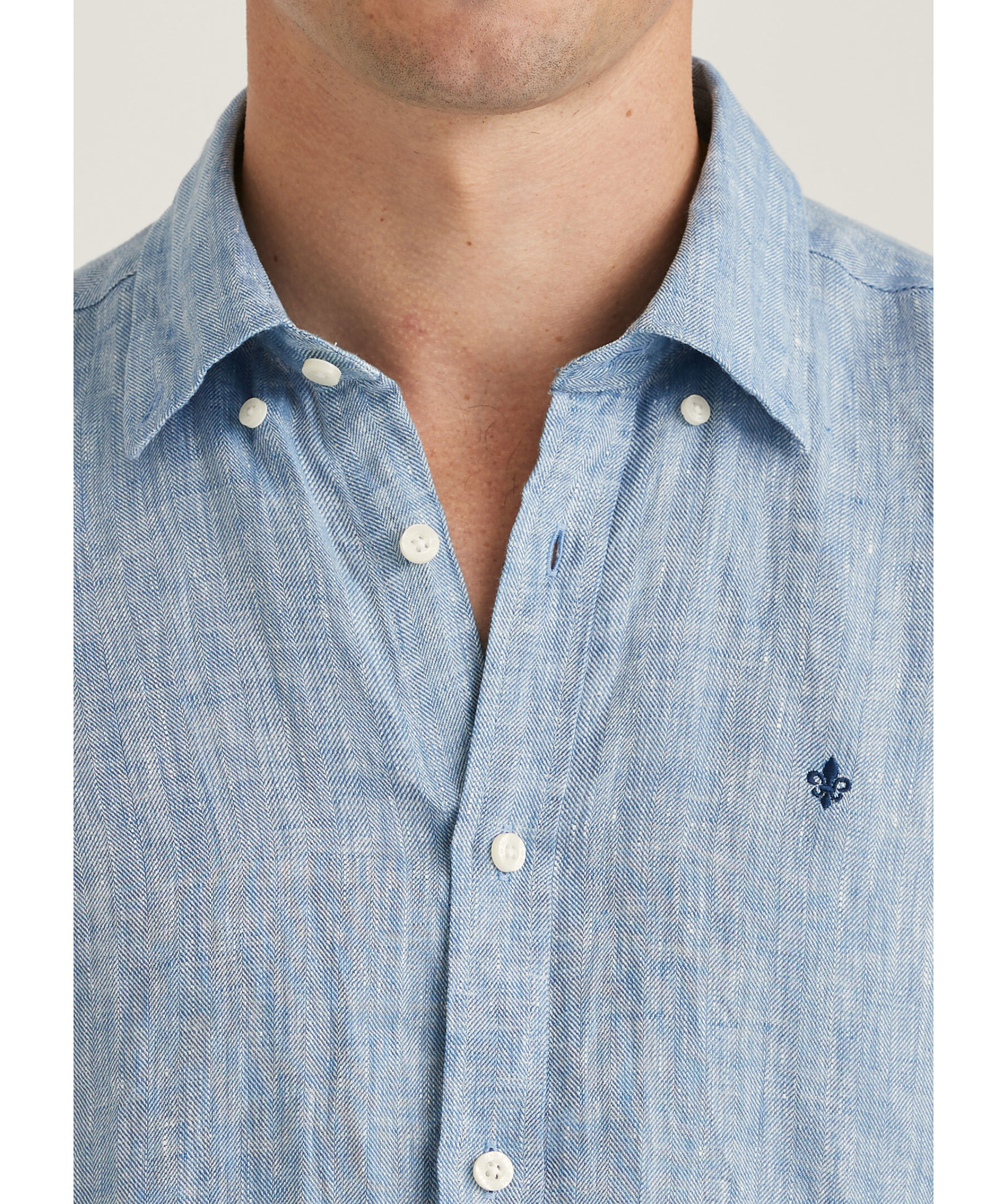 Blå linneskjorta från Morris. Button down krage, enkel manschett lätt rundad med två knappar. Morris signaturlilja broderad på vänster bröst. Tillverkade i 100% linne. Normal passform.