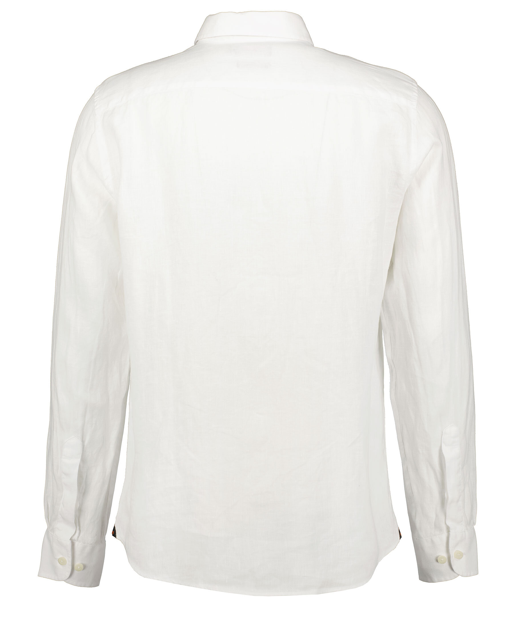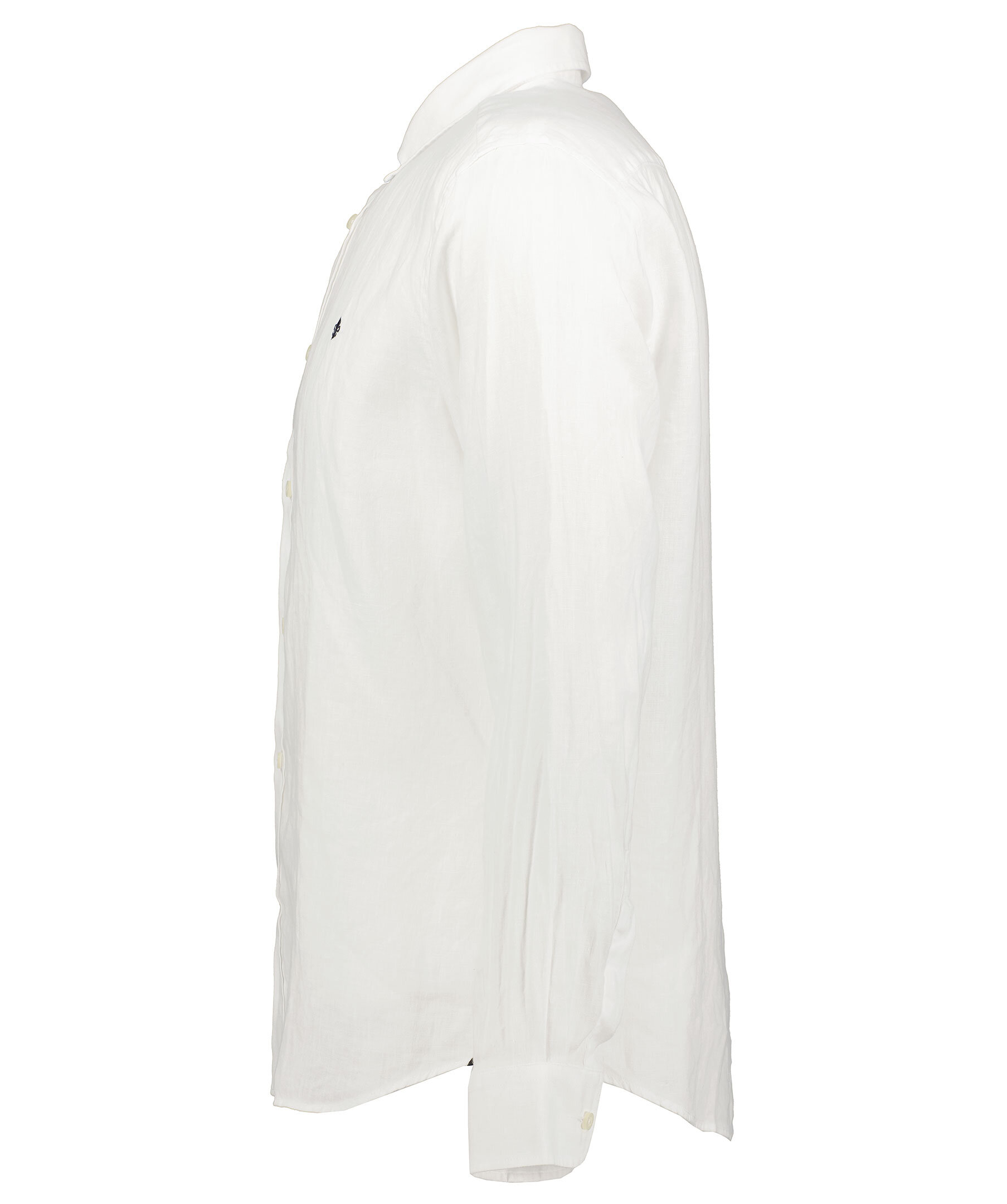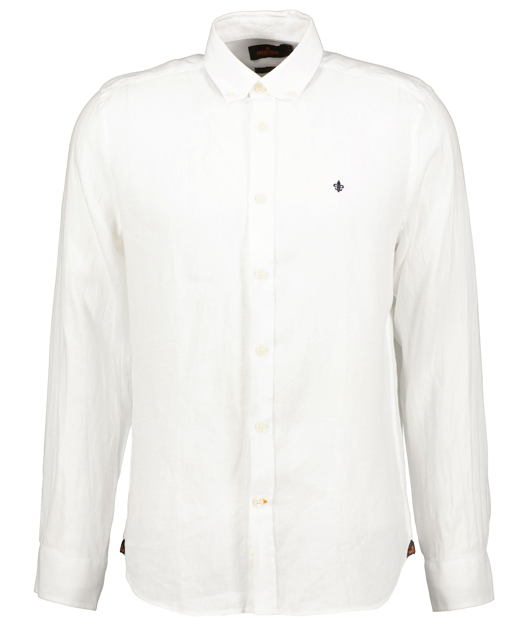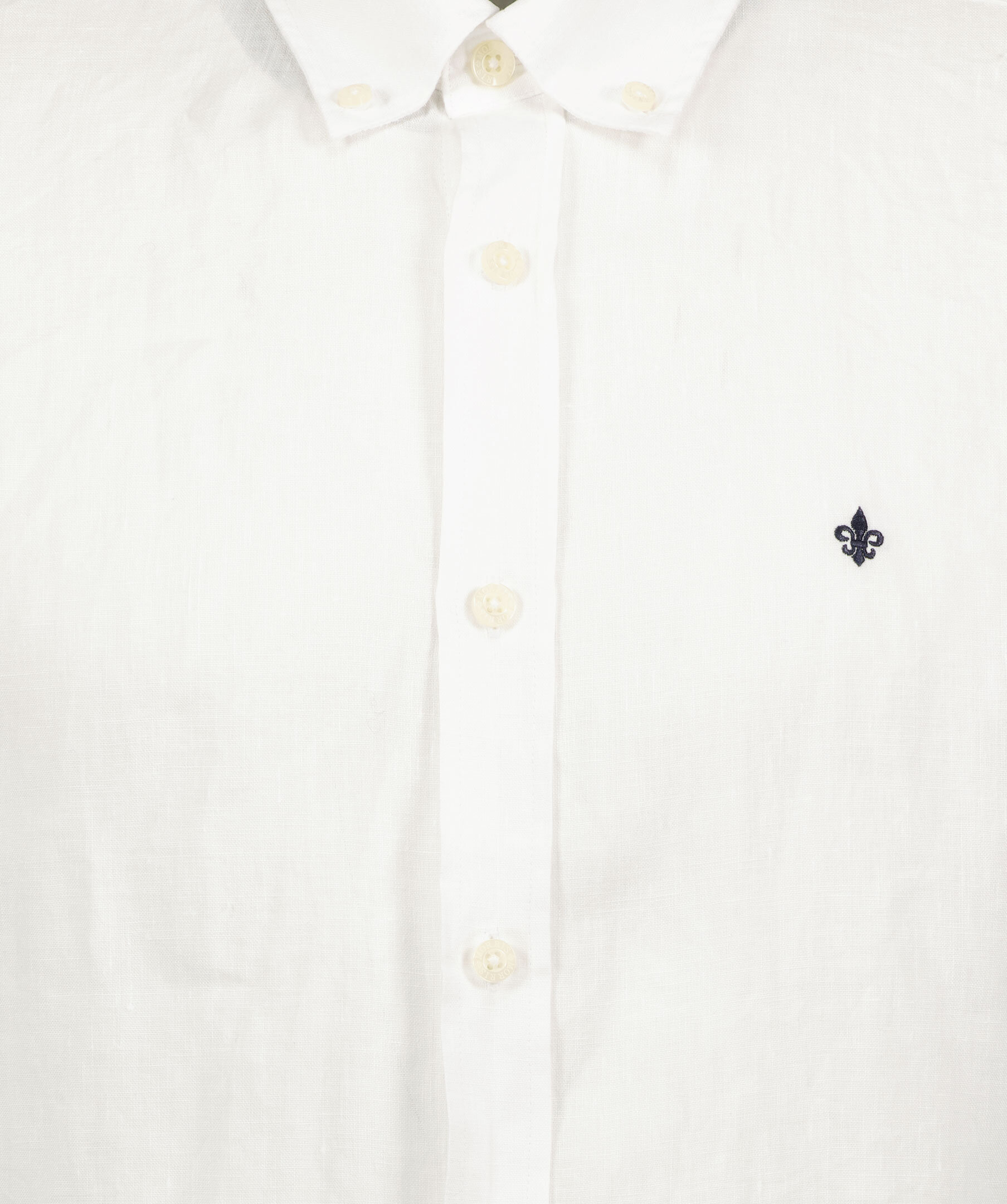 Vit linneskjorta från Morris. Stängs framtill med knappar. Button down-krage. Broderad lilja på vänster bröst. Enkla manschetter.
