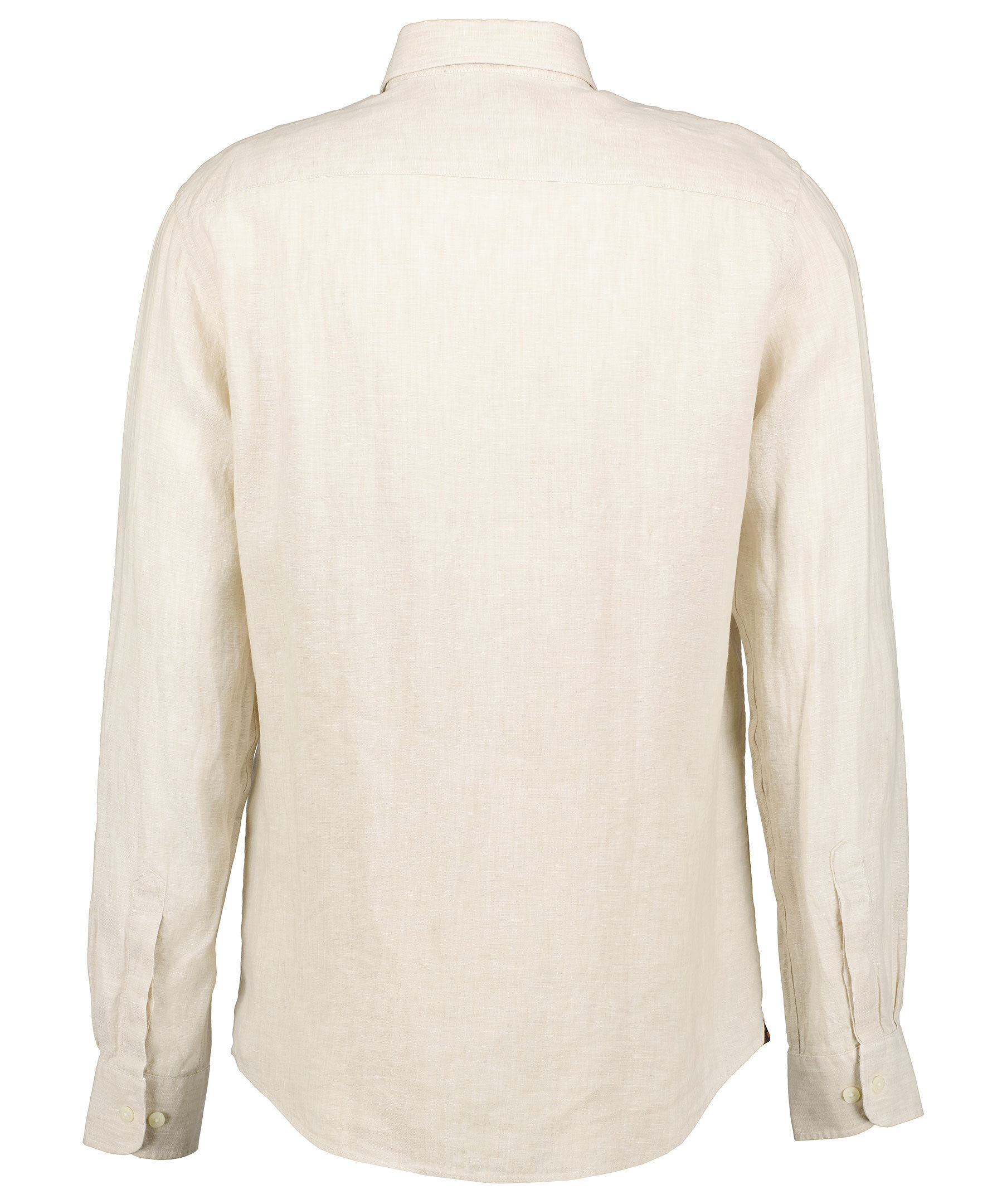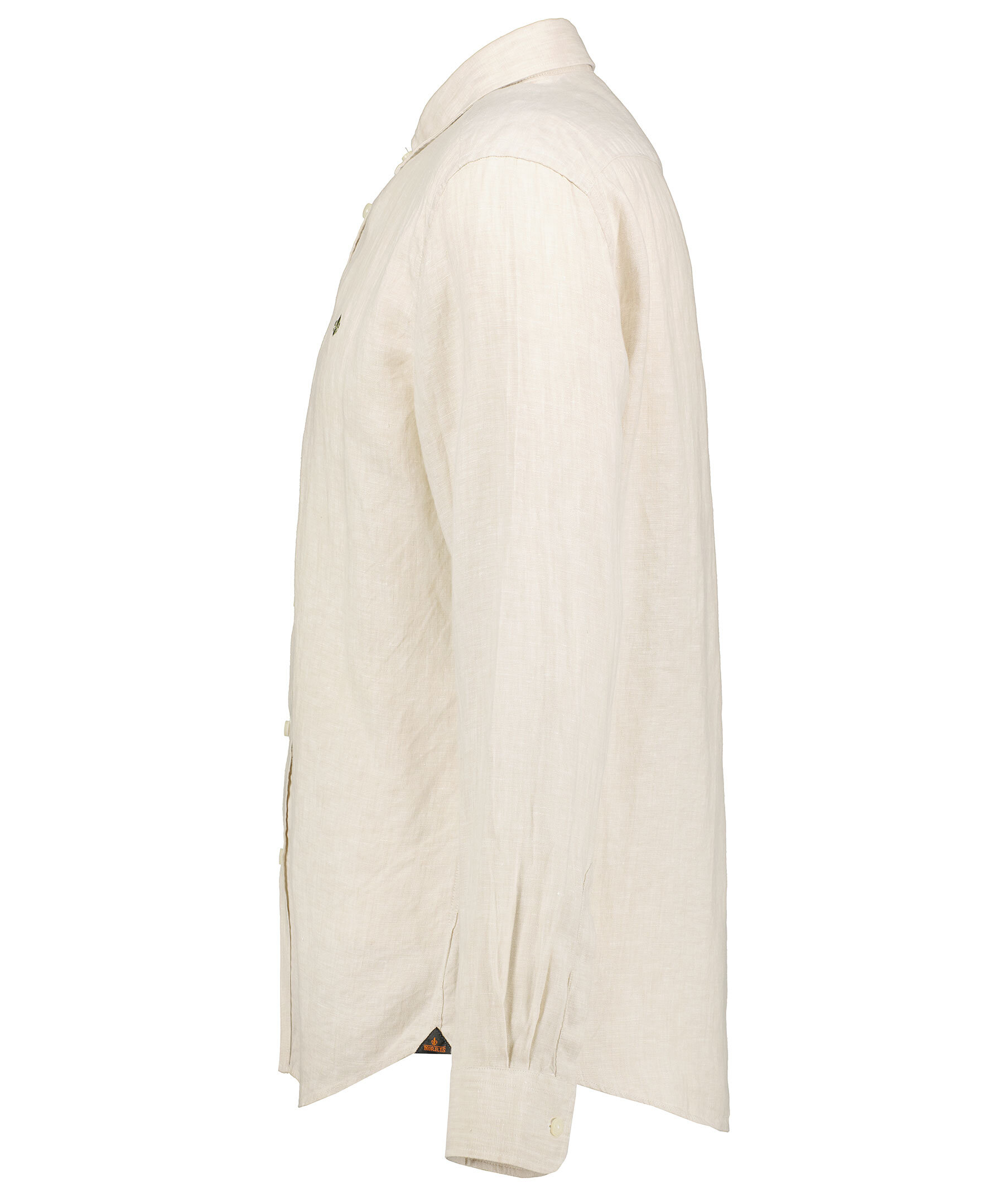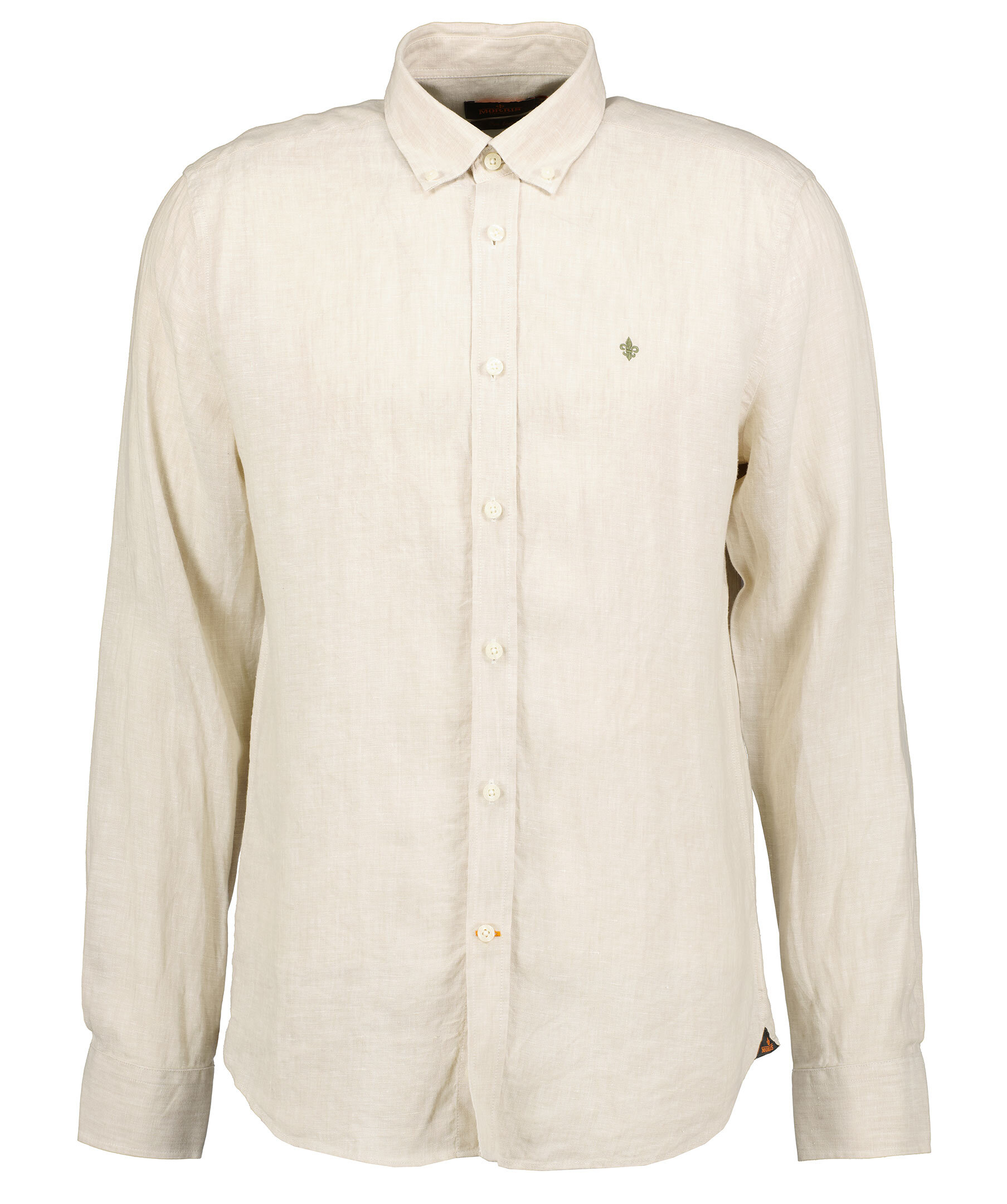 Beige linneskjorta från Morris. Stängs framtill med knappar. Button down-krage. Broderad lilja på vänster bröst. Enkla manschetter.