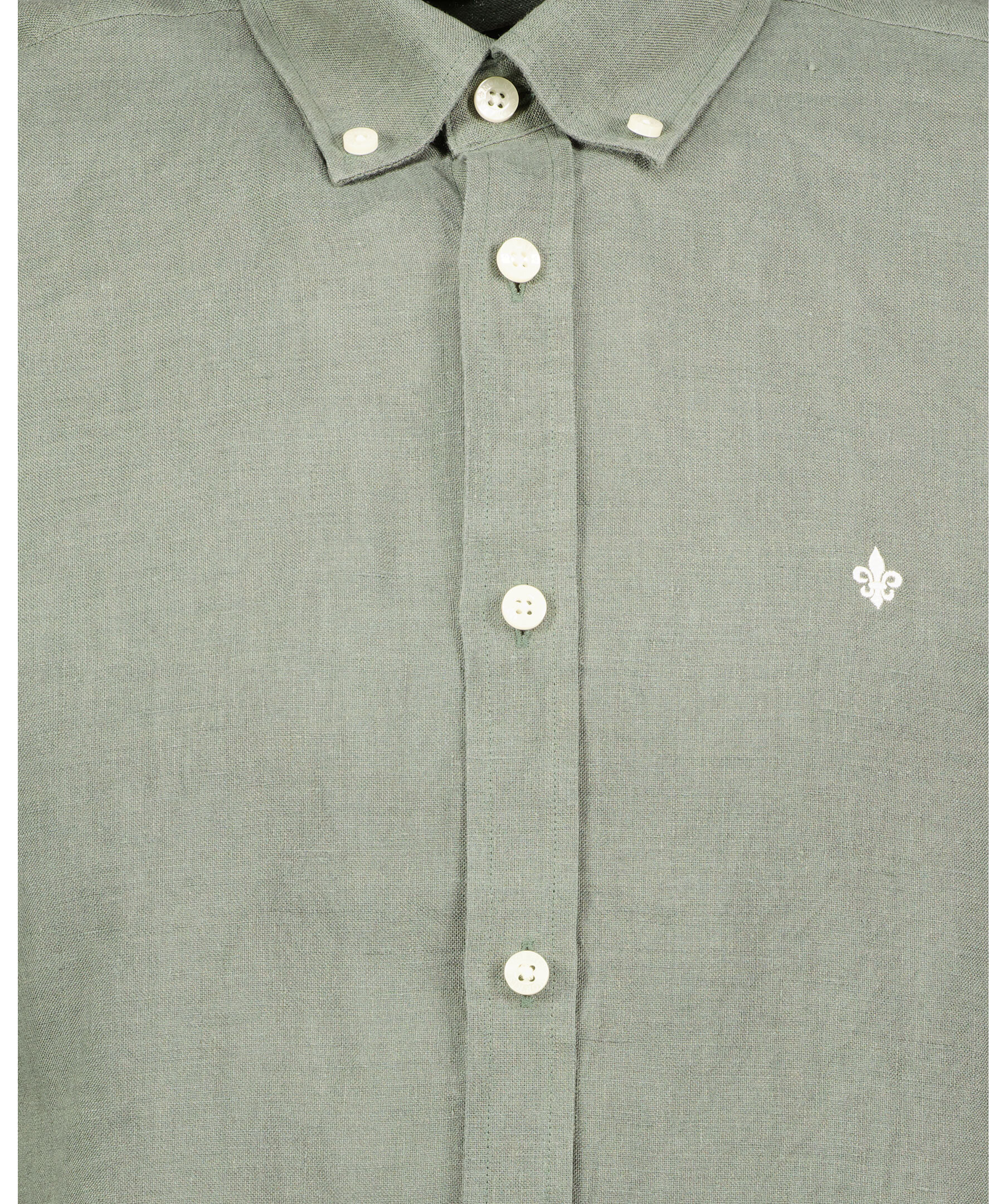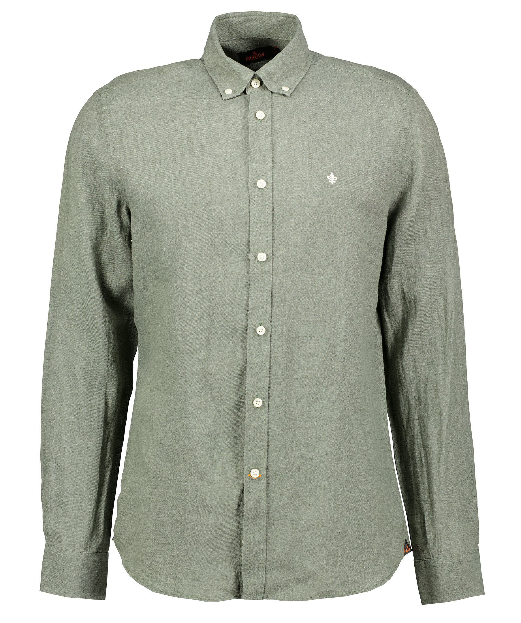 Mörkgrön Linne skjorta från Morris. Stängs framtill med knappar. Button down krage. Broderad lilja på vänster bröst. Enkla manschetter.