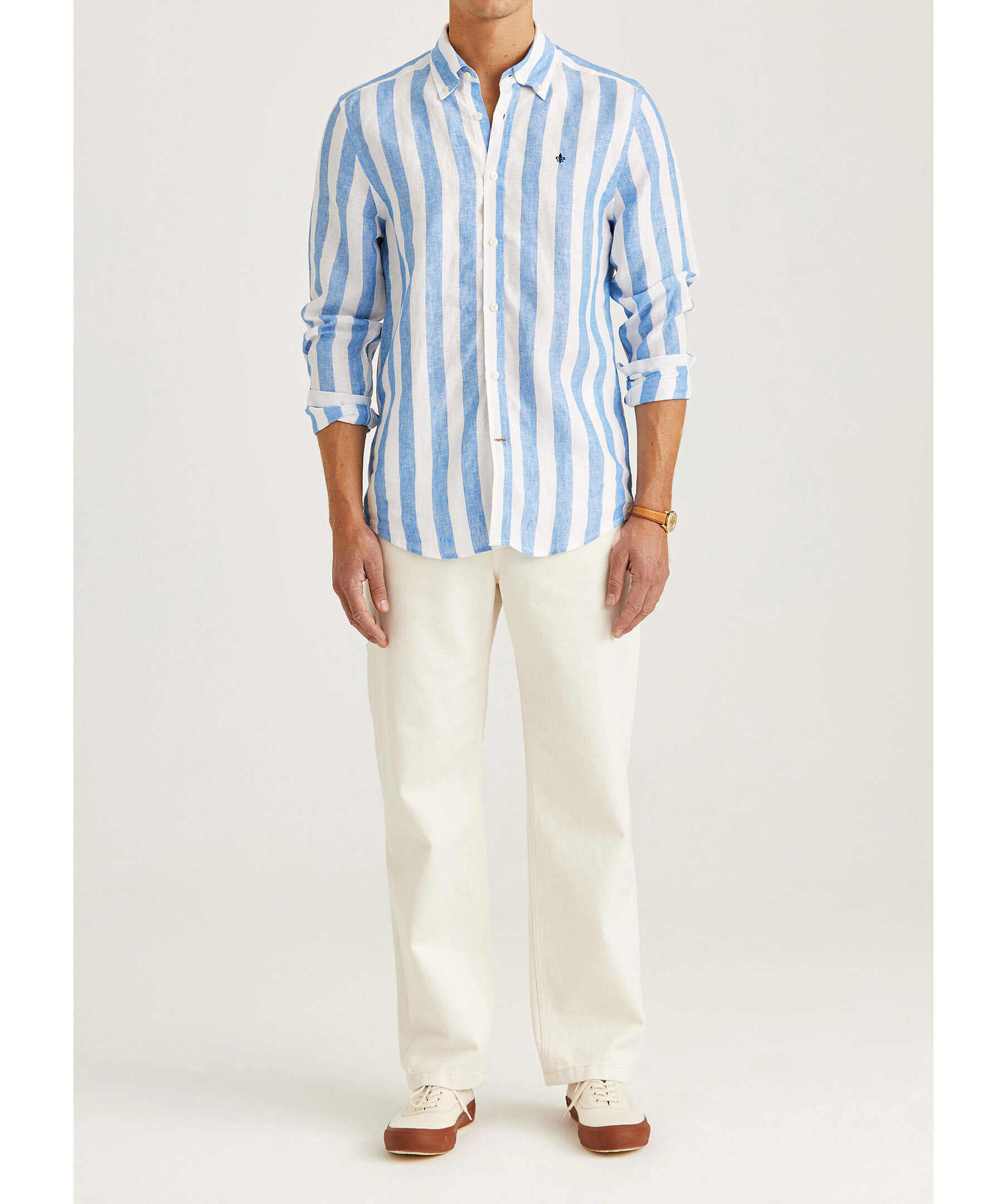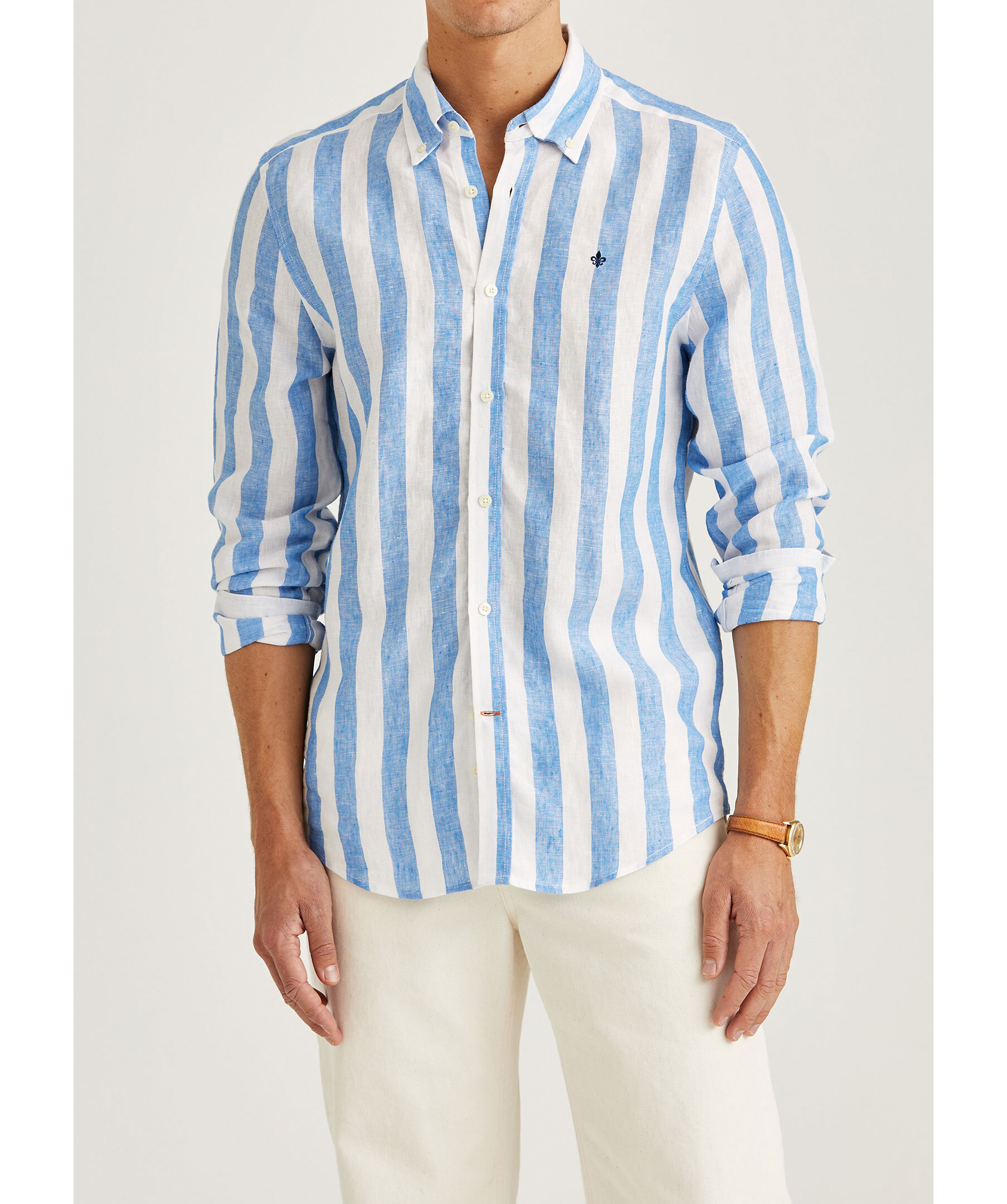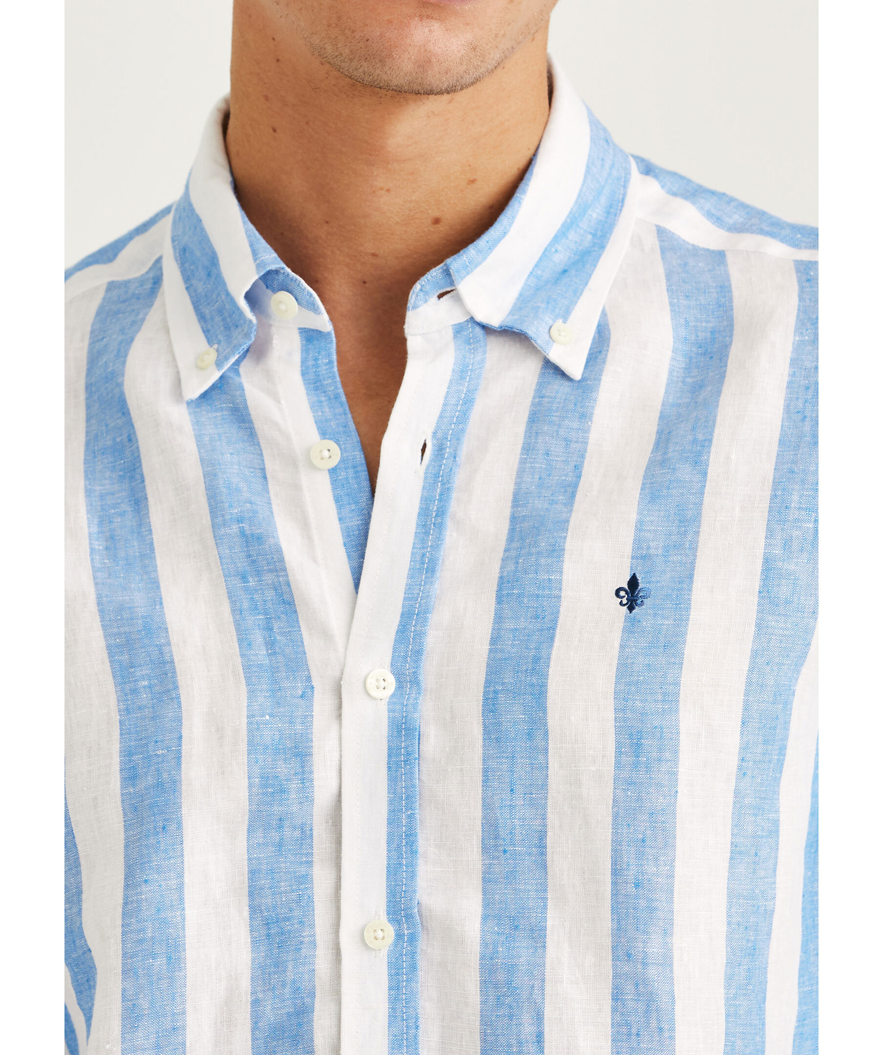 Blå, randig skjorta från Morris. Skjortan har button-down krage och broderad logotyp på bröstet. Tillverkad i 100% linne.