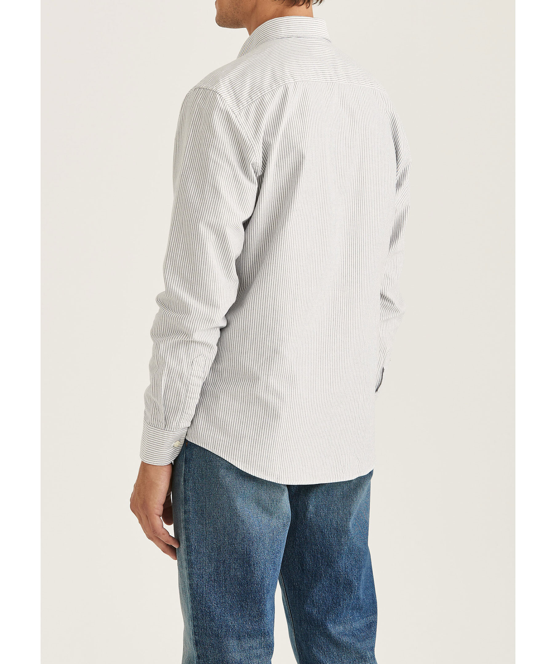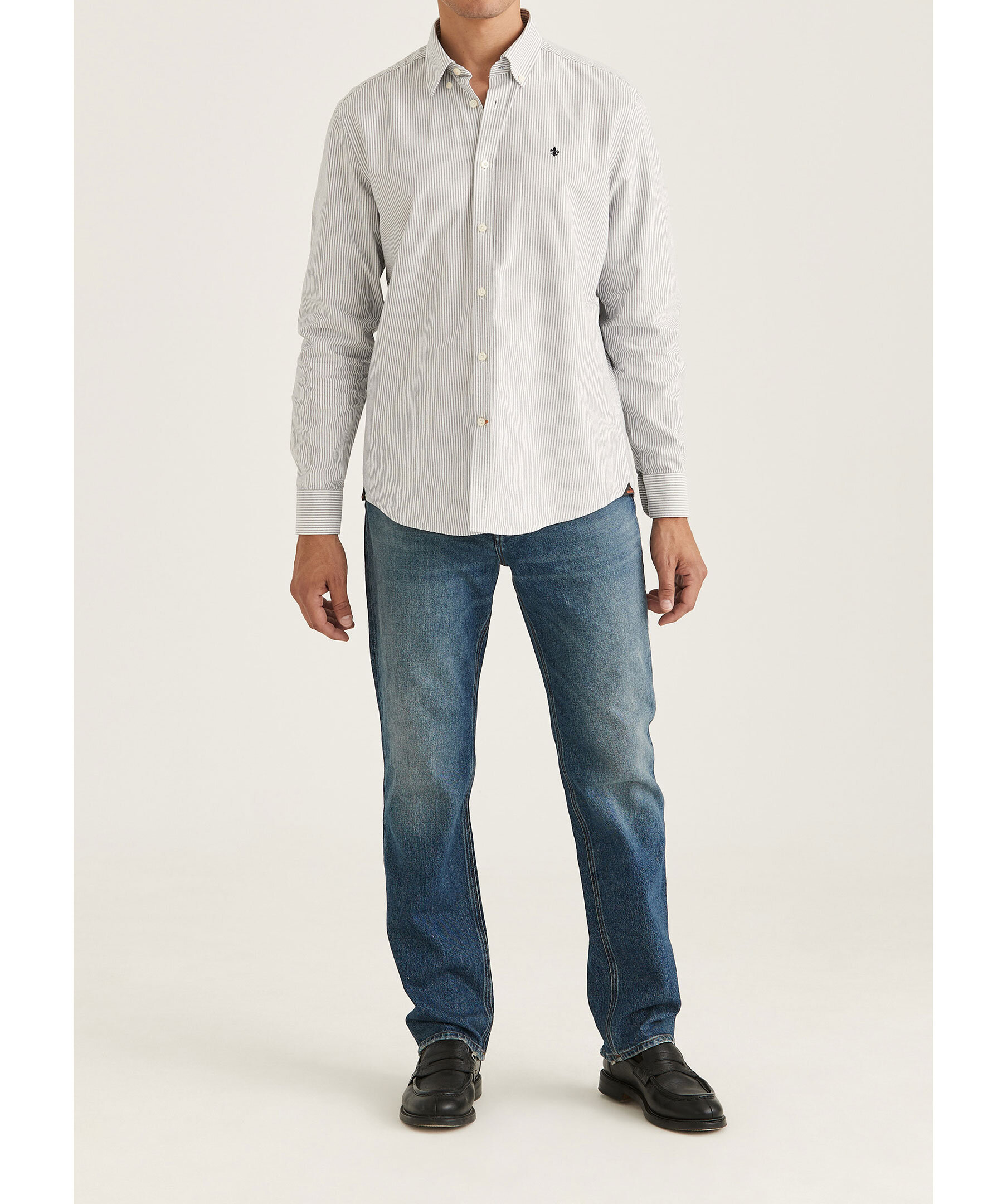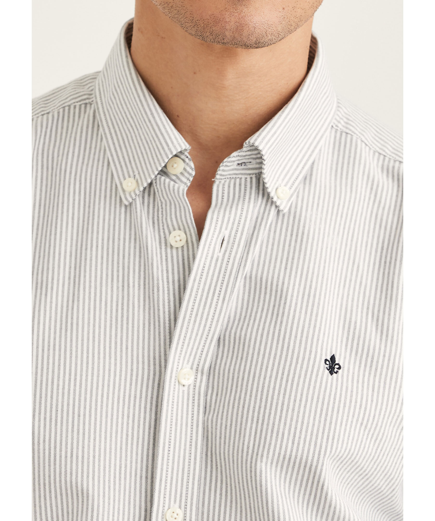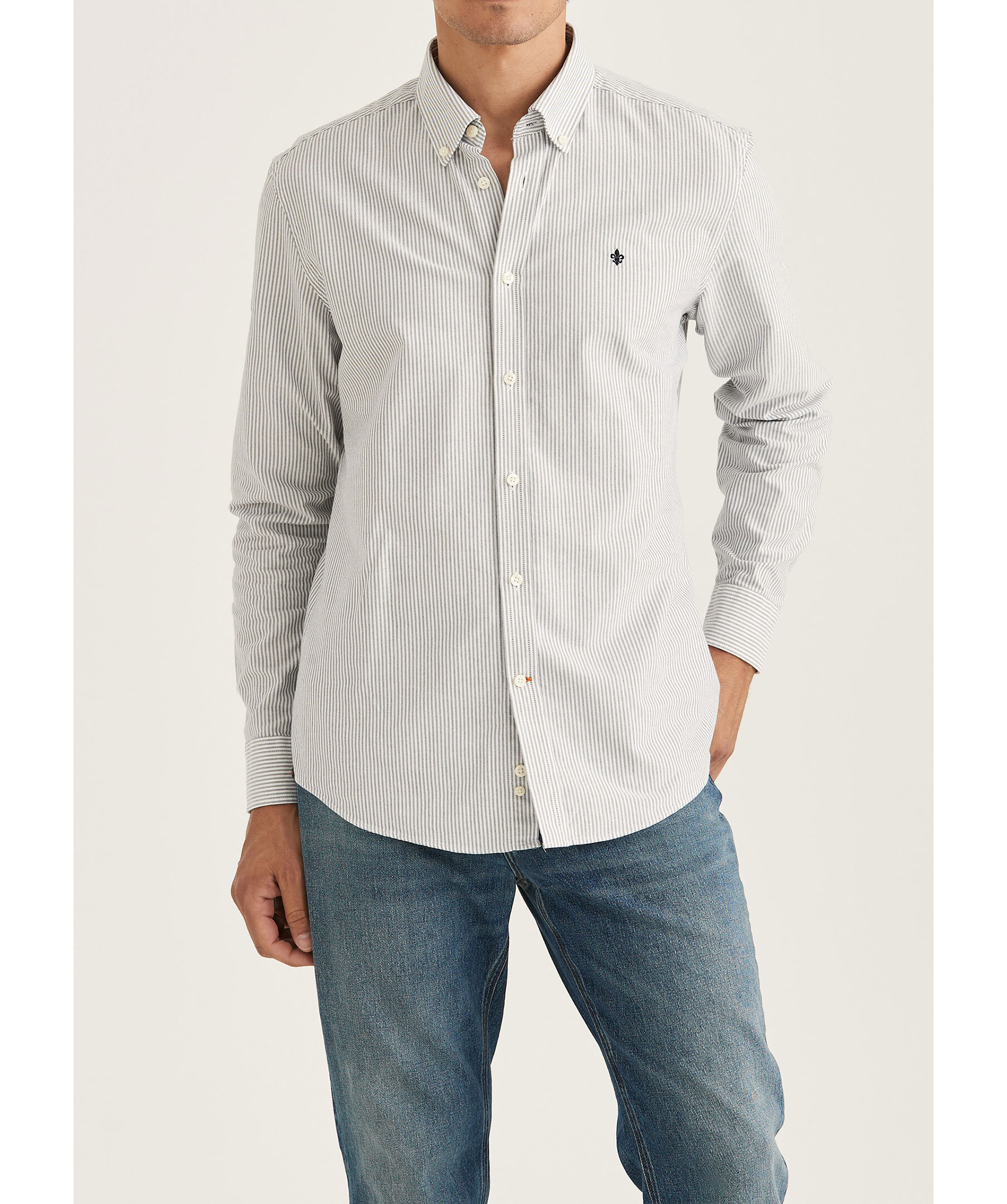 Blå och vit randig oxfordskjorta från Morris. Skjortan har button down krage, signaturlilja broderad på vänster bröst samt enkel manschett lätt rundad med två knappar. Tillverkad i 100% bomull.