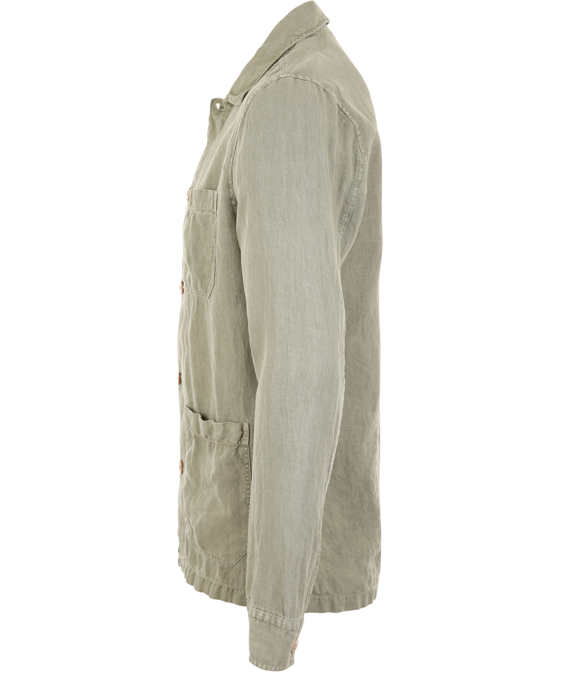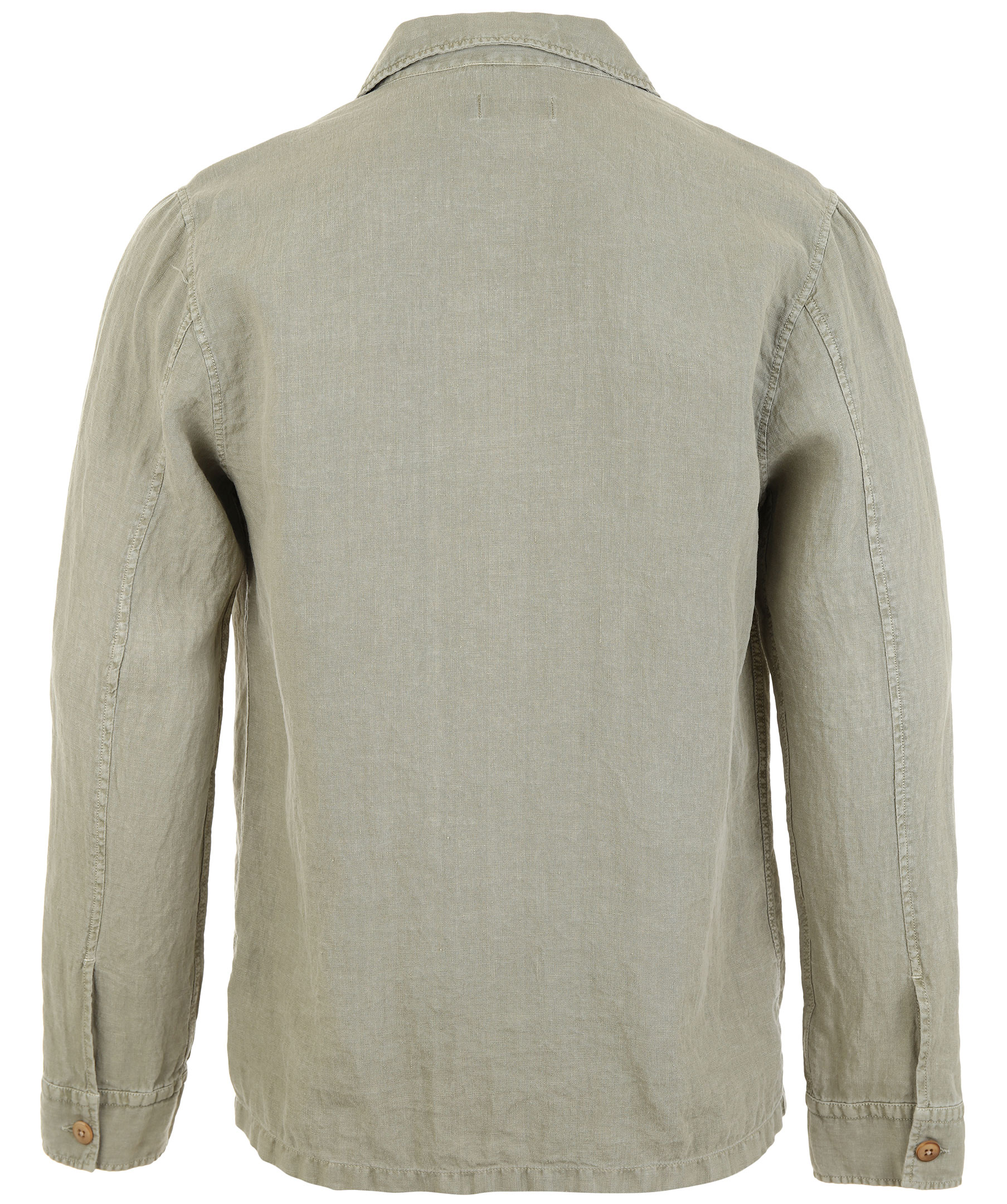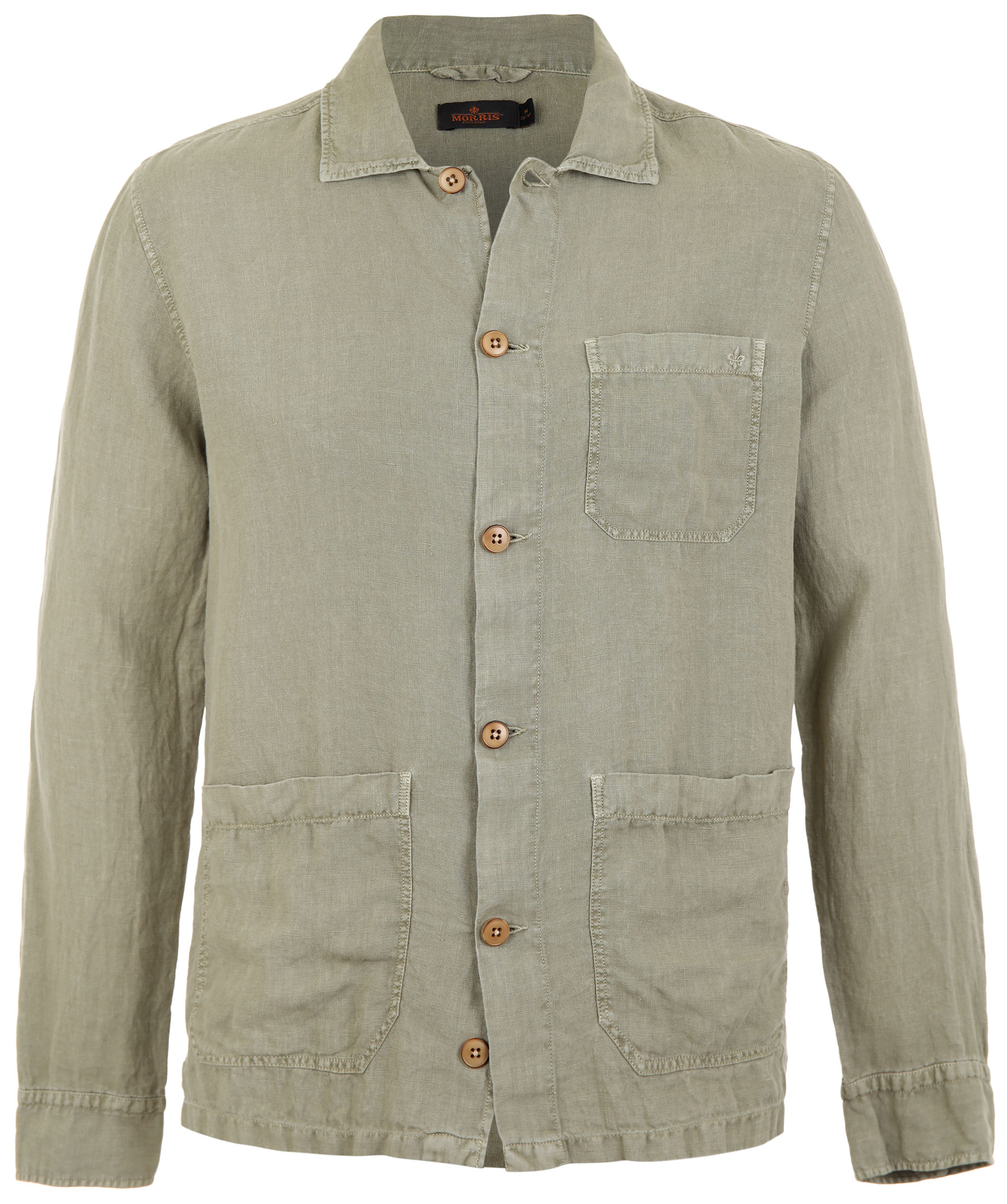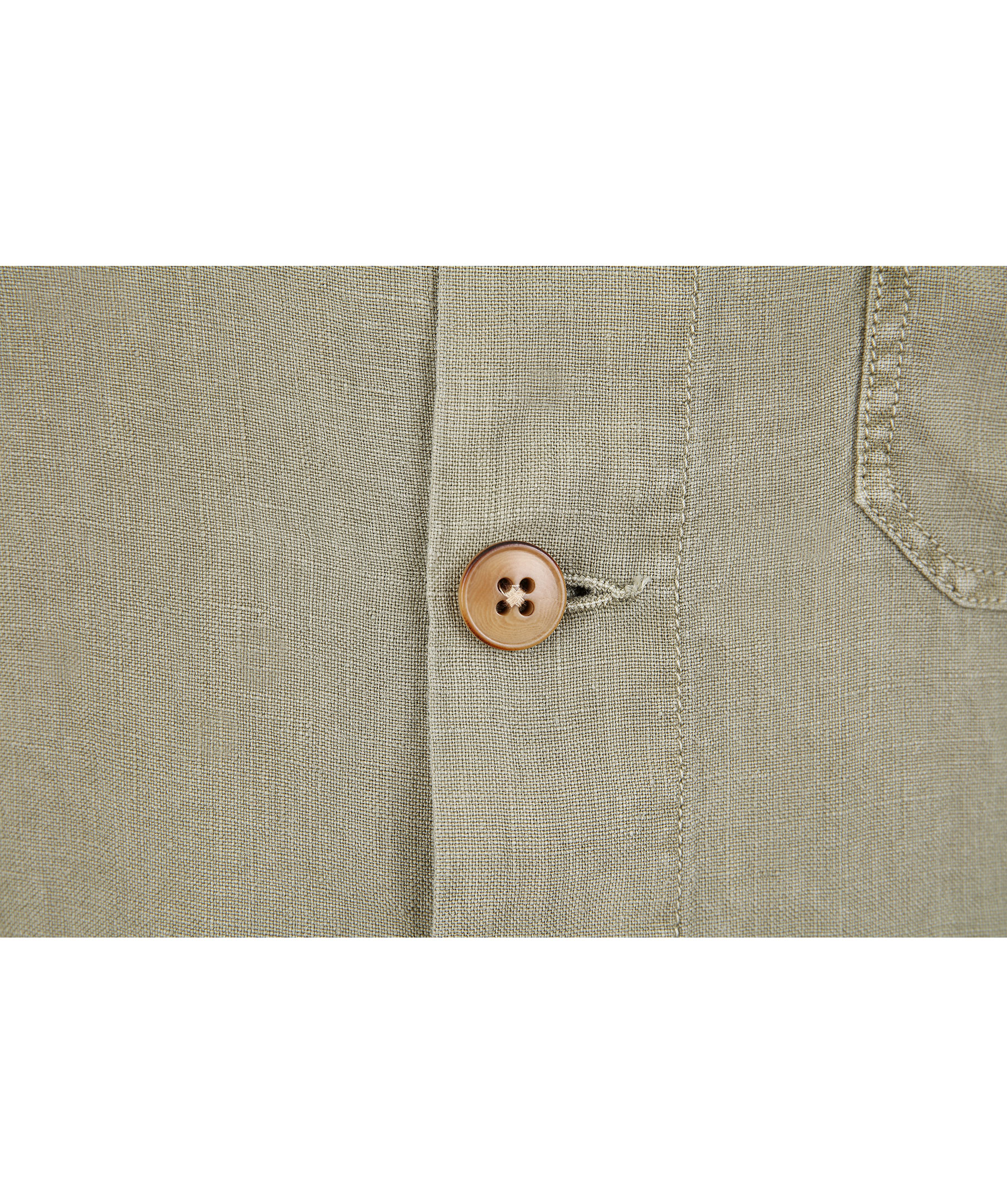 Olivgrön, tunn overshirt från Morris. Tillverkad i ett luftigt linnetyg, bärs gärna över en T-shirt eller skjorta. Svarta stora knappar, tillverkade av corozo palmens fruktnötter. Två fickor och en bröstficka. Tillverkad i 100% linne.