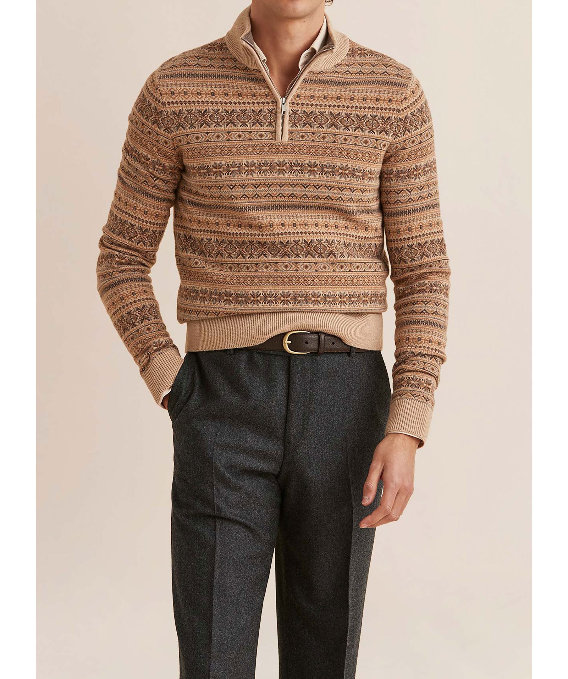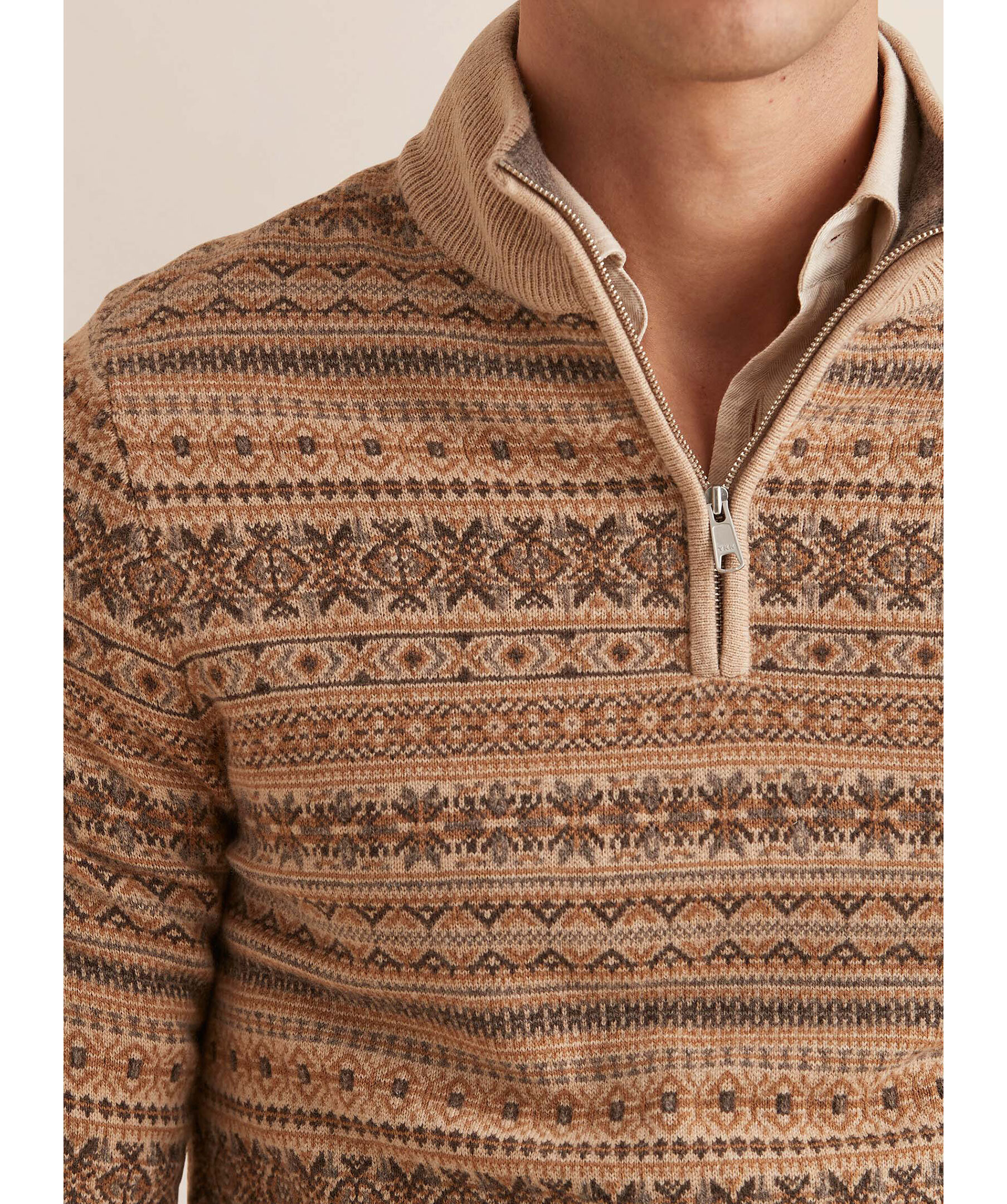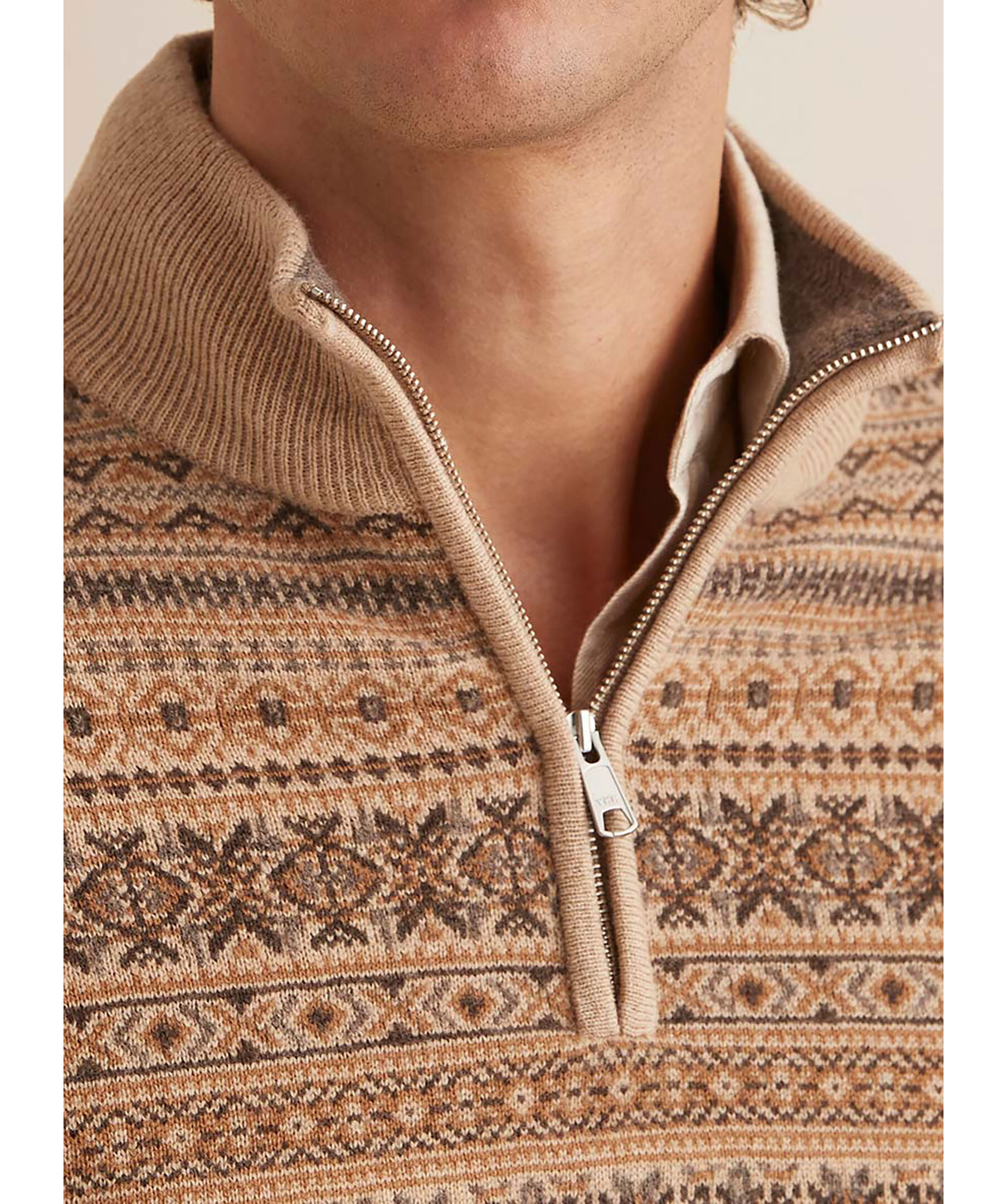 Modellen är 188 cm och bär storlek M. Beige, brun och grå mönstrad stickad Half-zip från Morris Heritage. Ribbstickad Krage, muddar vid ärm- och plaggslut. Tillverkad i ullblandning.