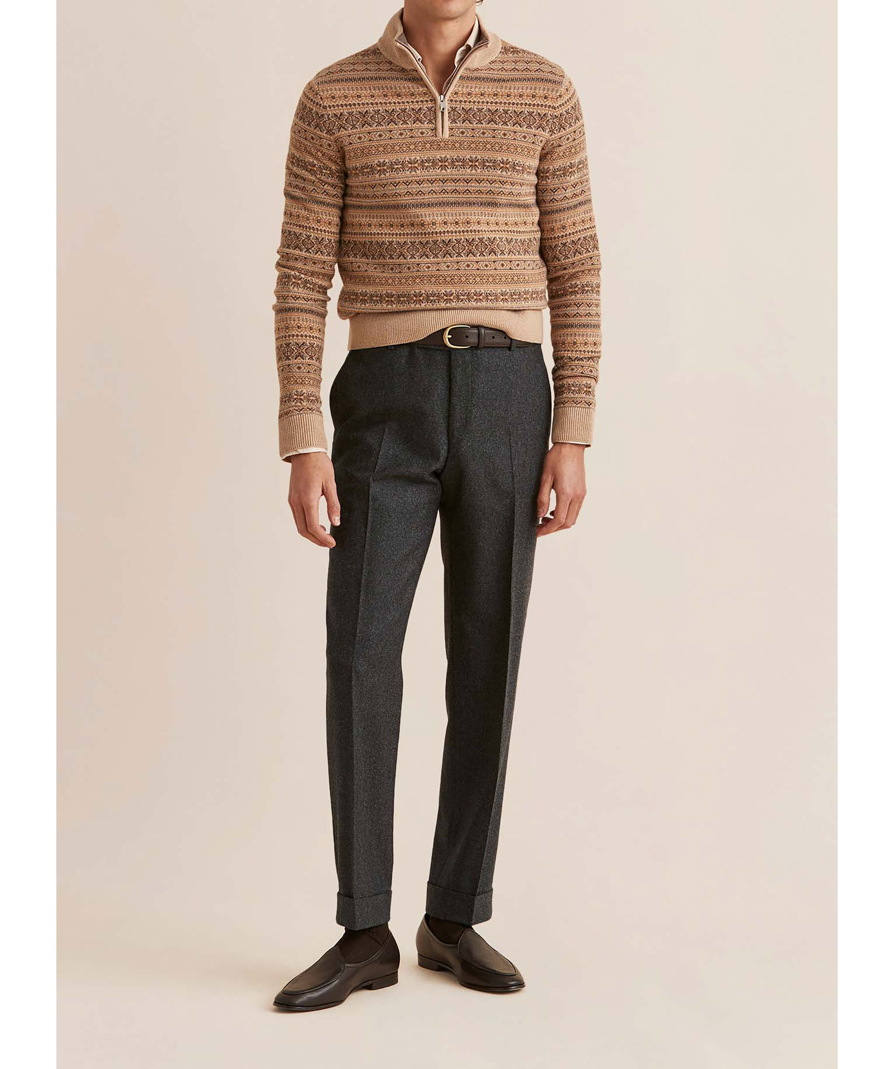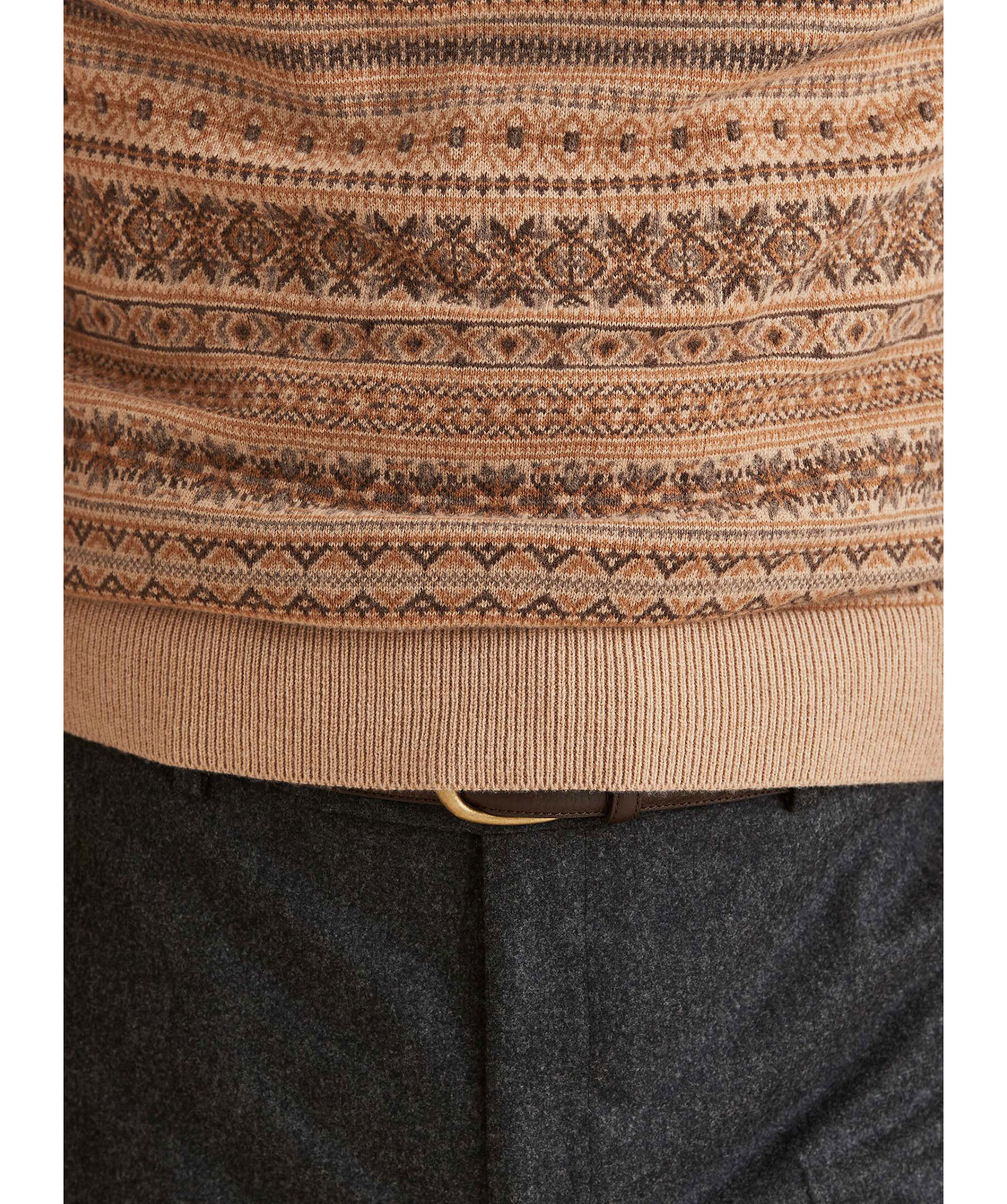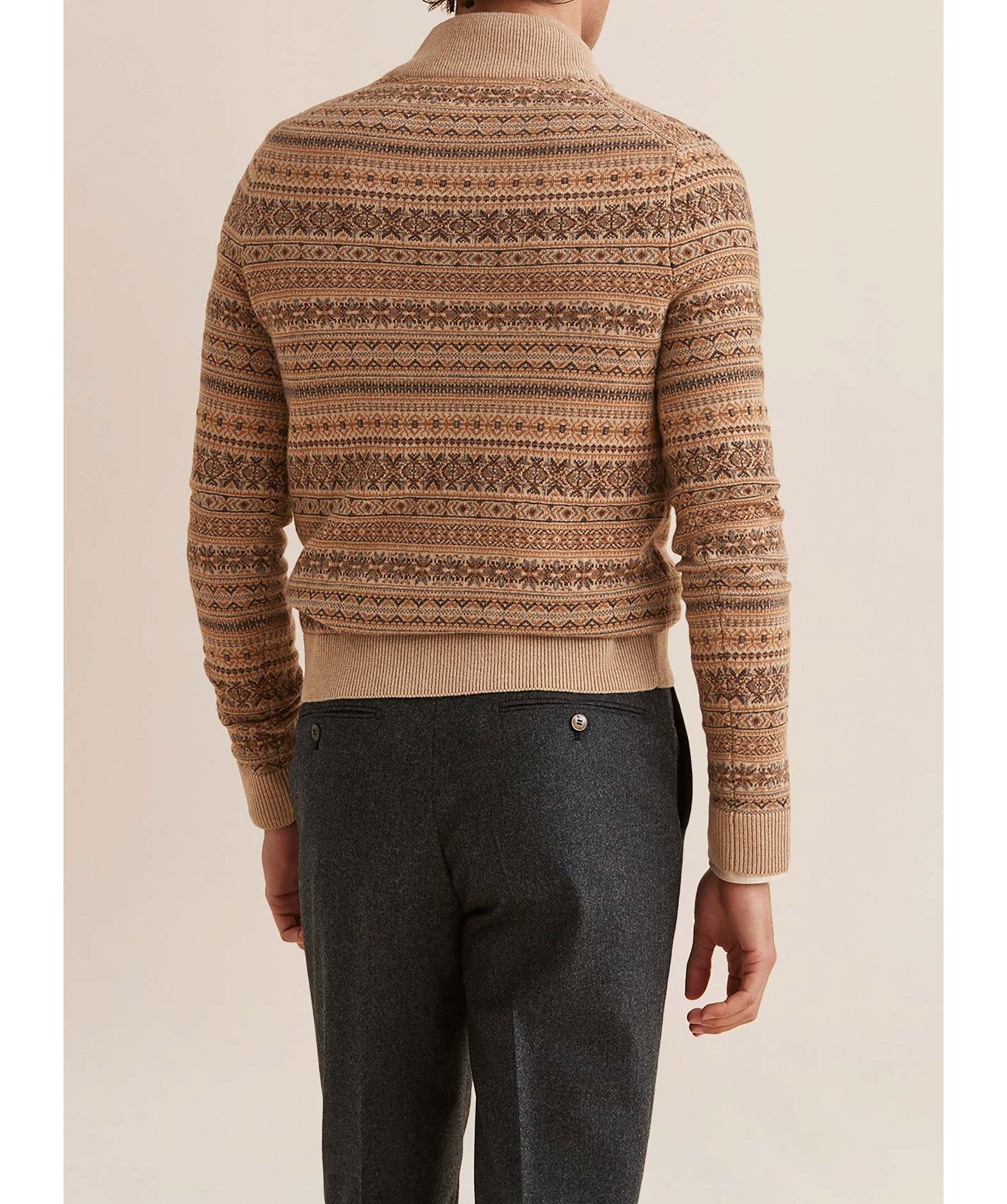 Modellen är 188 cm och bär storlek M. Beige, brun och grå mönstrad stickad Half-zip från Morris Heritage. Ribbstickad Krage, muddar vid ärm- och plaggslut. Tillverkad i ullblandning.
