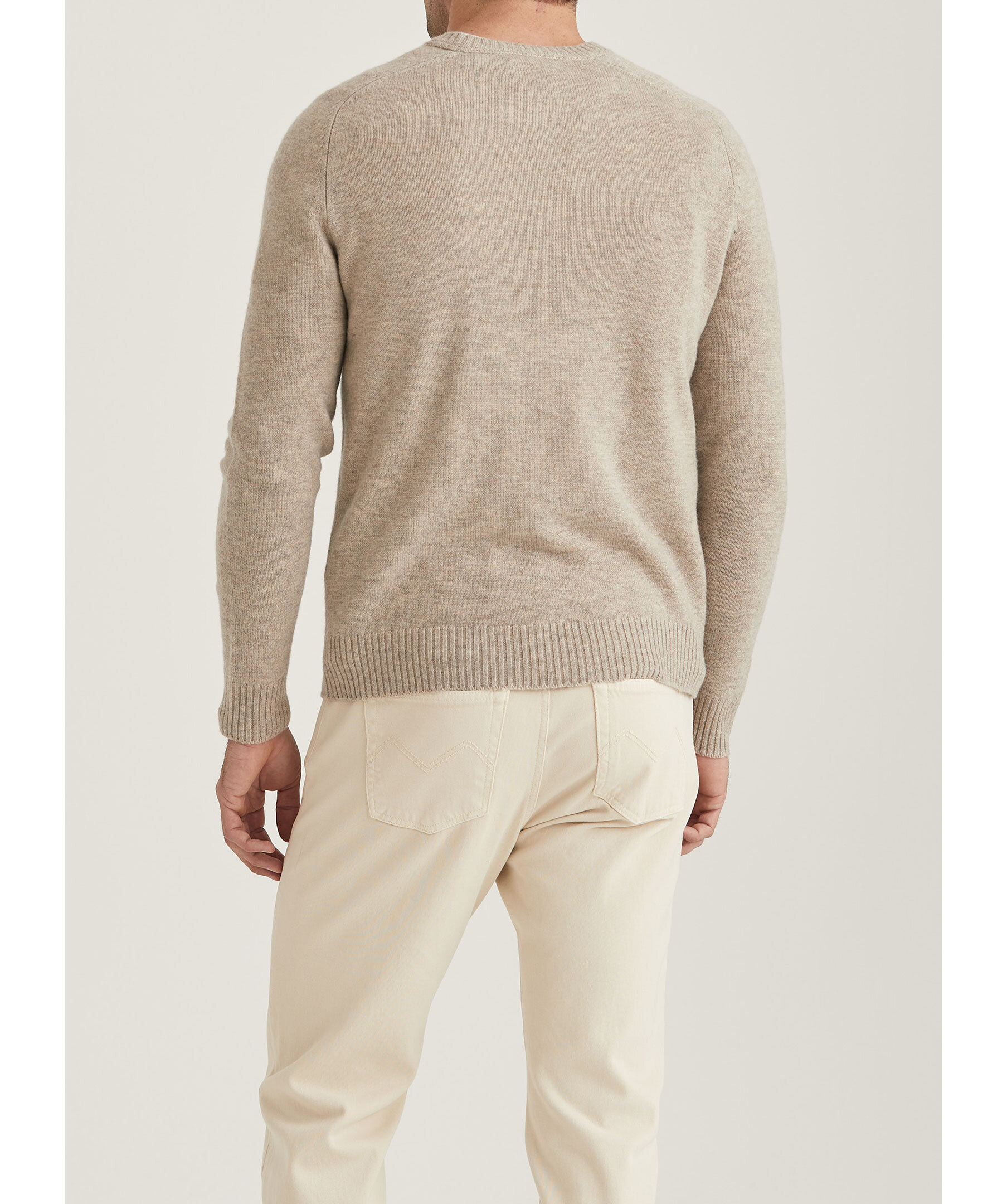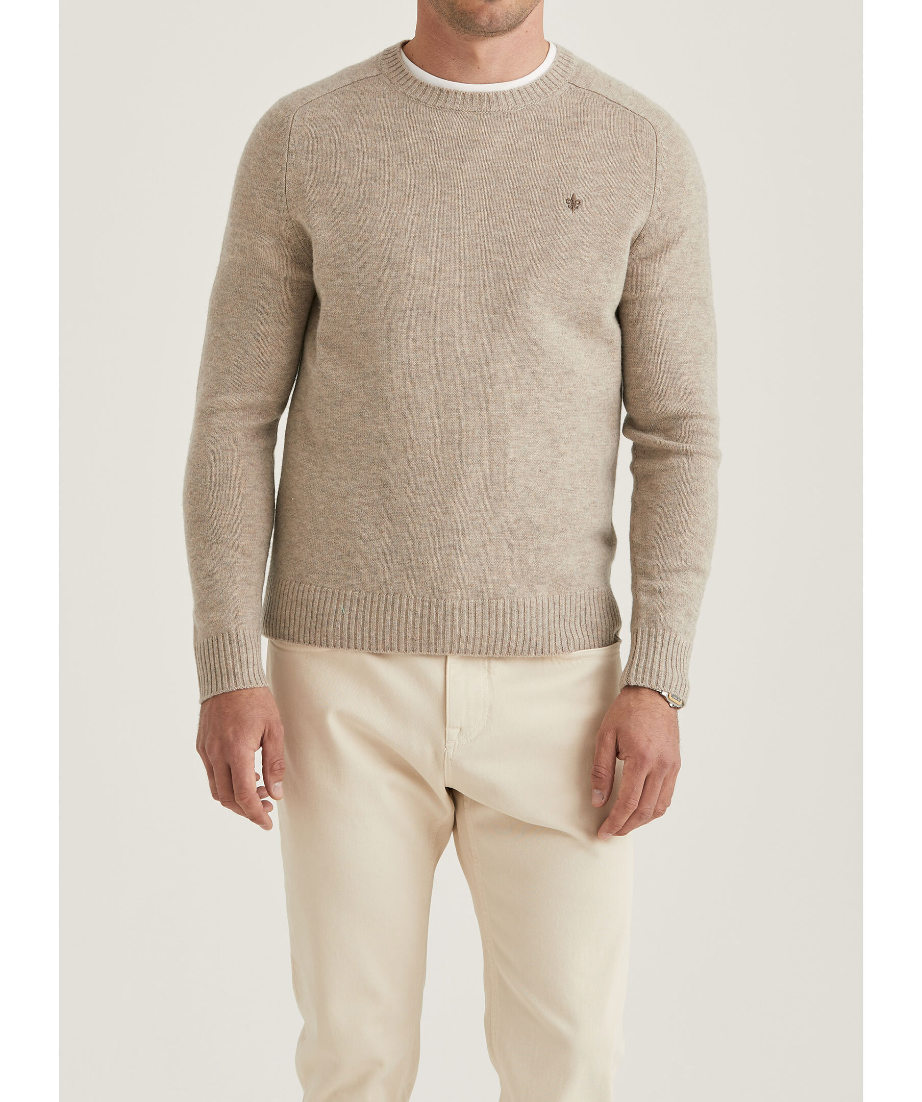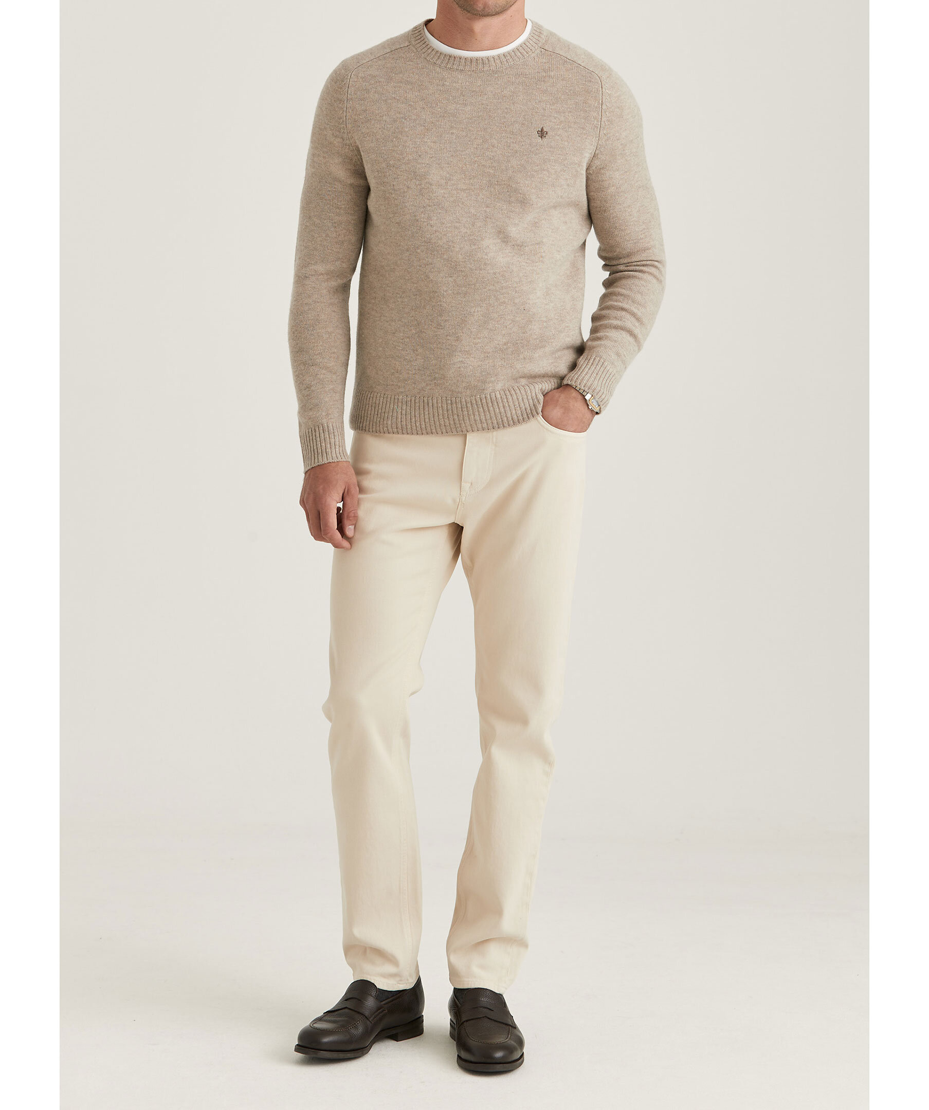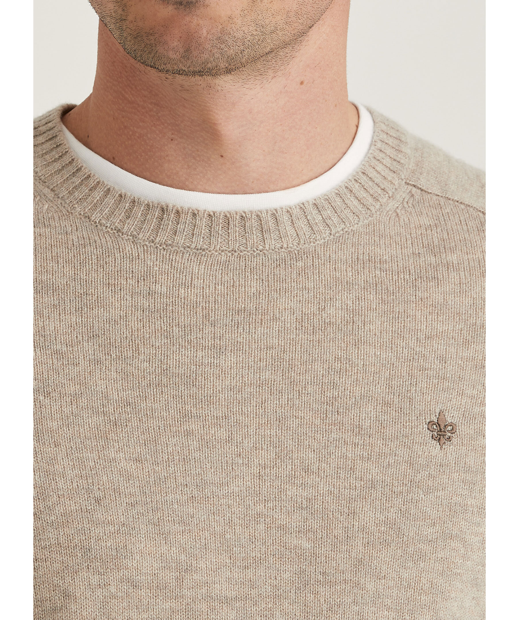 Khakifärgad, stickad tröja från Morris. Tröjan har en ribbstickad, rund halsringning samt ribbstickade muddar och en broderad signturlilja på bröstet. Tillverkad i 100% merinoull.