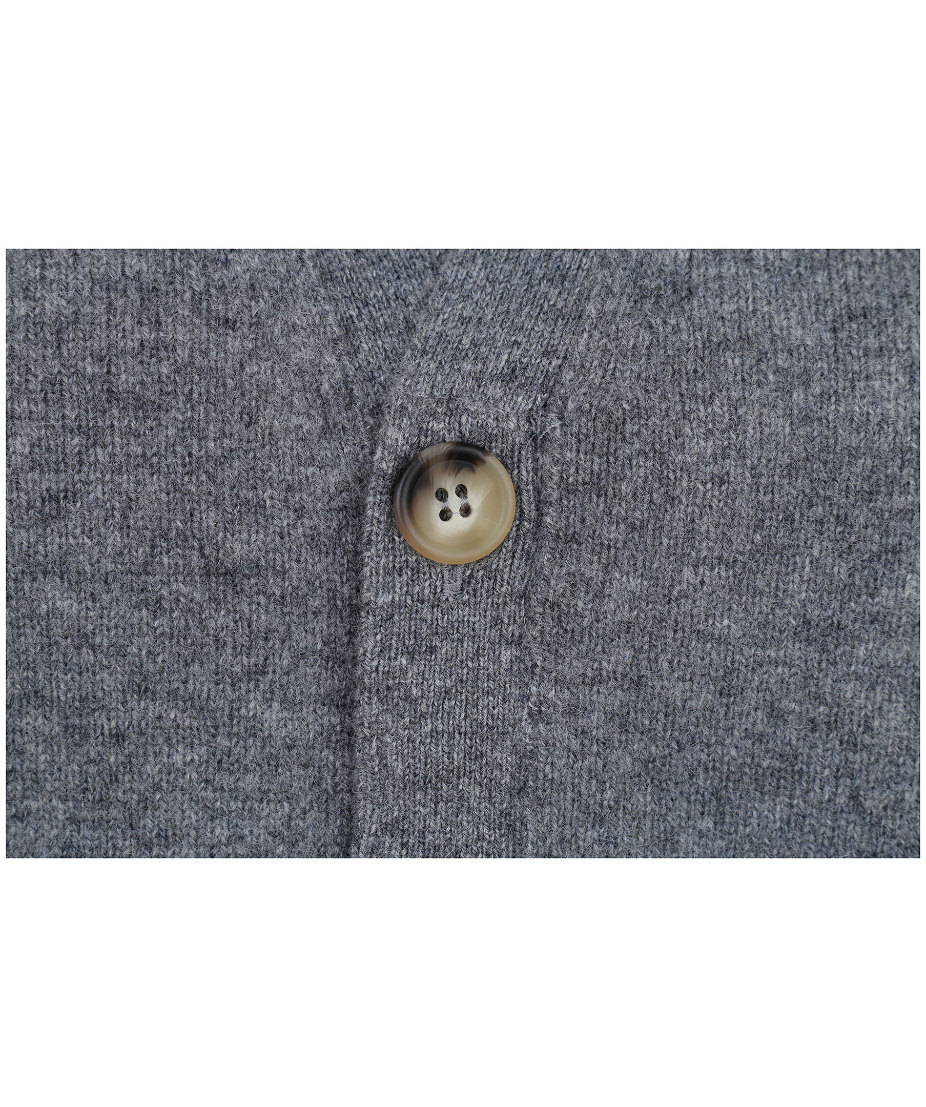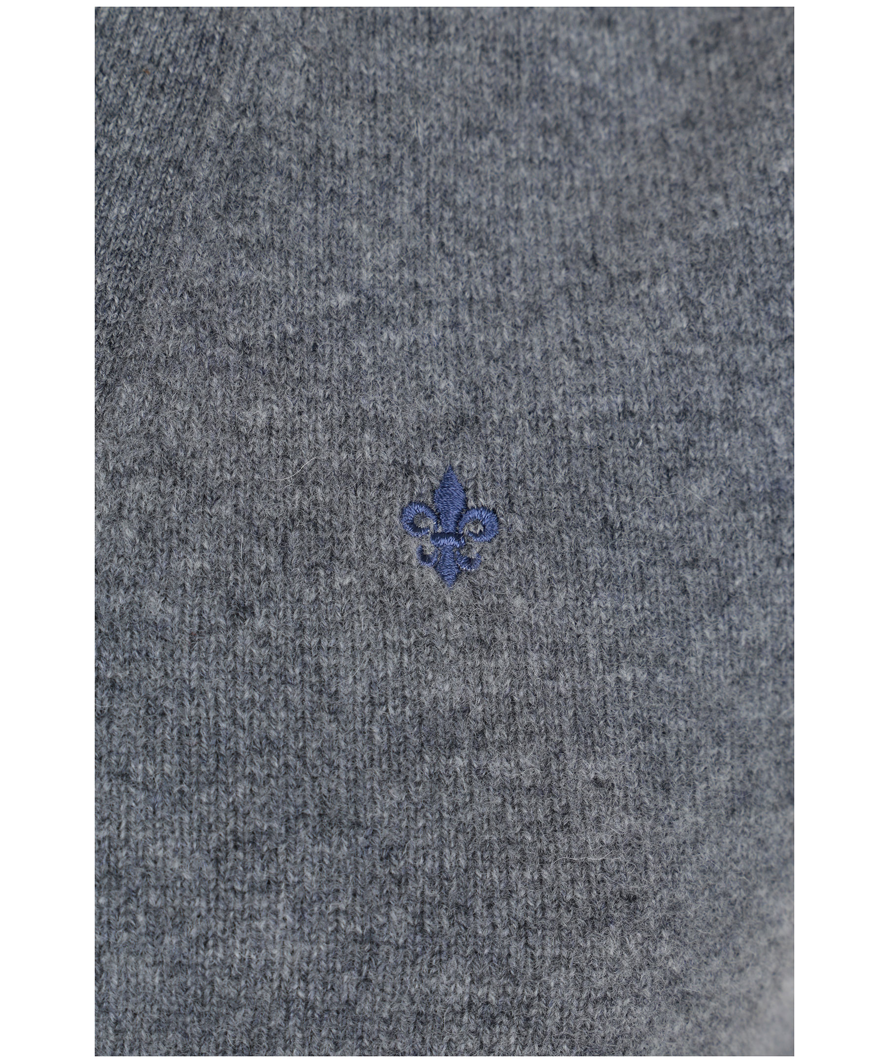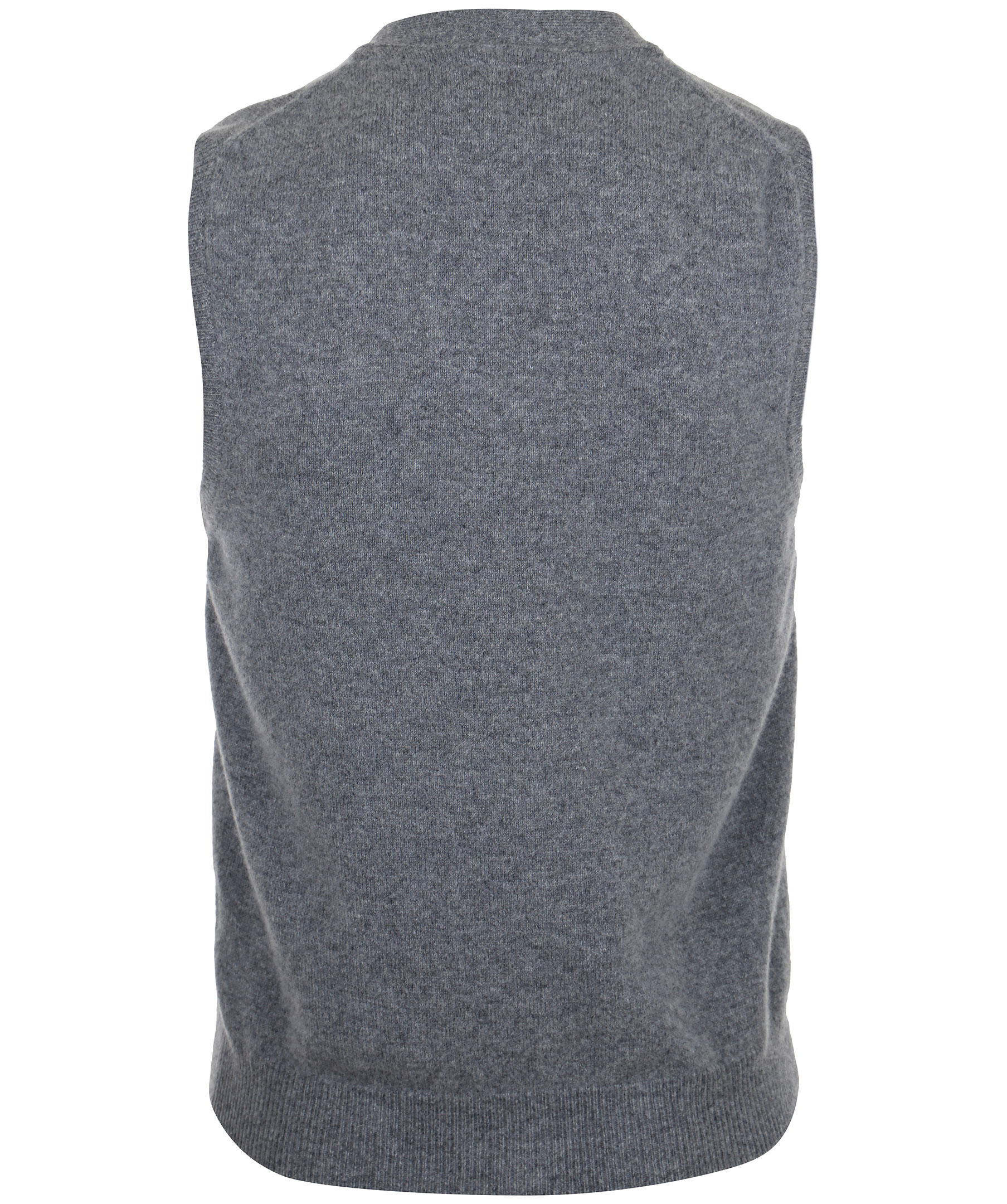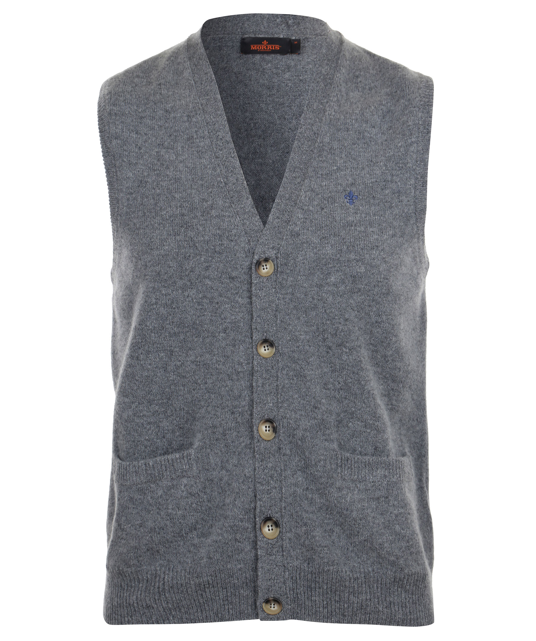 Grå väst, gjord i ren lammull. Från Morris. Två fickor fram, broderad logotyp på bröstet samt melerade knappar.
