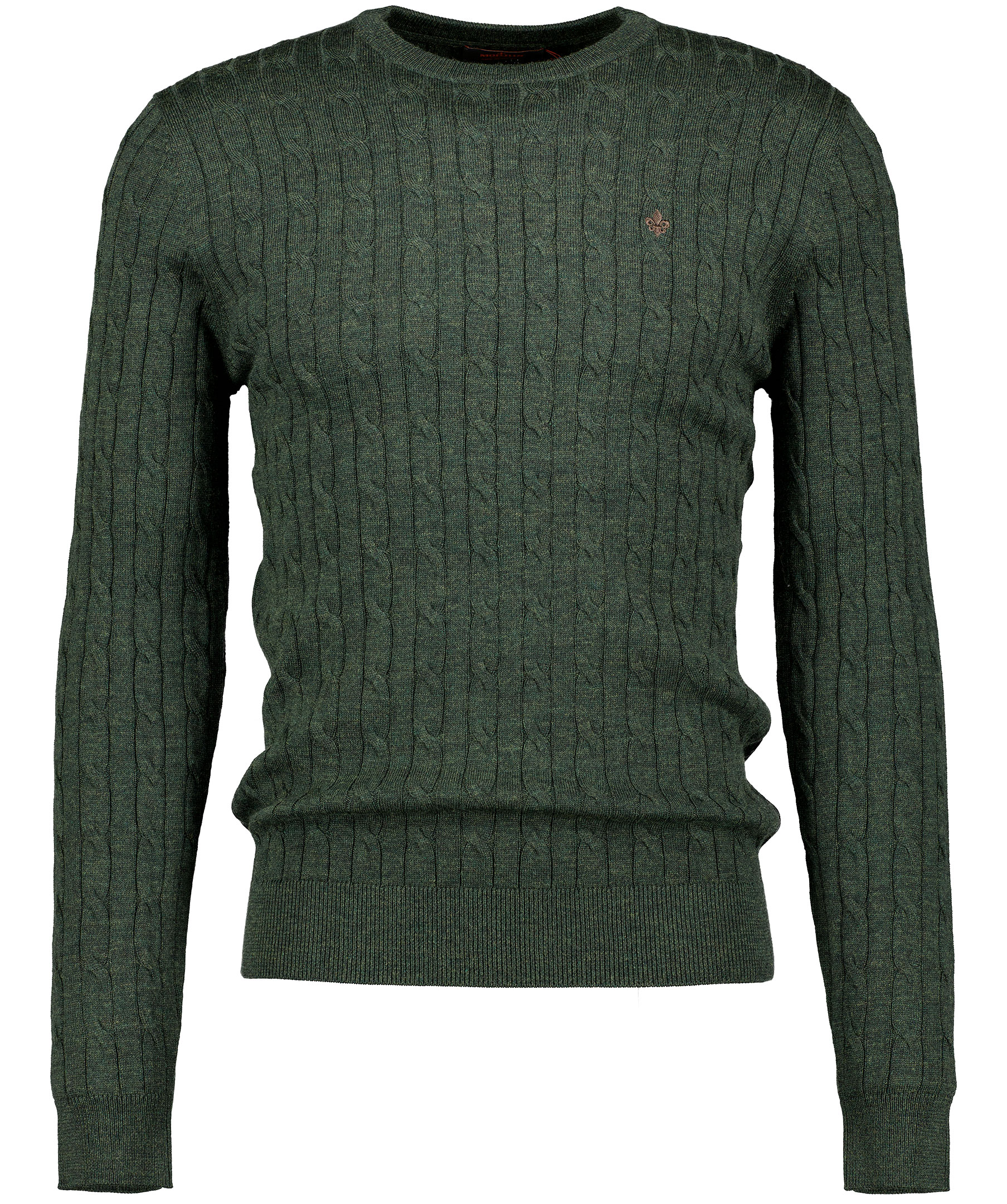 Grön kabelstickad tröja från Morris. Broderad logga på bröstet, crewneck, ribbade muddar, tillverkad i 100% merinoull.
