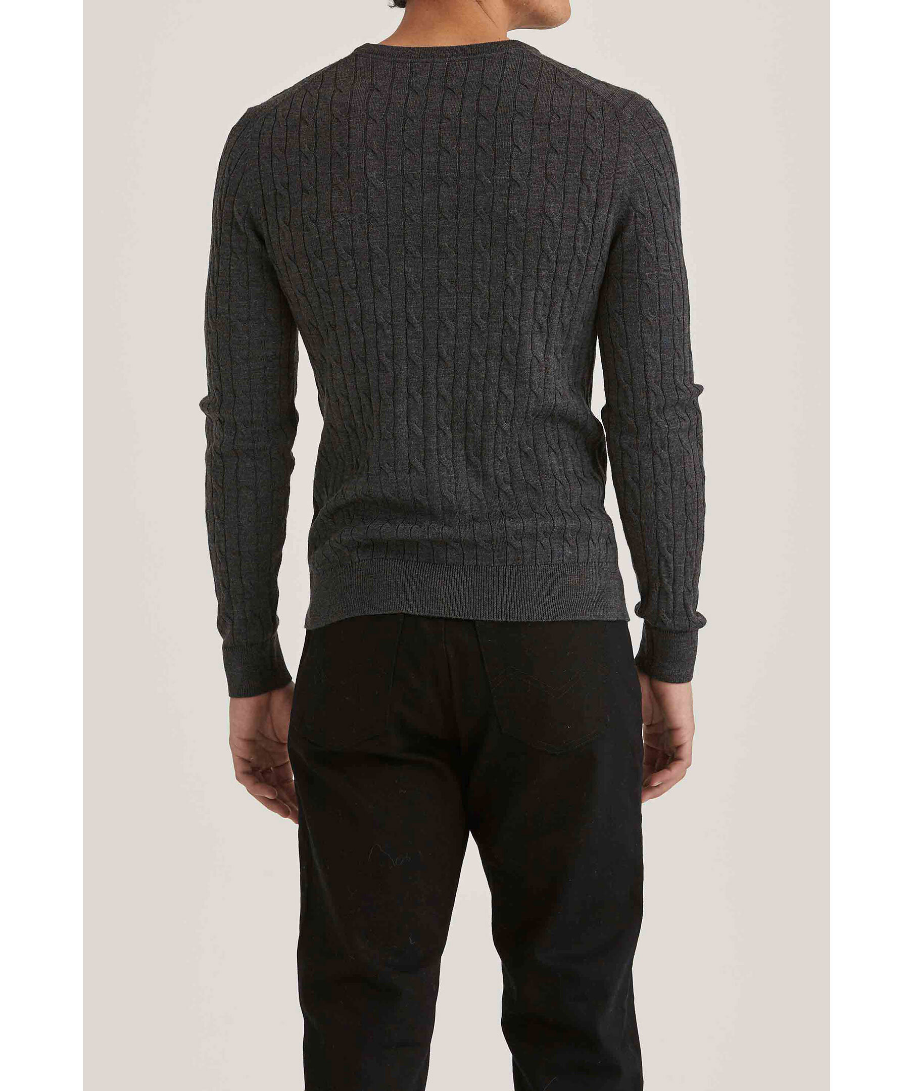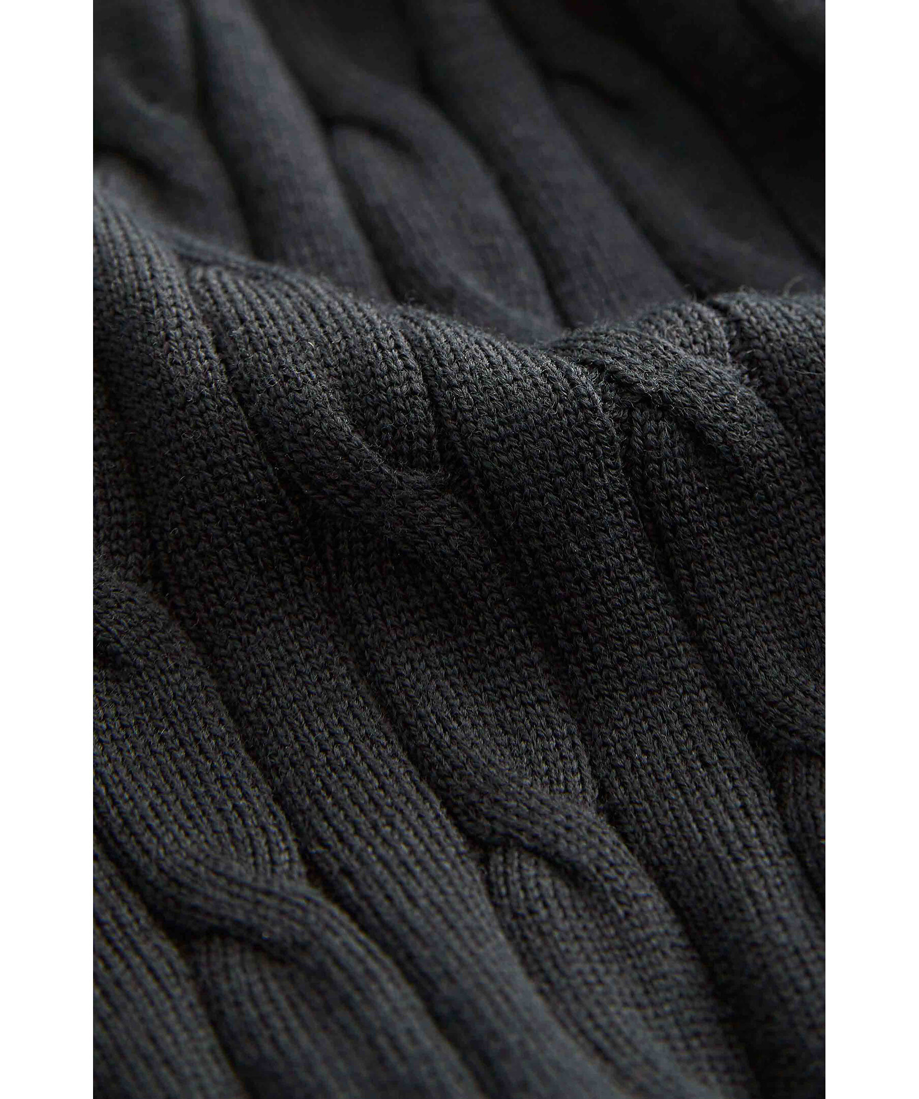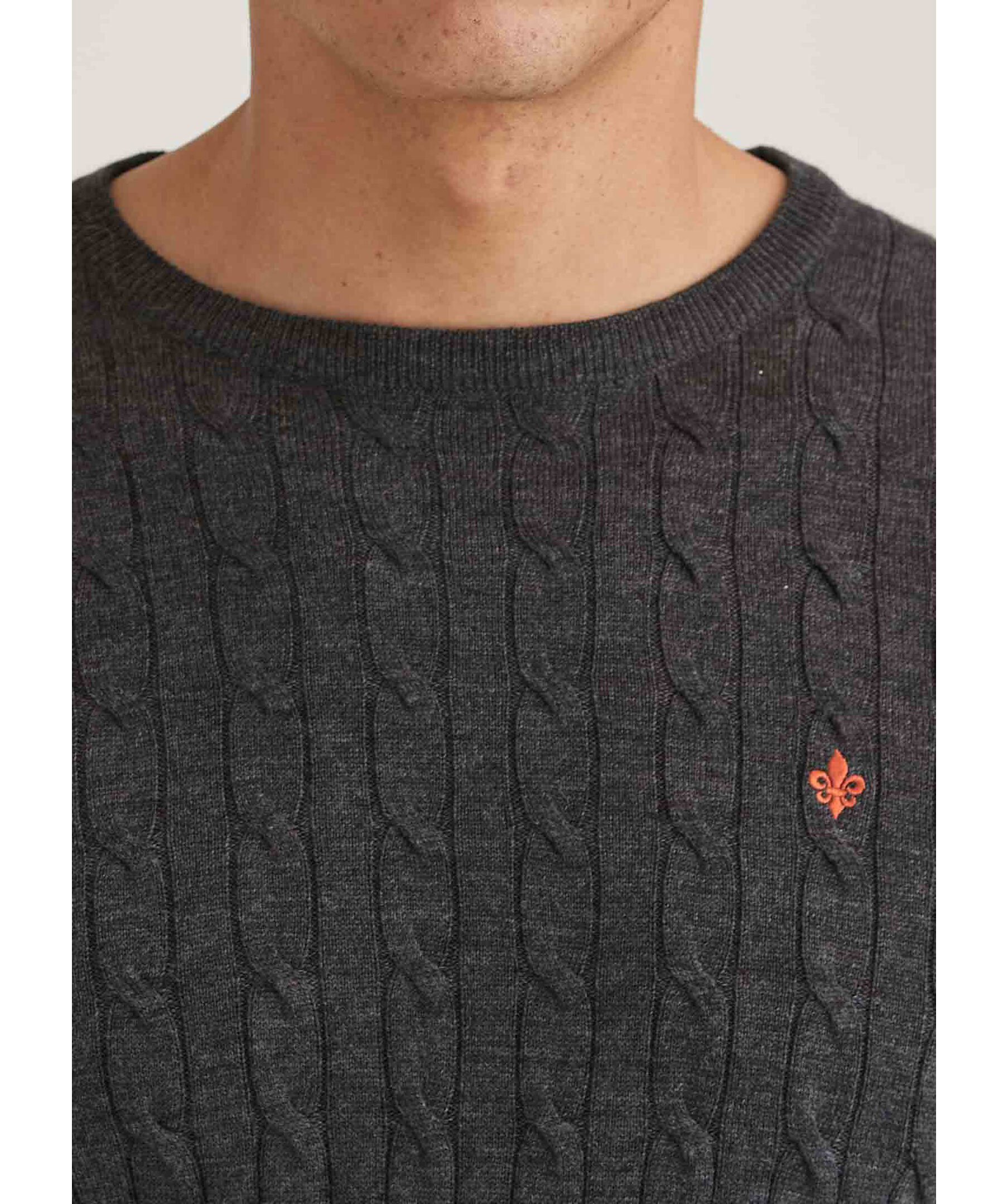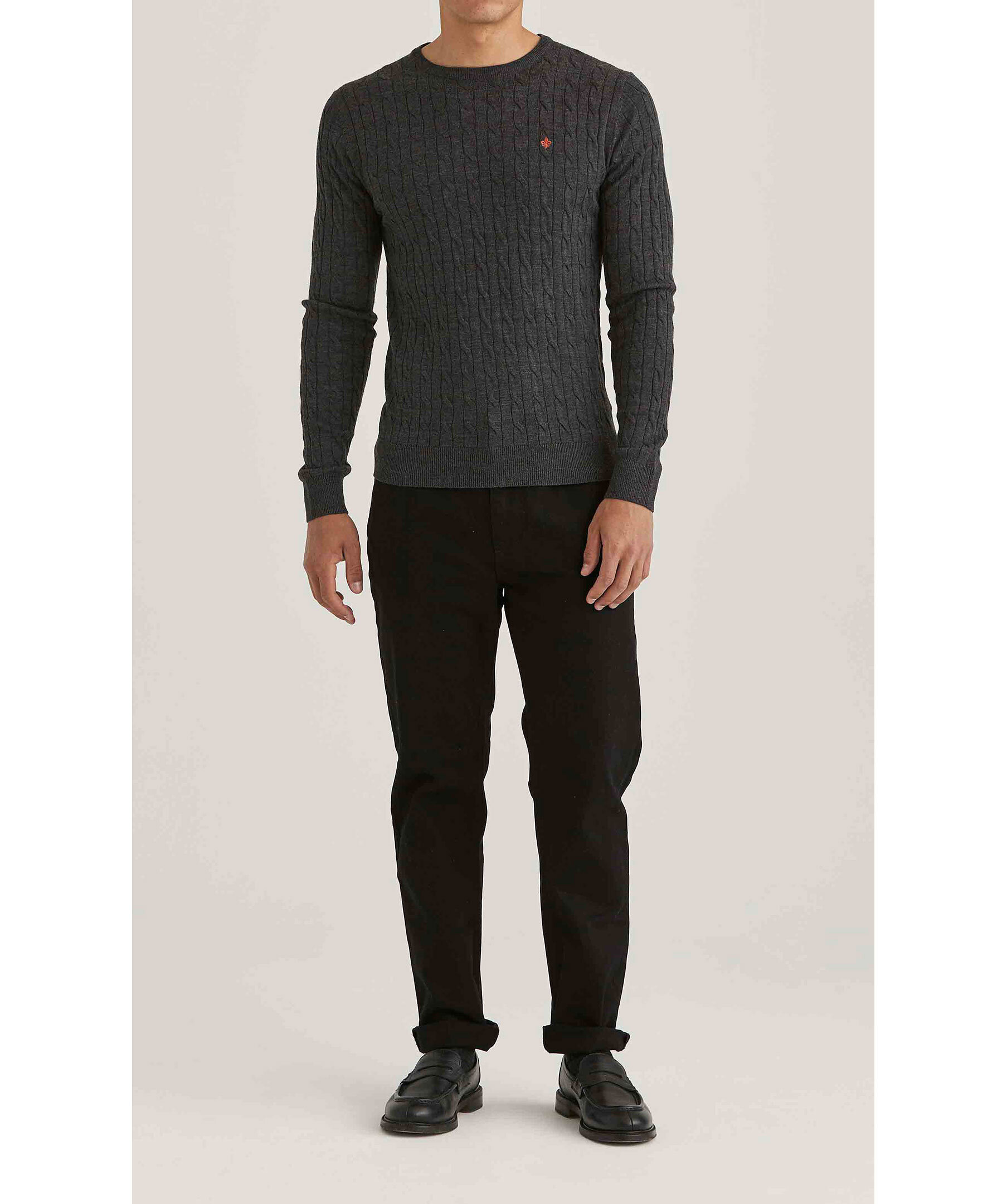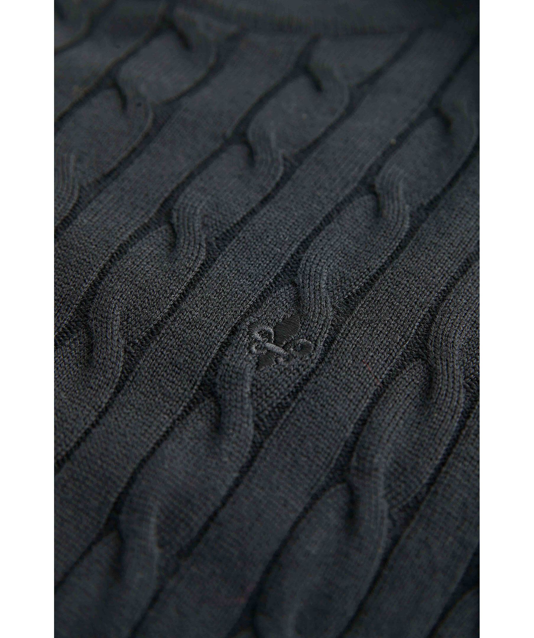 Mörkblå kabelstickad tröja från Morris. Rundad halsringning. Broderad logotyp på vänster bröst. Ribbstickade muddar vid ärm- och plaggslut. Tillverkad i 100% Merino ull.
