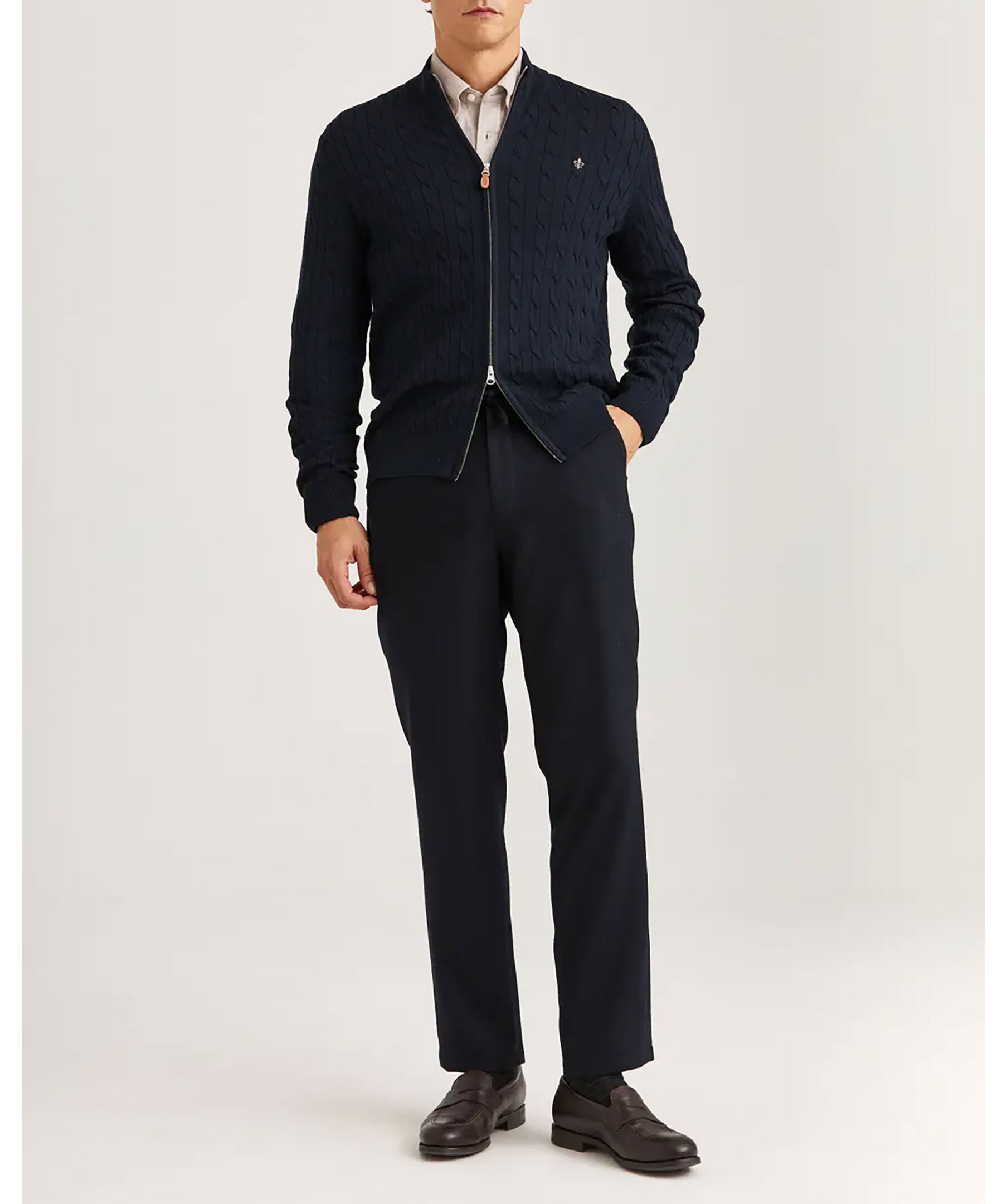 Morris. Merino cable zip cardigan - Navy