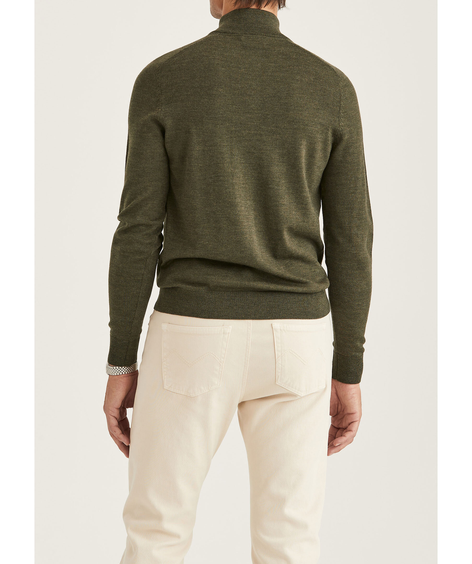 Olivgrön finstickad tröja från Morris. Tröjan har en hög krage med half zip. Broderad lilja på bröstet och ribbstickade muddar. Gjord i 100% merinoull.