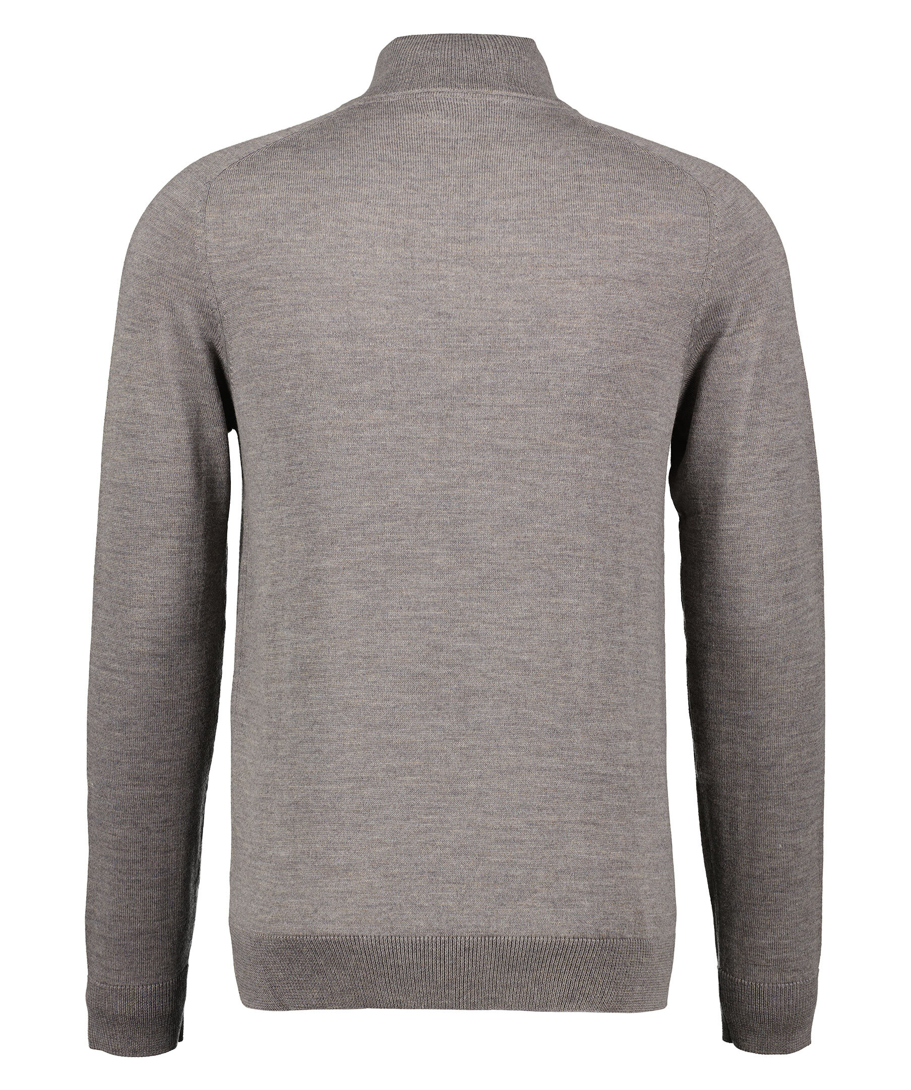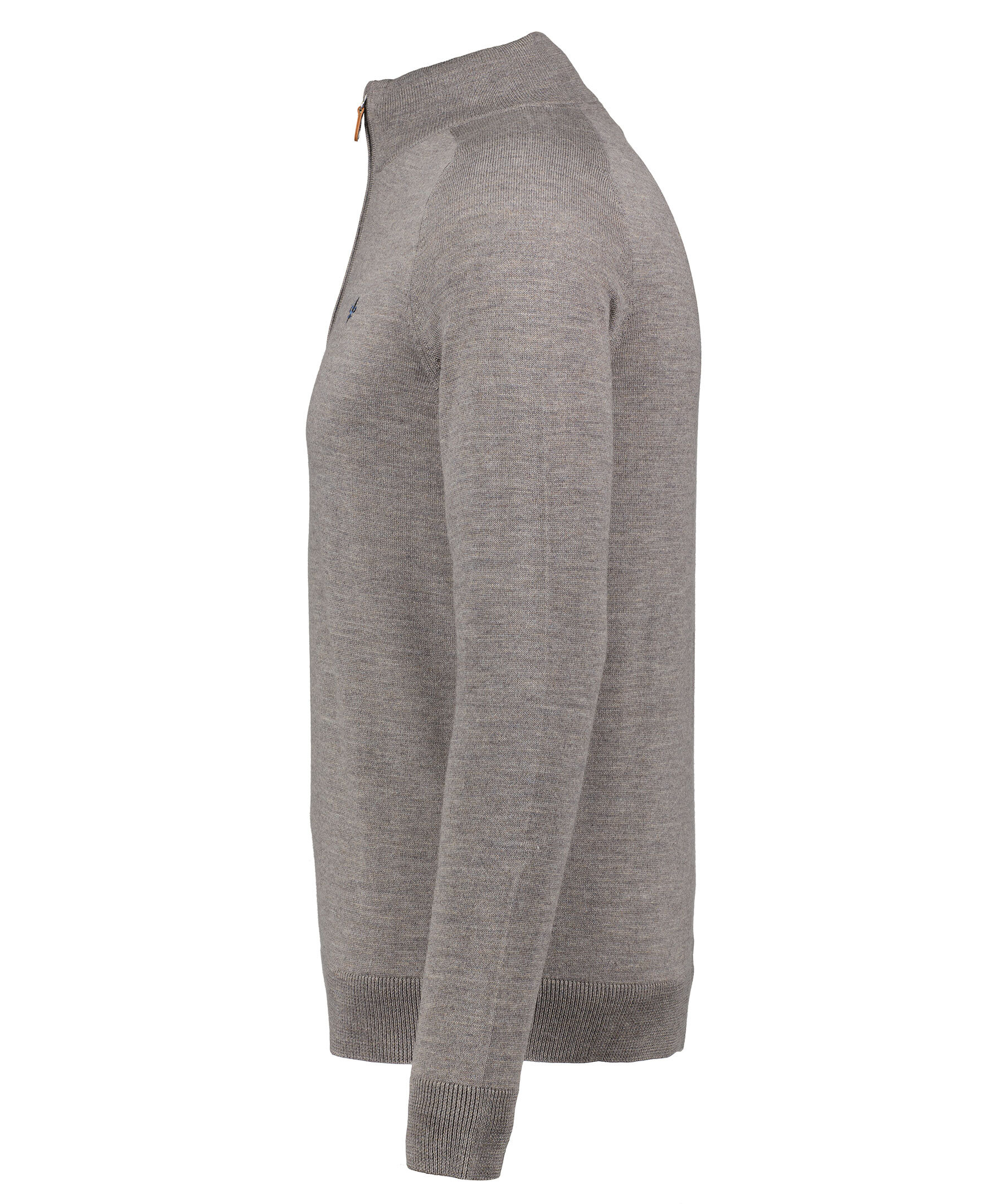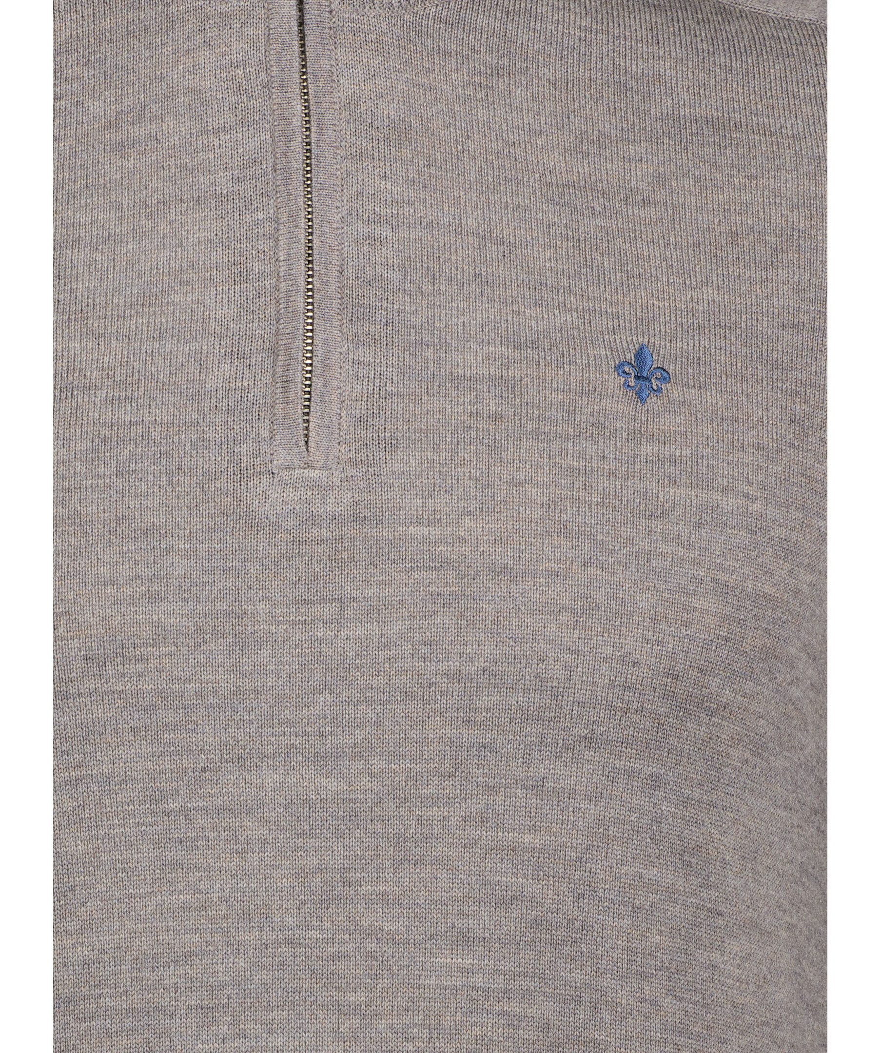 Grå finstickad tröja från Morris. Tröjan har en hög krage med halvzip. Gjord i 100% merinoull. Broderad lilja på bröstet och ribbstickade muddar. Smal passform.