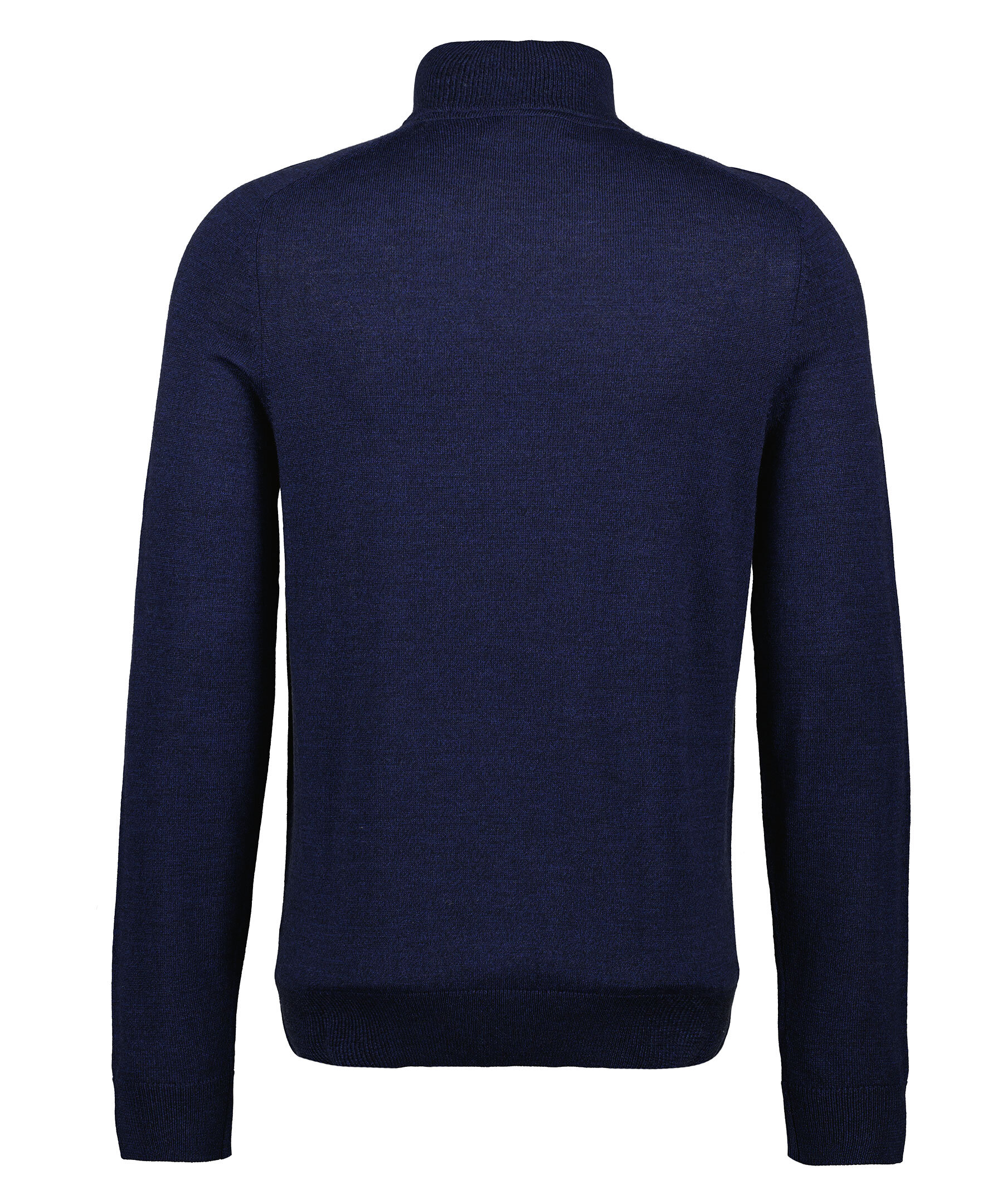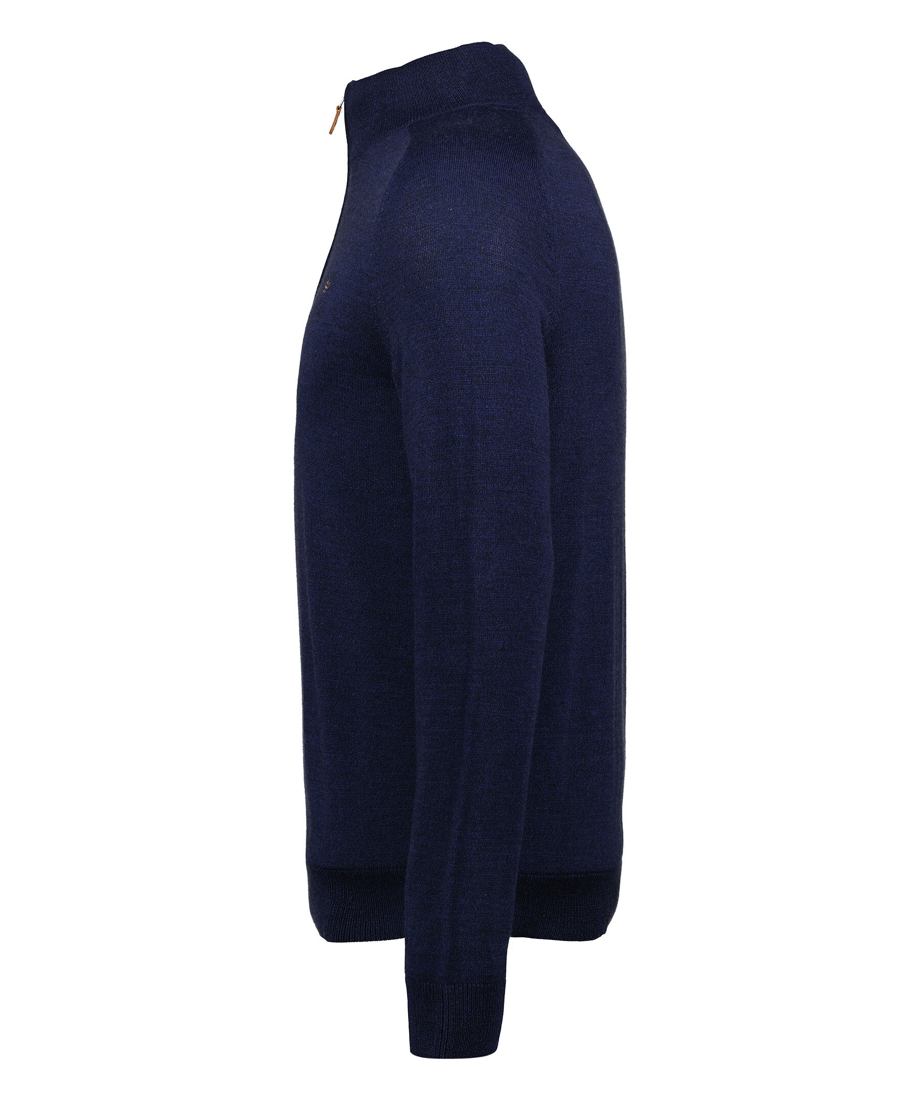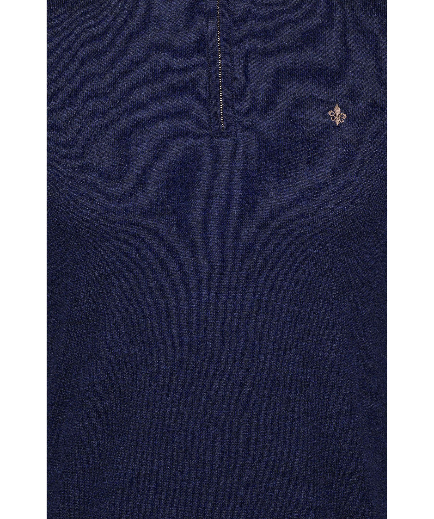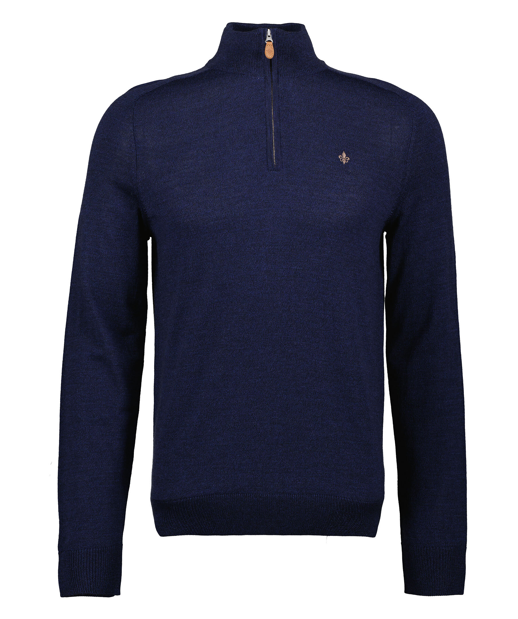 Mörkblå finstickad tröja från Morris. Tröjan har en hög krage med halfzip. Gjord i 100% merinoull. Broderad lilja på bröstet och ribbstickade muddar. Smal passform.