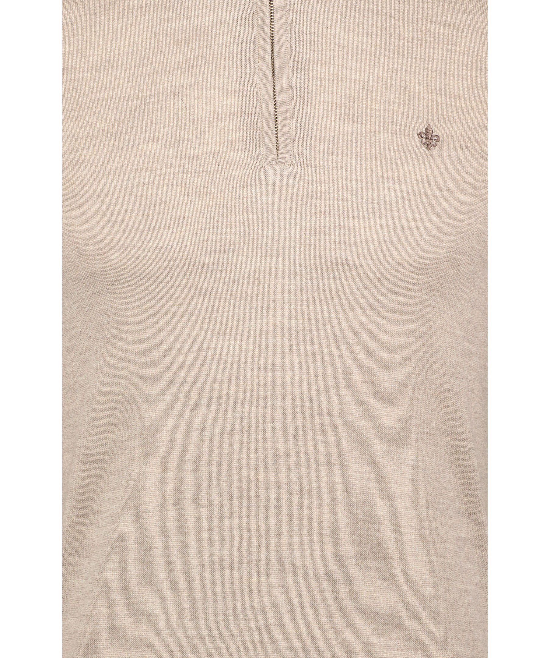 Beige melerad finstickad tröja från Morris. Tröjan har en hög krage med halfzip. Gjord i 100% merinoull. Broderad lilja på bröstet och ribbstickade muddar. Smal passform.