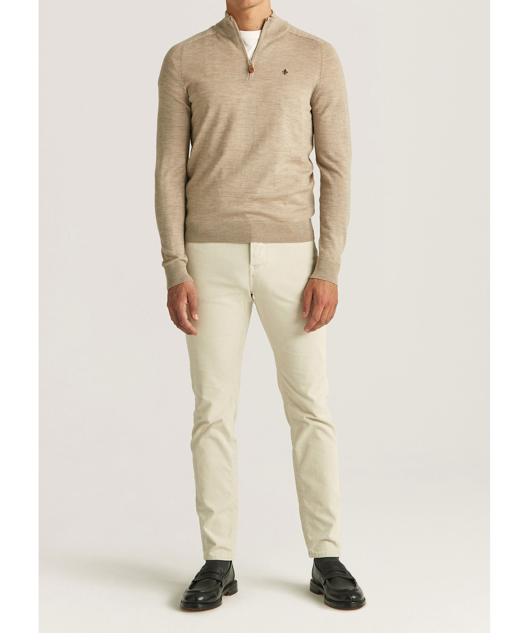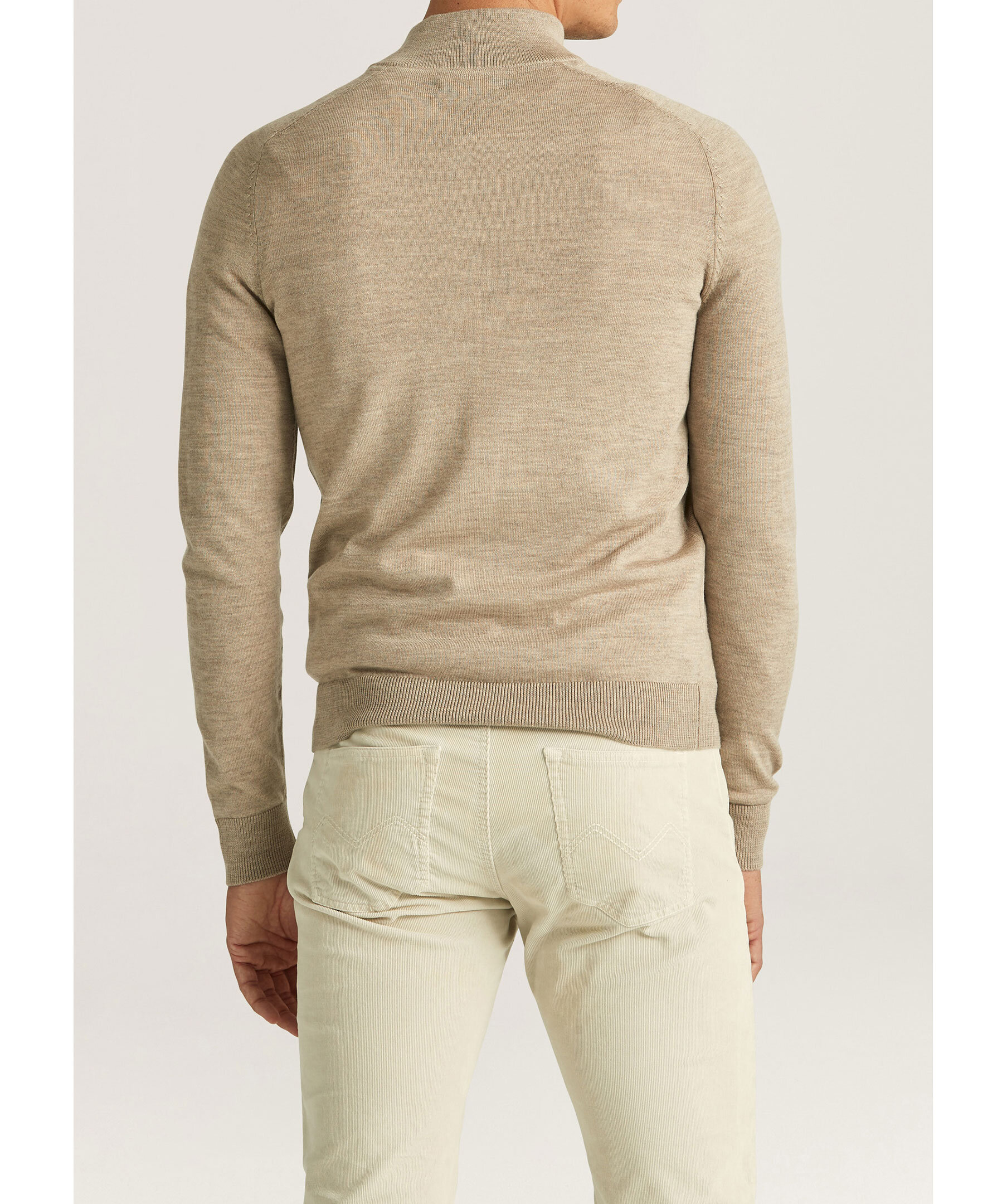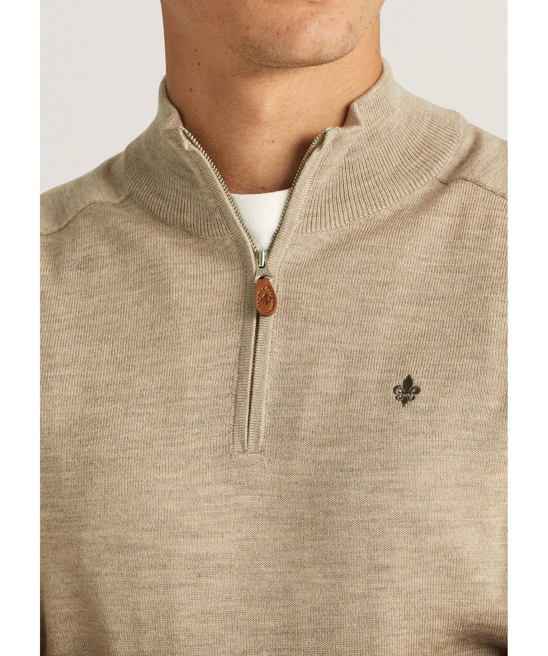 Beige melerad finstickad tröja från Morris. Tröjan har en hög krage med half zip. Broderad lilja på bröstet och ribbstickade muddar. Gjord i 100% merinoull.
