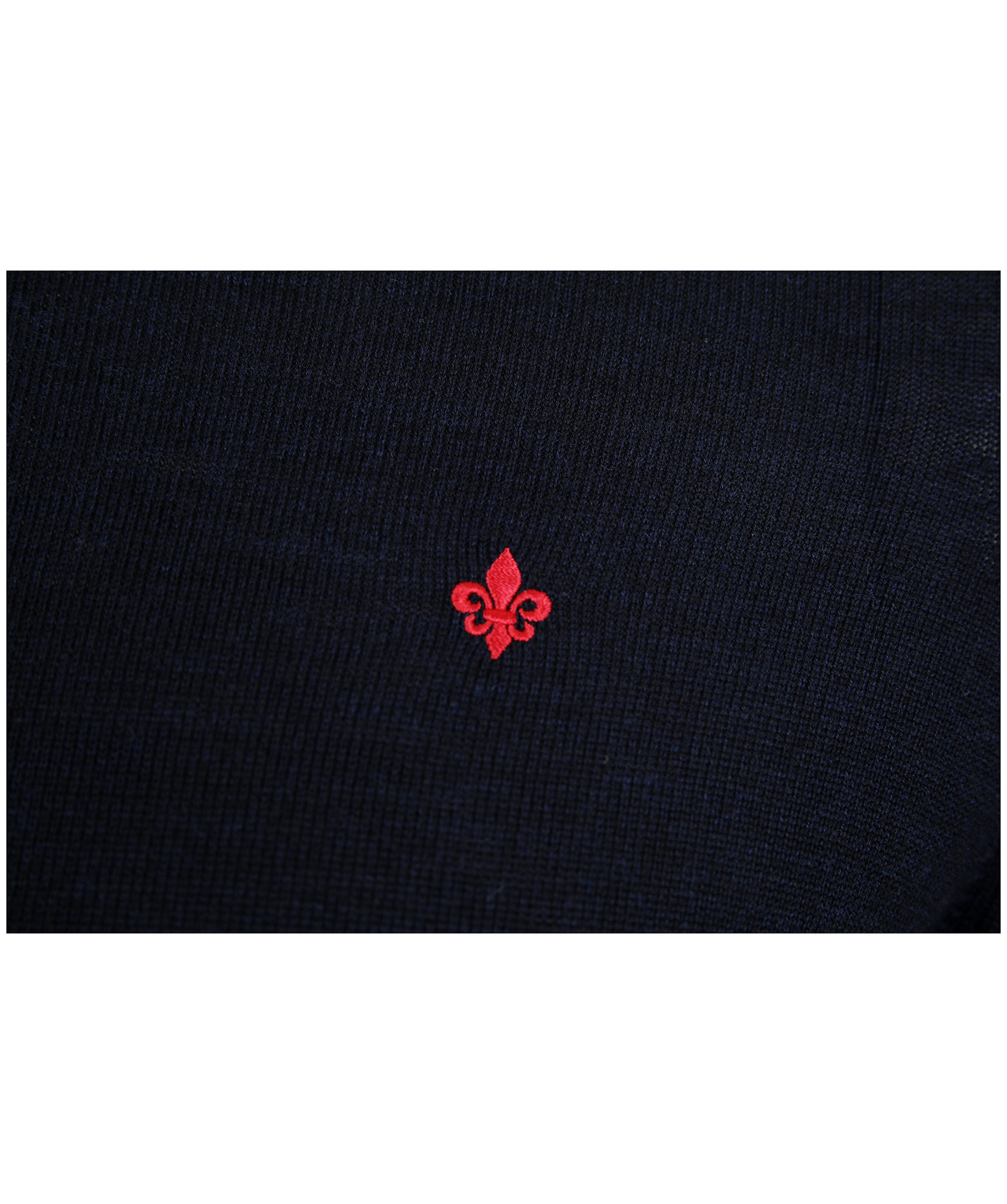 Mörkblå, finstickad tröja från Morris. Tillverkad i 100% ull. Liten, broderad lilja på sidan av bröstet, normal passform. Rundad halsringning och ribbade muddar i ärmslut och plaggslut.
