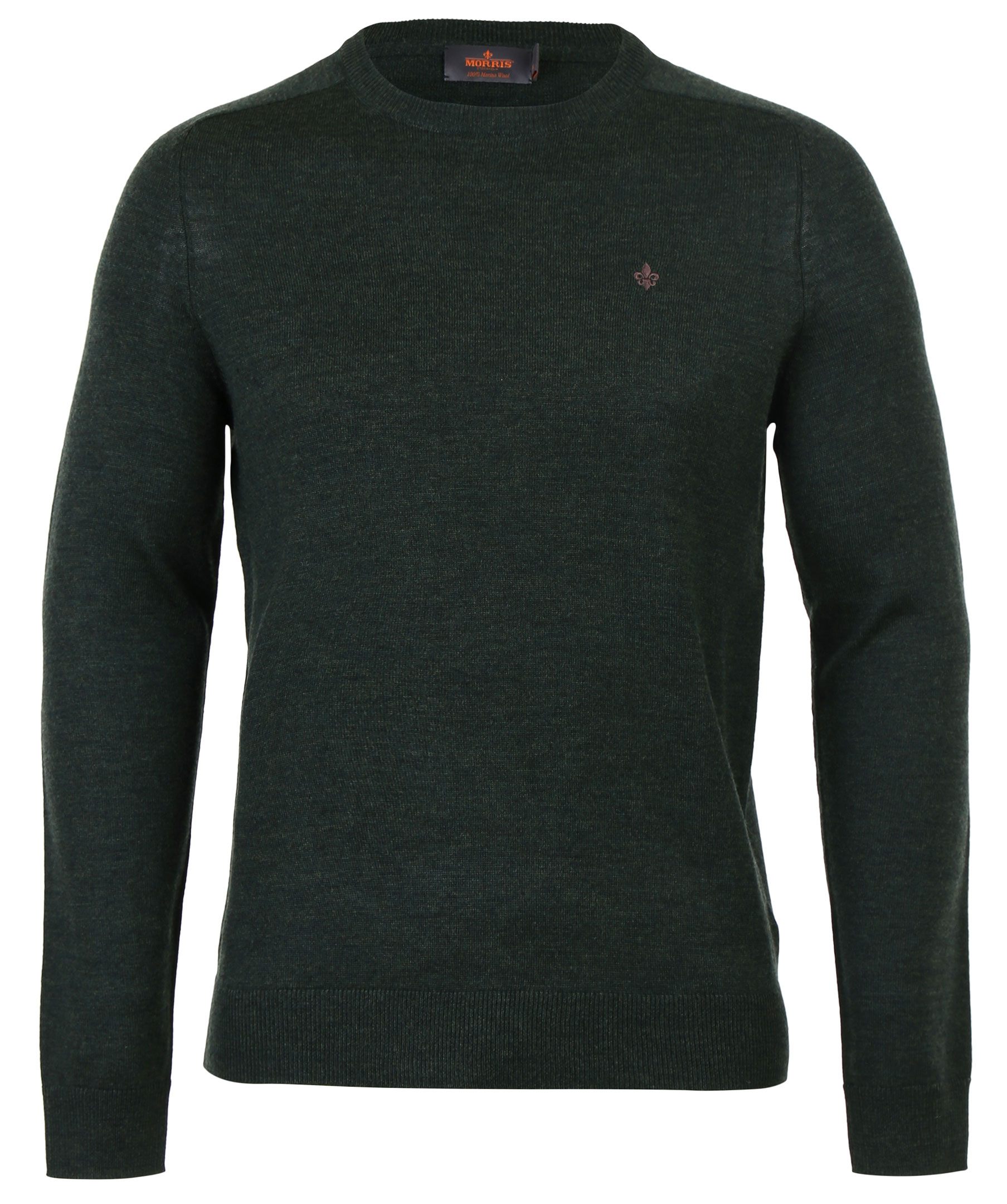 Mörkgrön finstickad tröja från Morris. Broderad logotyp på bröstet och tillverkad i 100% ull. Ribbad mudd kring den rundade halsringningen, längst ner på armar och längst ner på plagg.