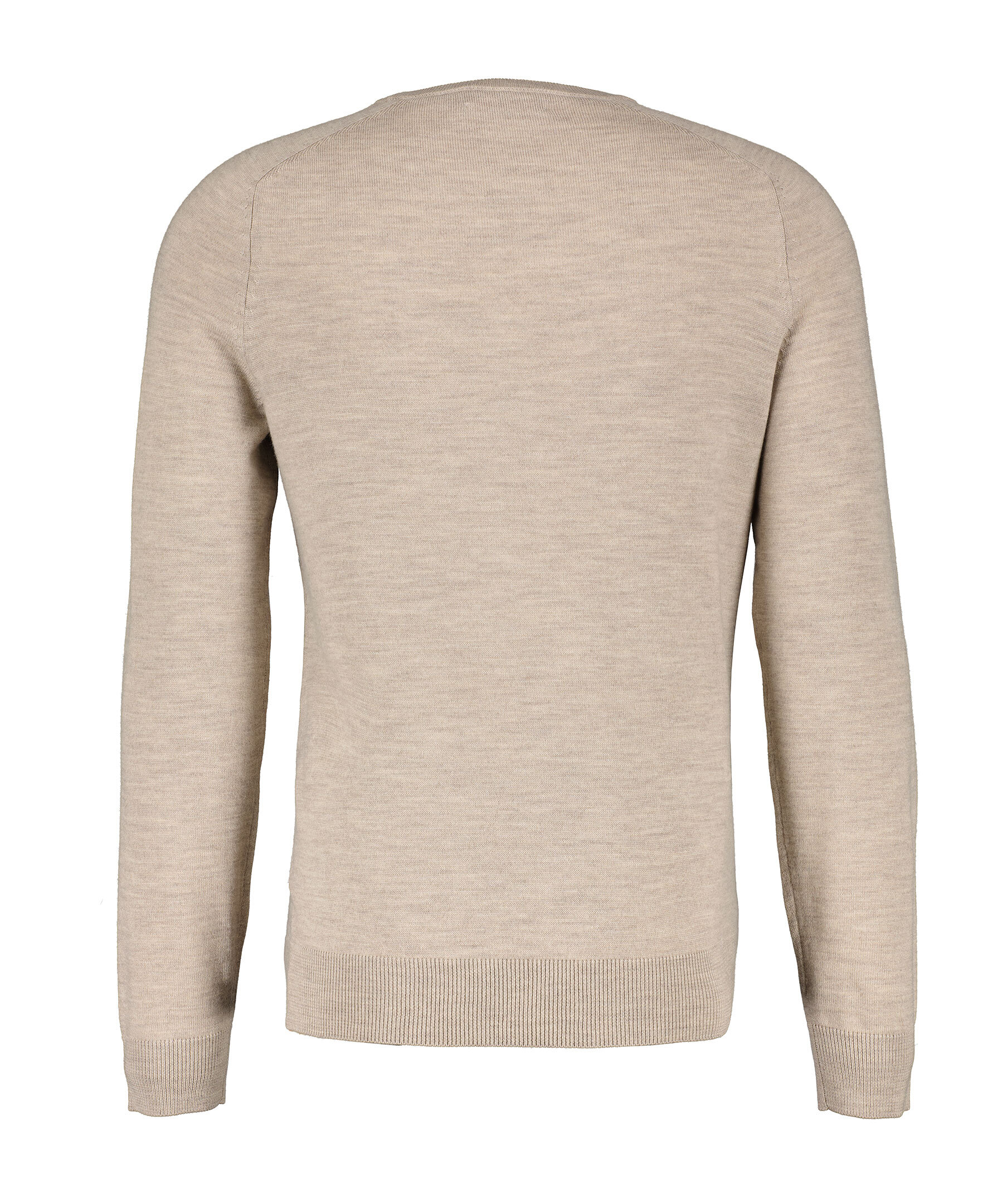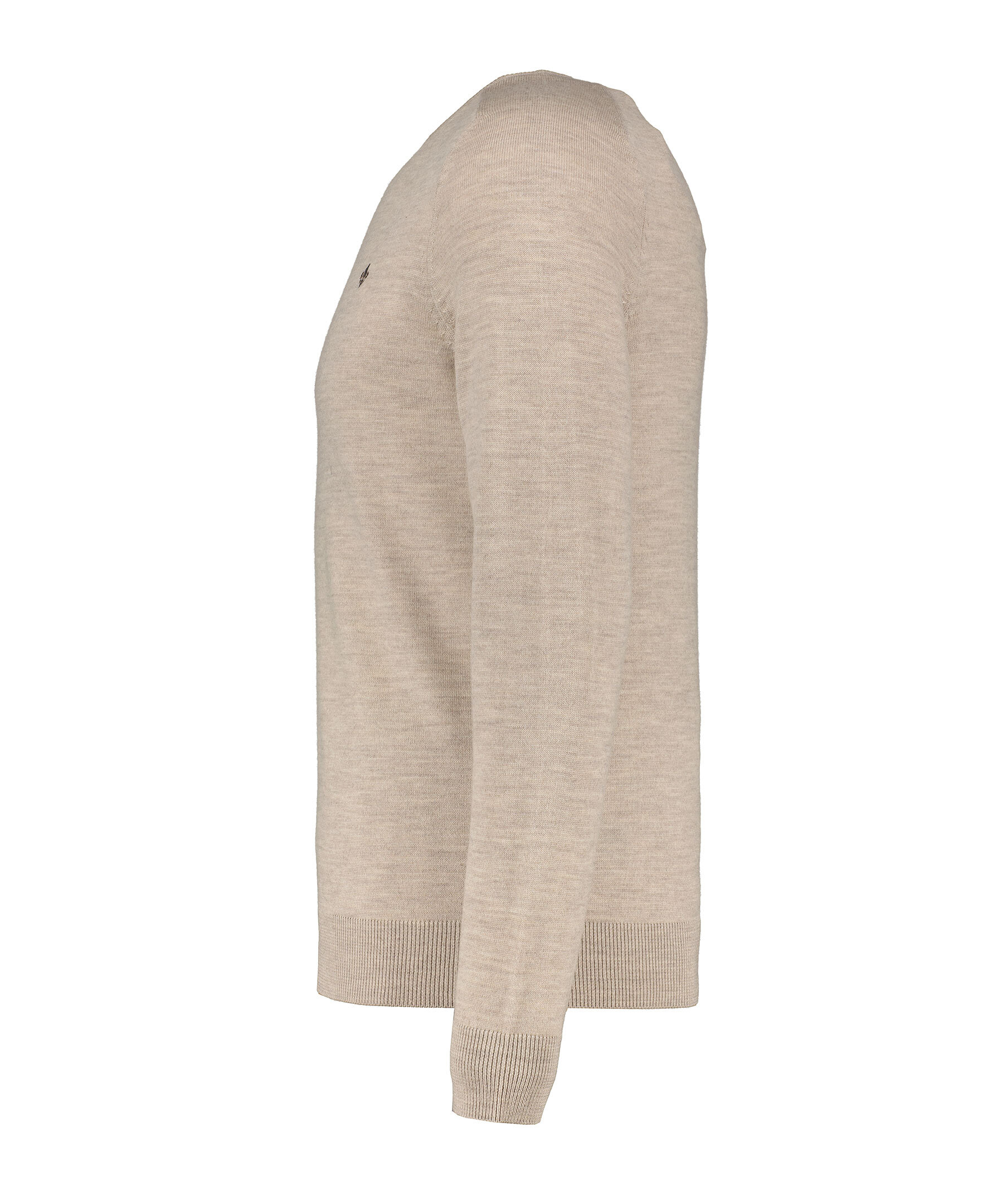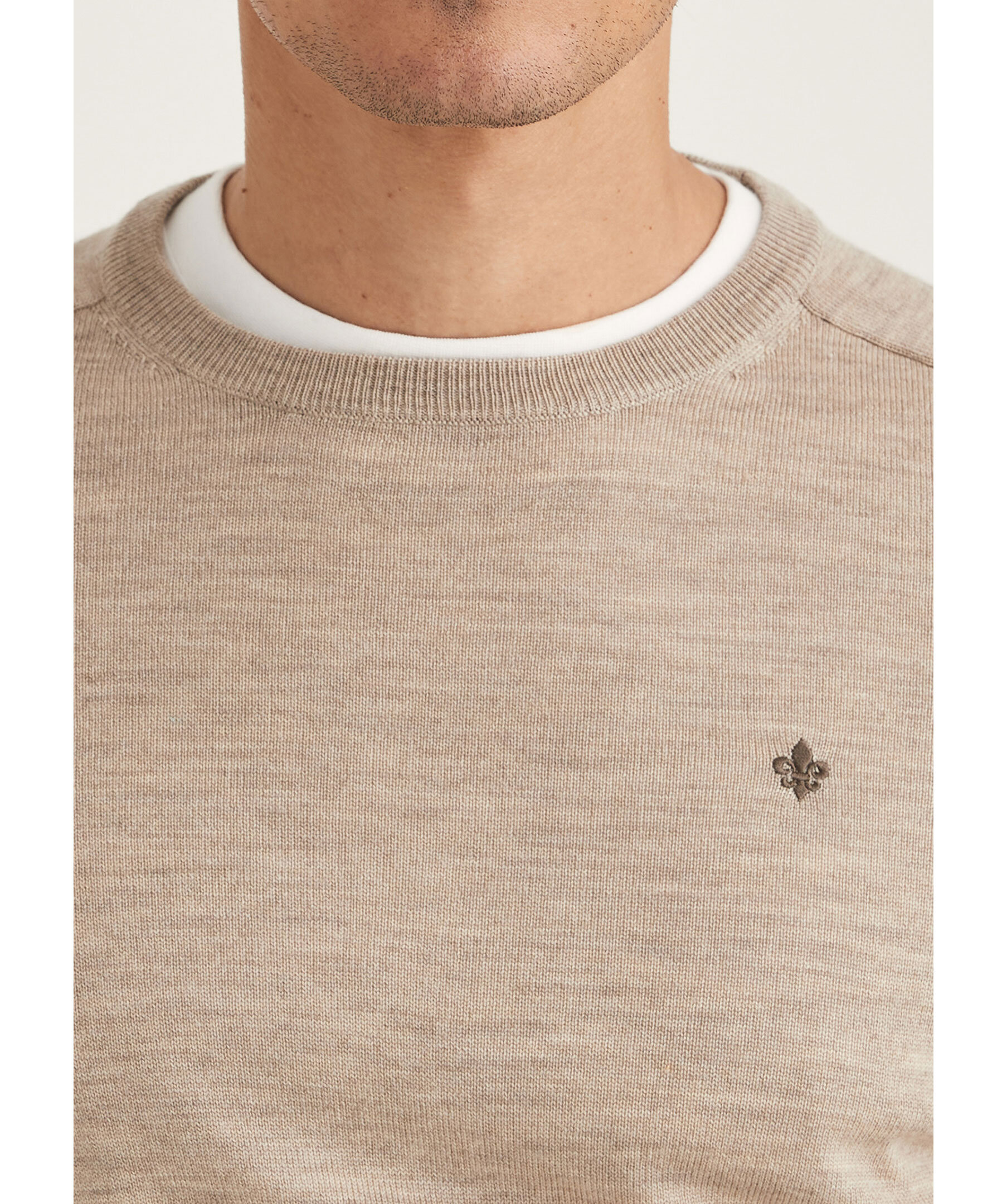Khakifärgad finstickad pullover från Morris. Tröjan har rund halsringning, ribbstickade muddar och en broderad lilja på bröstet. Tillverkad i merinoull.