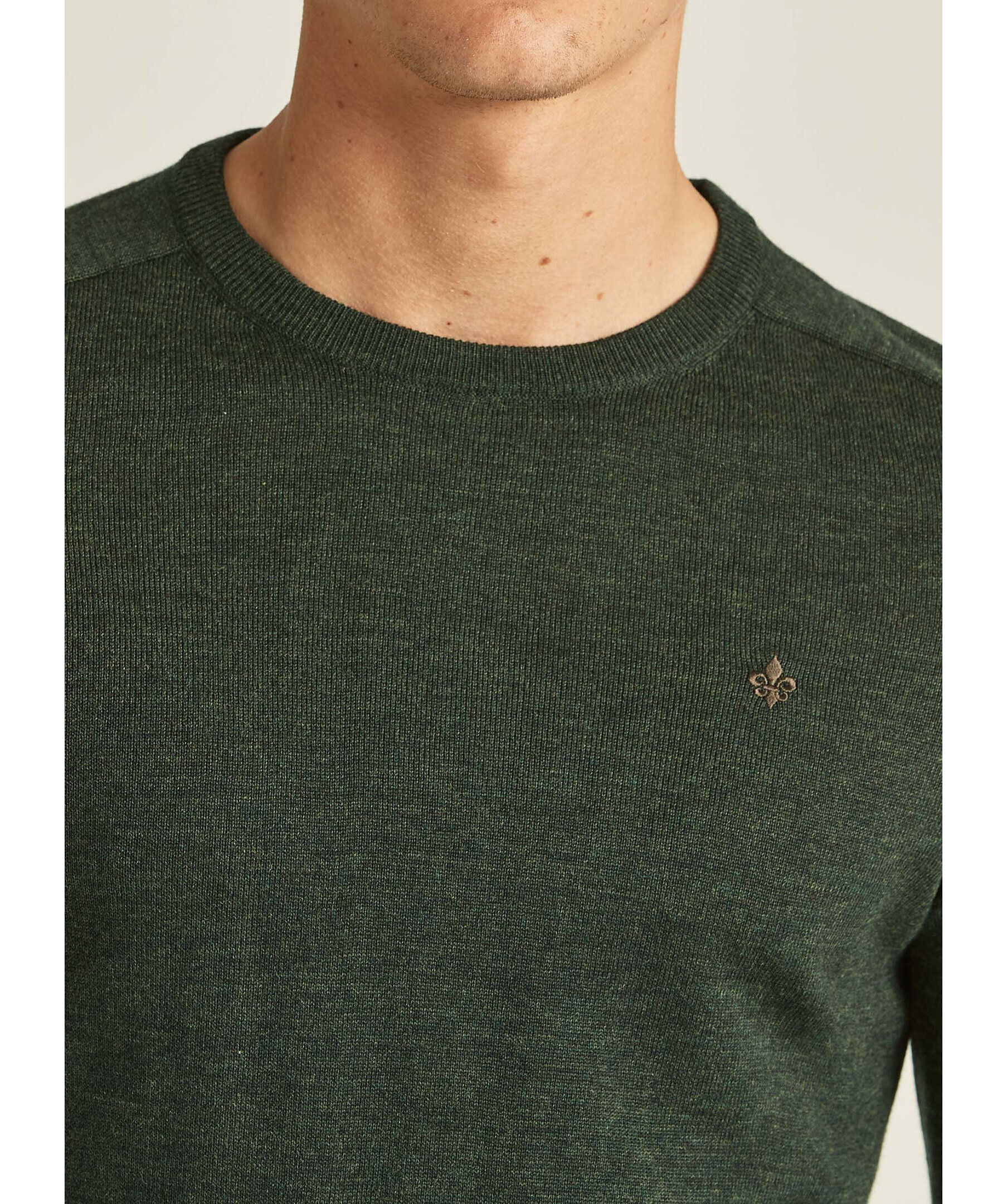 Olivgrön finstickad pullover från Morris. Tröjan har rund halsringning, ribbstickade muddar och en broderad lilja på bröstet. Tillverkad i merinoull.