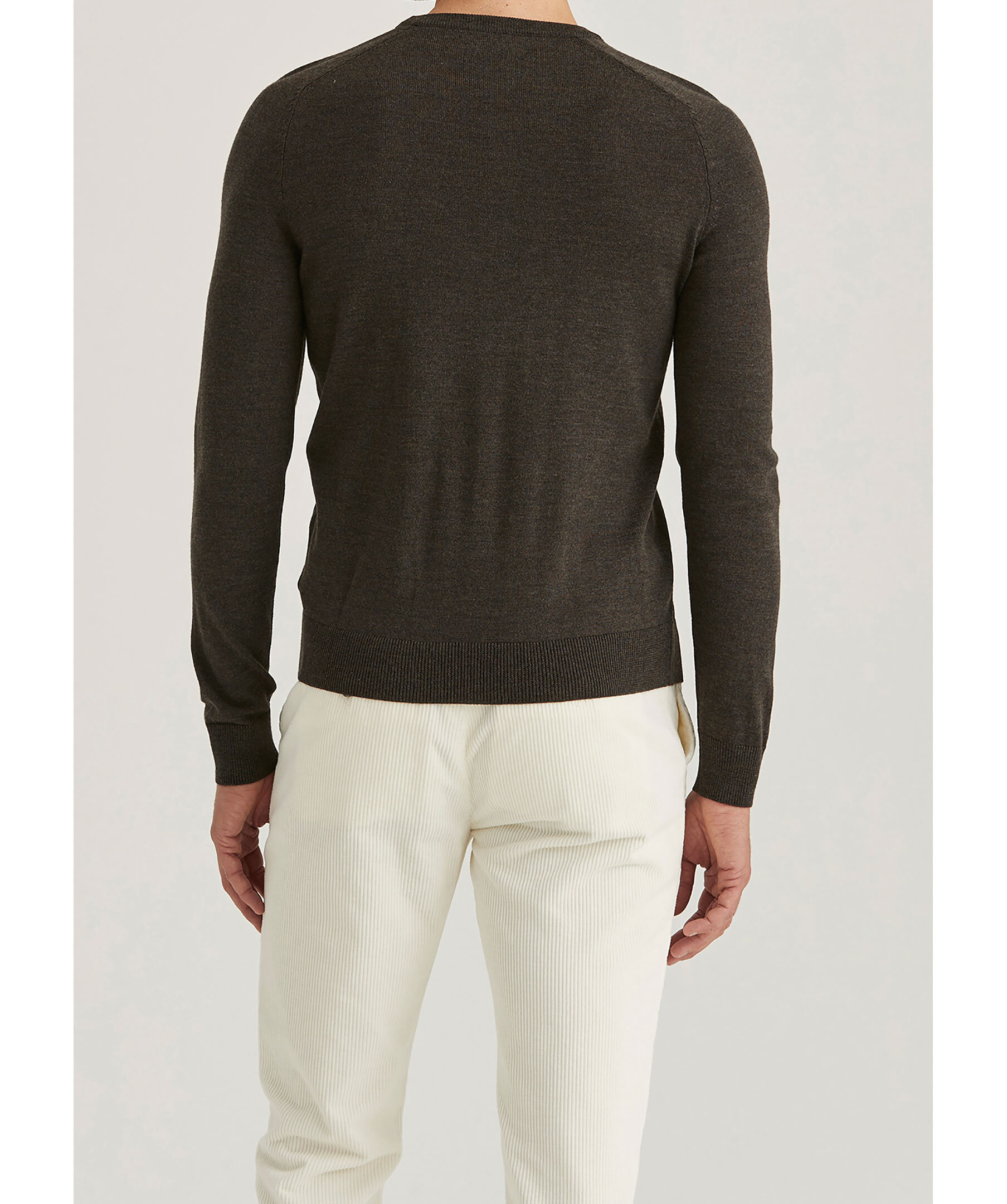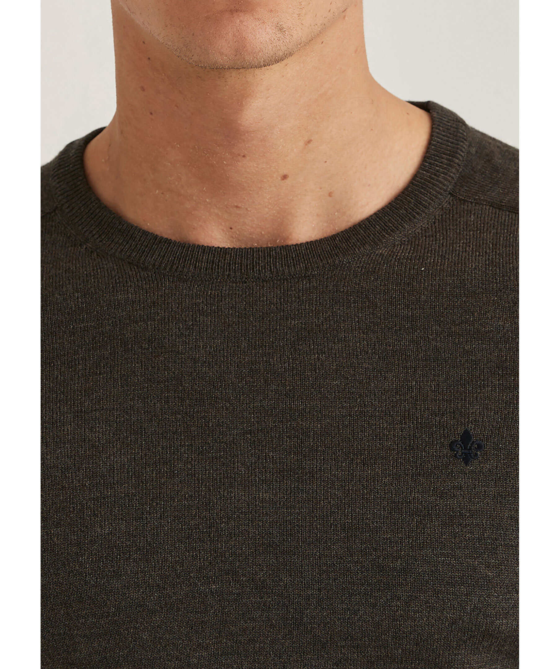 Mörkbrun finstickad pullover från Morris. Tröjan har rund halsringning, ribbstickade muddar och en broderad lilja på bröstet. Tillverkad i merinoull.