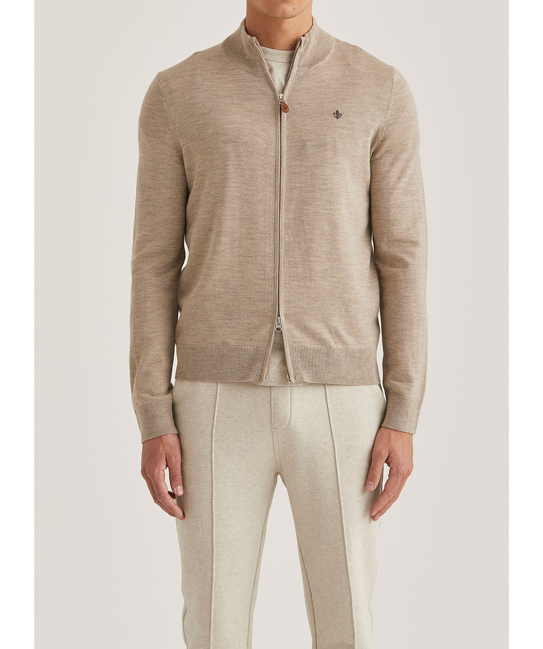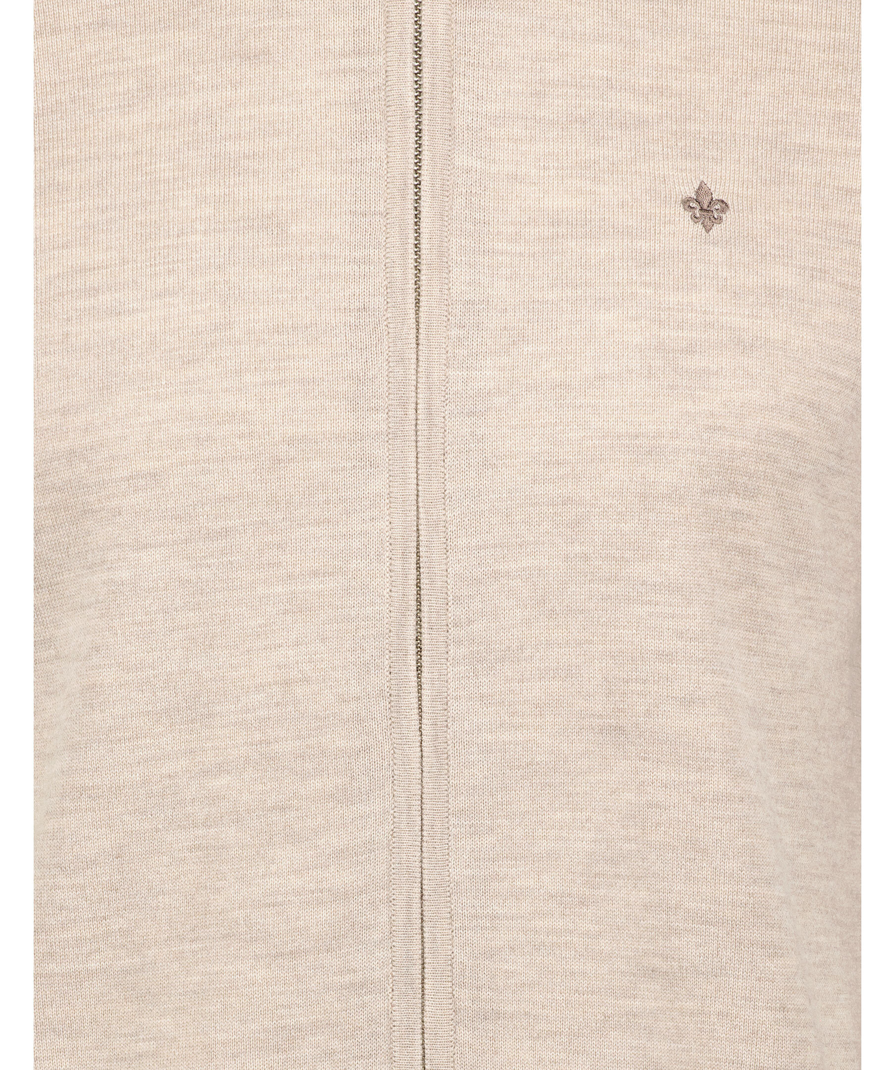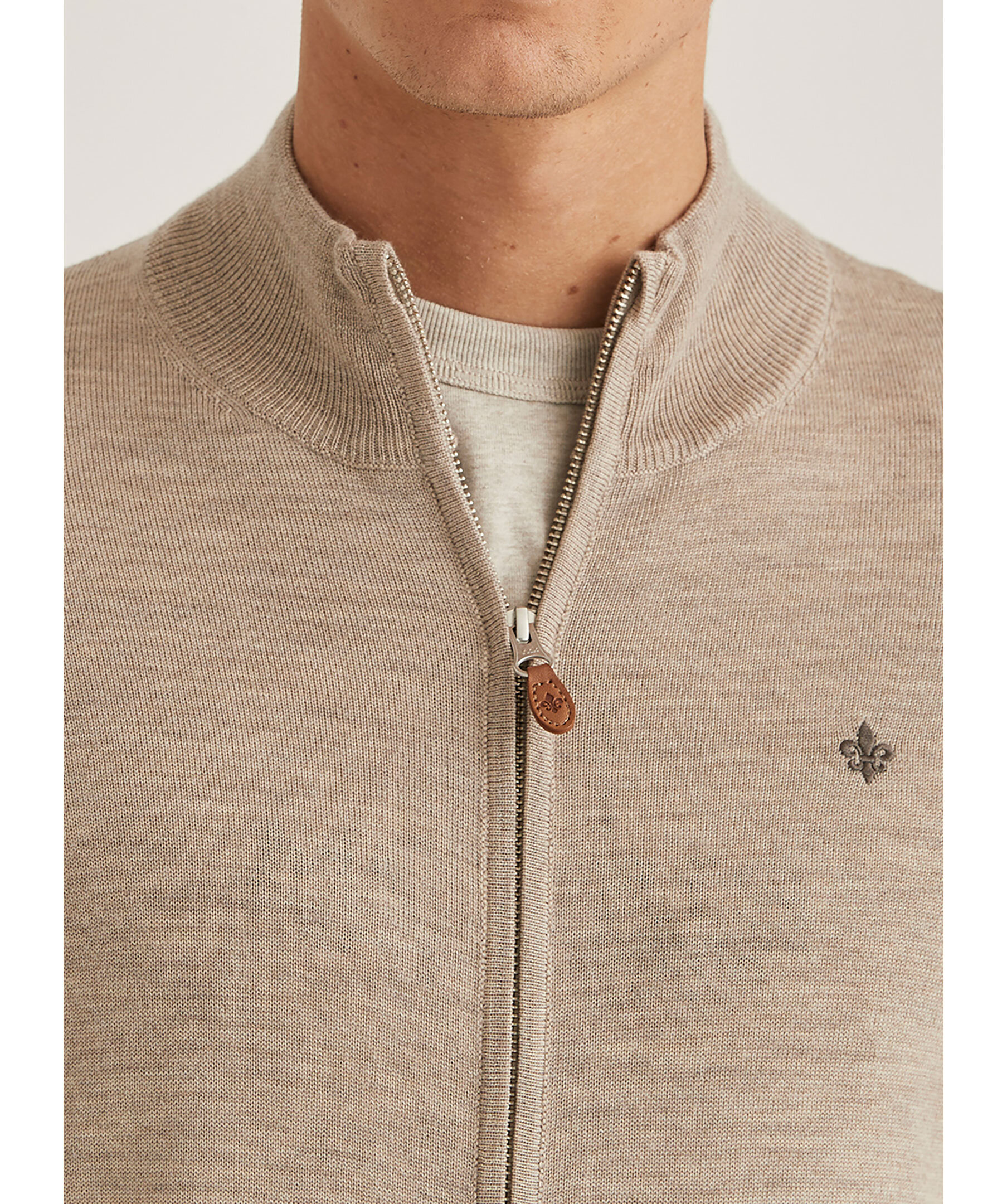 Beige finstickad cardigan från Morris. Gjord i 100% merinoull. Broderad lilja på bröstet och ribbstickade muddar. Cardigan stängs med en tvåvägsdragkedja. Smal passform.