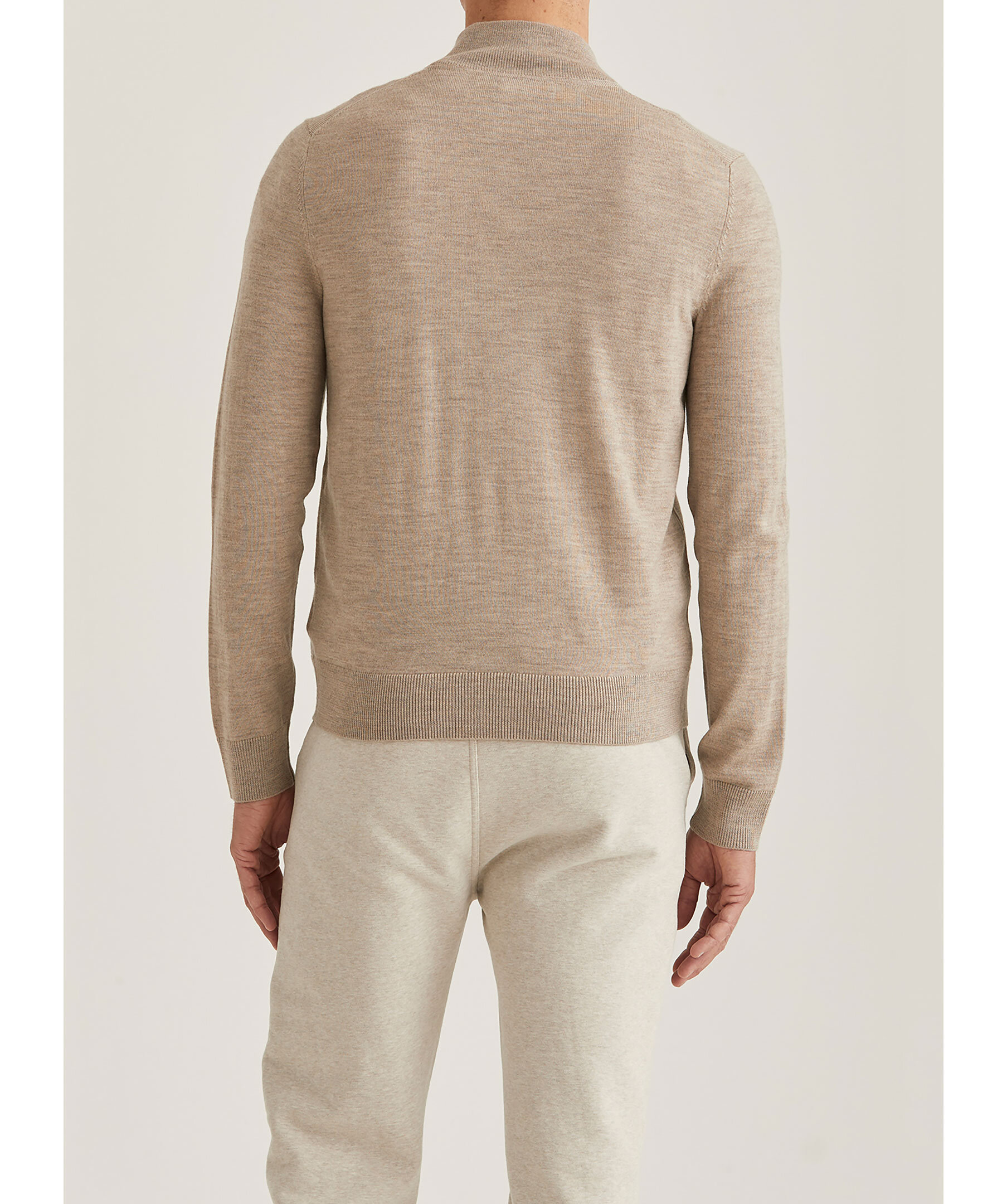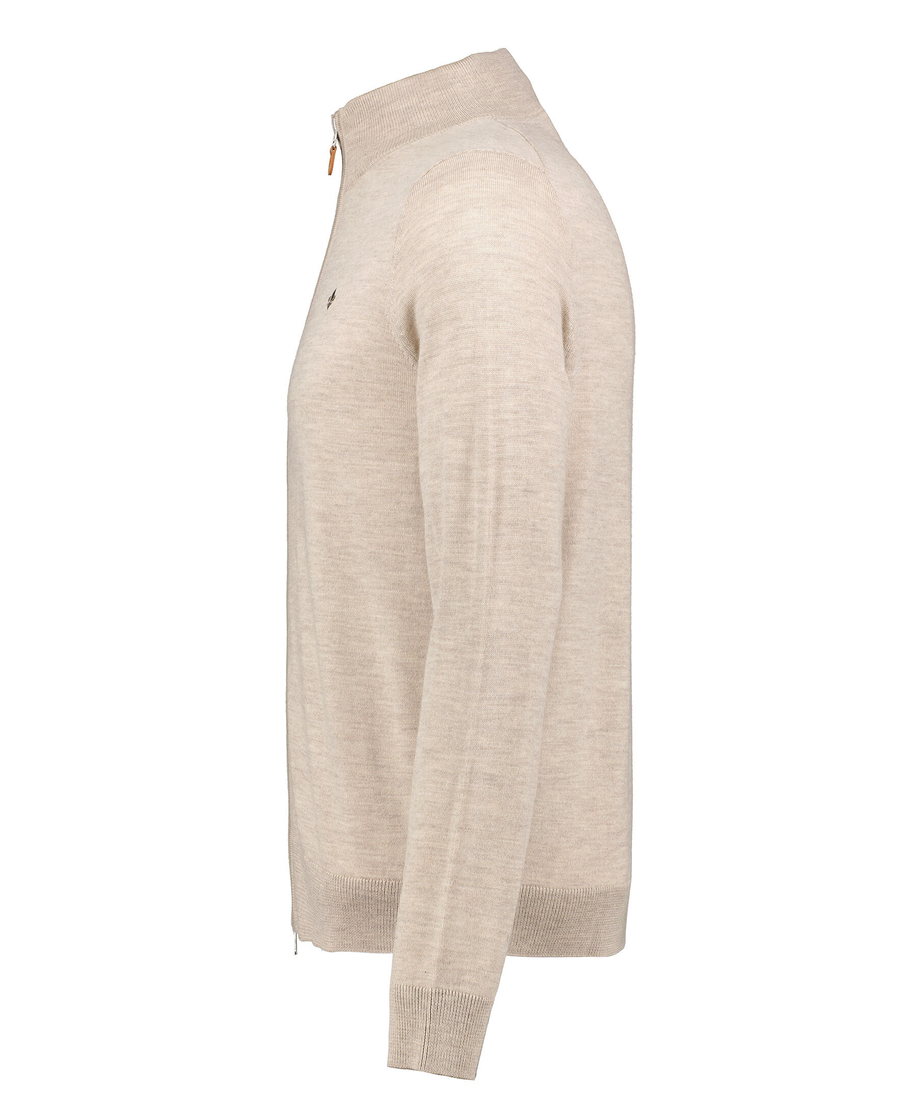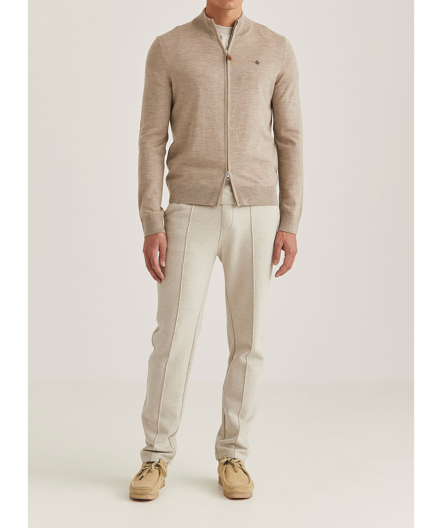 Beige finstickad cardigan från Morris. Gjord i 100% merinoull. Broderad lilja på bröstet och ribbstickade muddar. Cardigan stängs med en tvåvägsdragkedja. Smal passform.