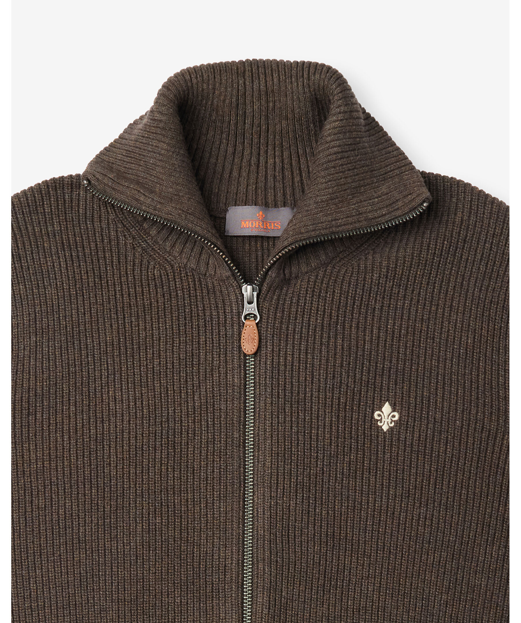 Brun, stickad cardigan från Morris. Koftan stängs med tvåvägsdragkedja och har en hög ribbstickad krage samt ribbstickade muddar vid ärm- och plaggslut. Broderad logotyp på bröstet. Tillverkad i bomull.