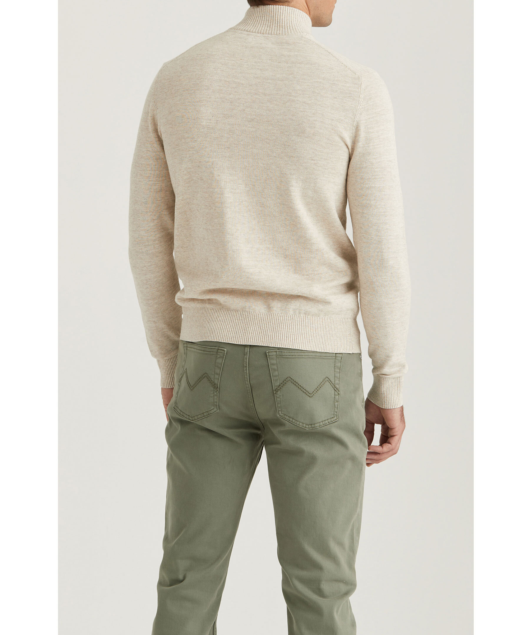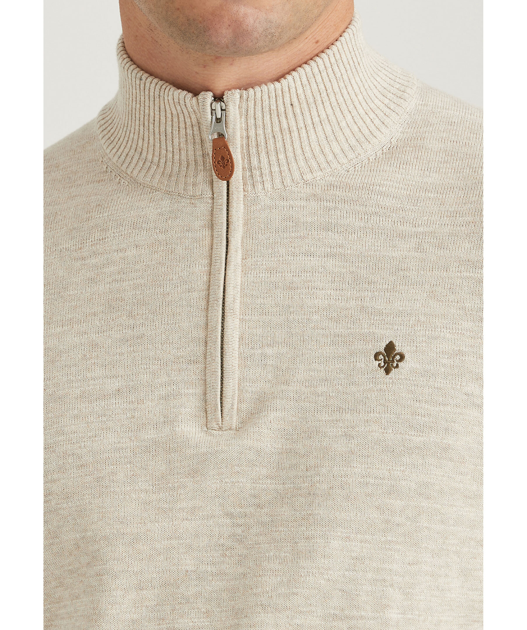 Beige melerad half-zip från Morris. Broderad logotyp på vänster bröst. Ribbstickad krage, muddar vid ärm- och plaggslut. Smal passform. Tillverkad i 100% bomull. Dragkedja med läder detalj med embossad logotyp.