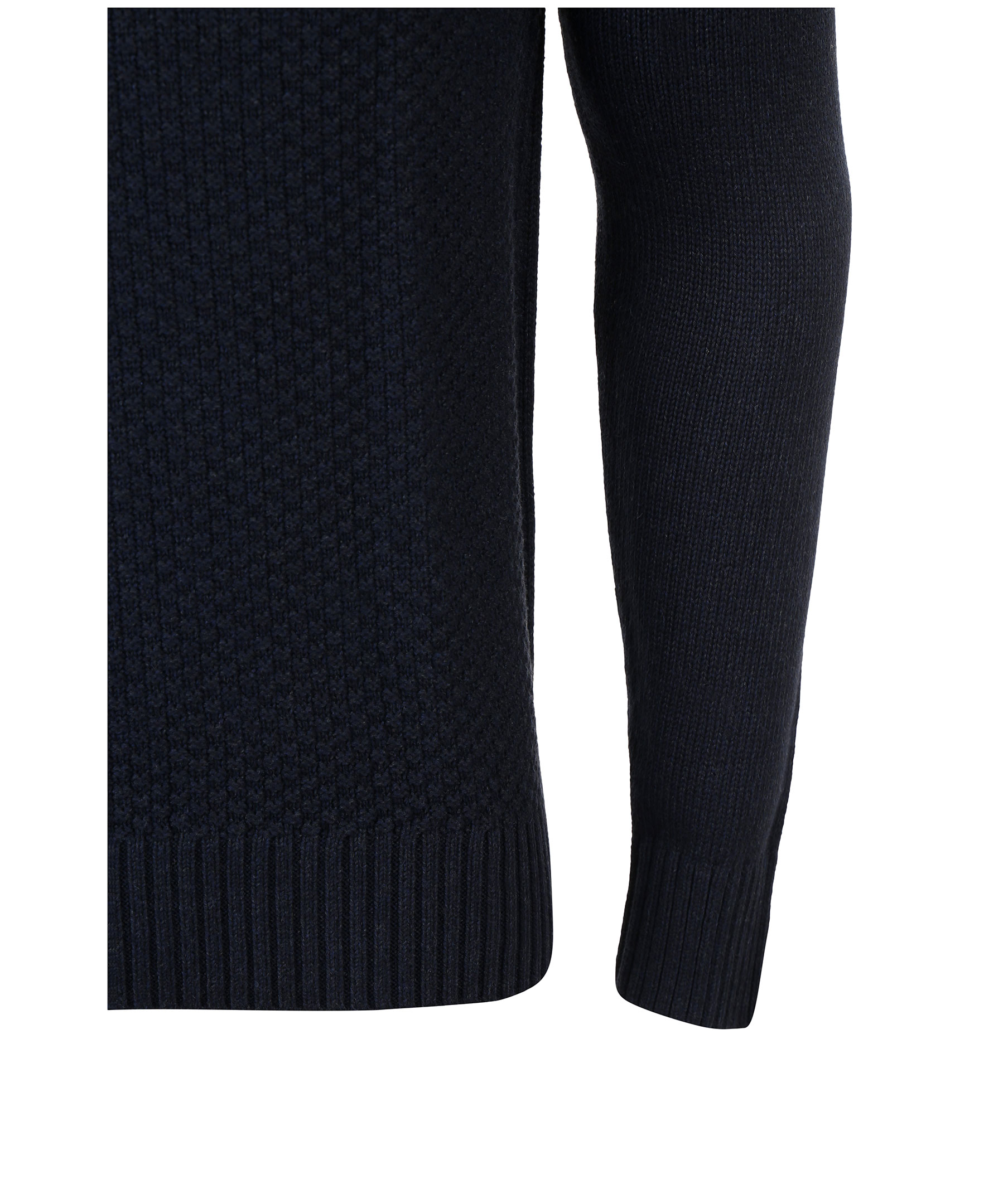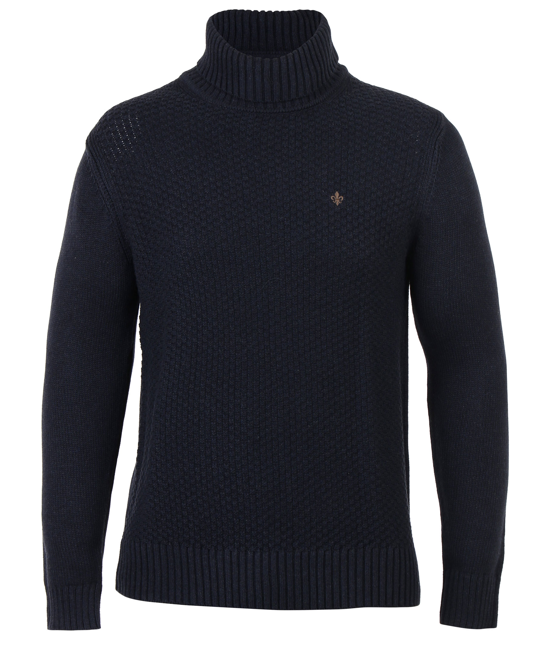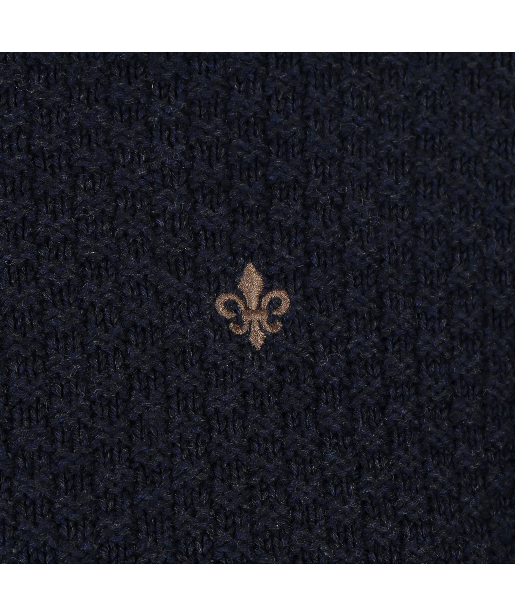 Mörkblå stickad polotröja från Morris. Tillverkad i 100% bomull. Broderad logotyp på bröstet och ribbade muddar i ärmslut, krage och plaggslut.