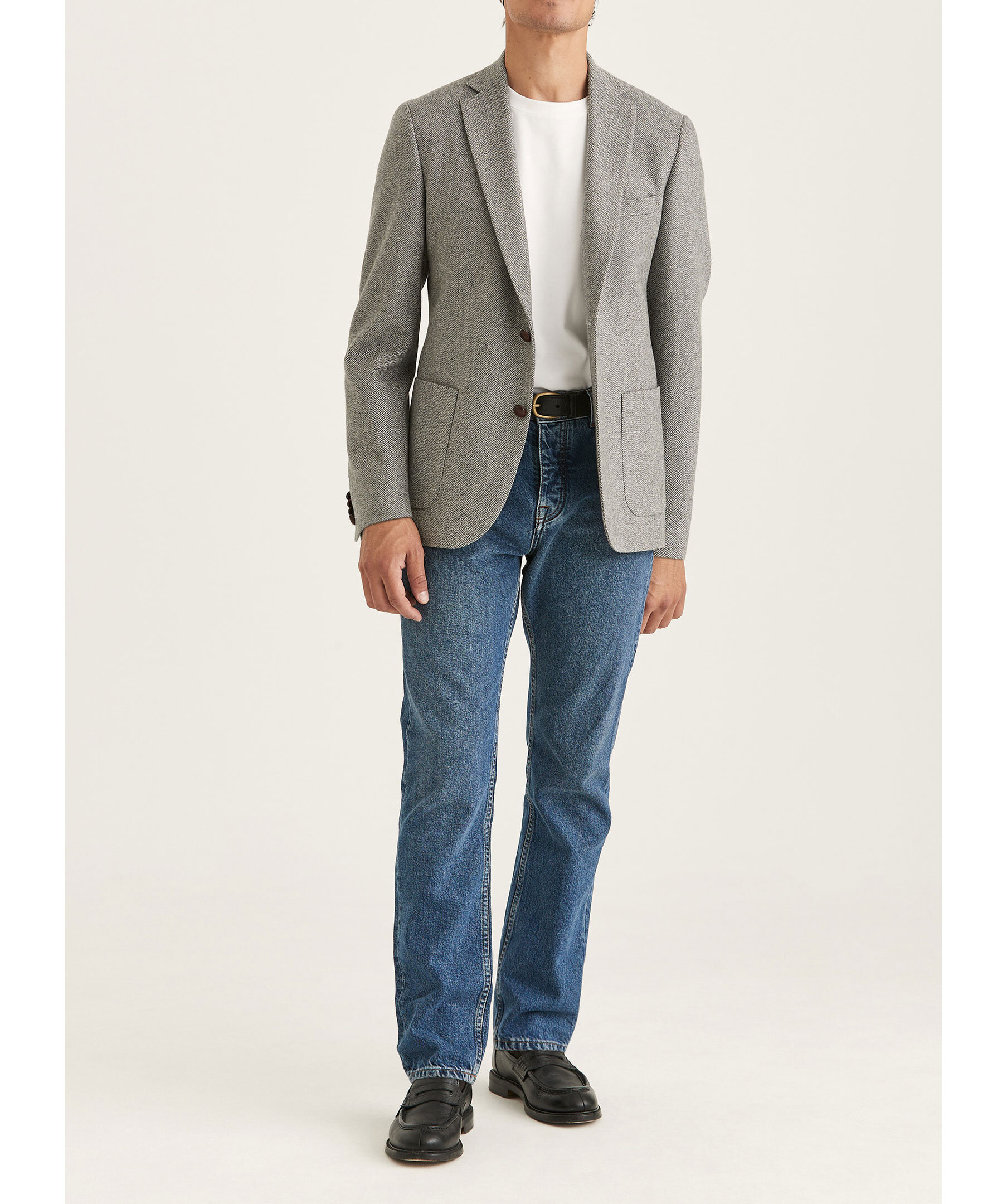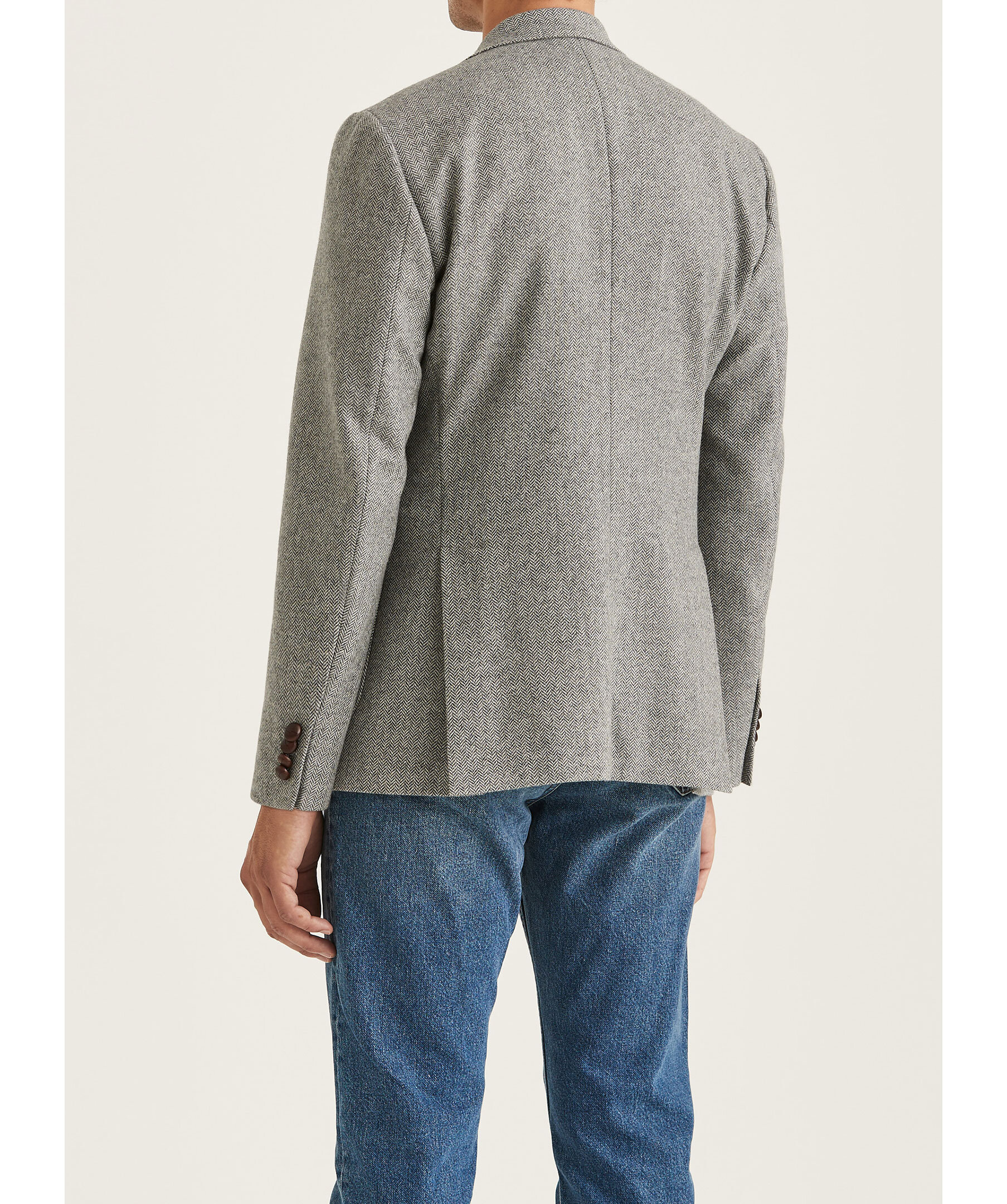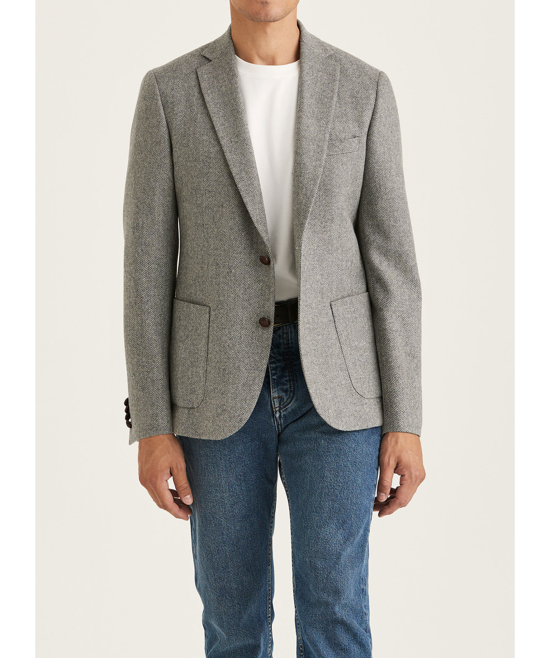 Grå kavaj med fiskbensmönster från Morris. Kavajen är halvfodrad och stängs med två knappar framtill. Den har dubbelt sprund baktill, två påsydda fickor samt en passpoalficka på bröstet. Tillverkad i en ullblandning.