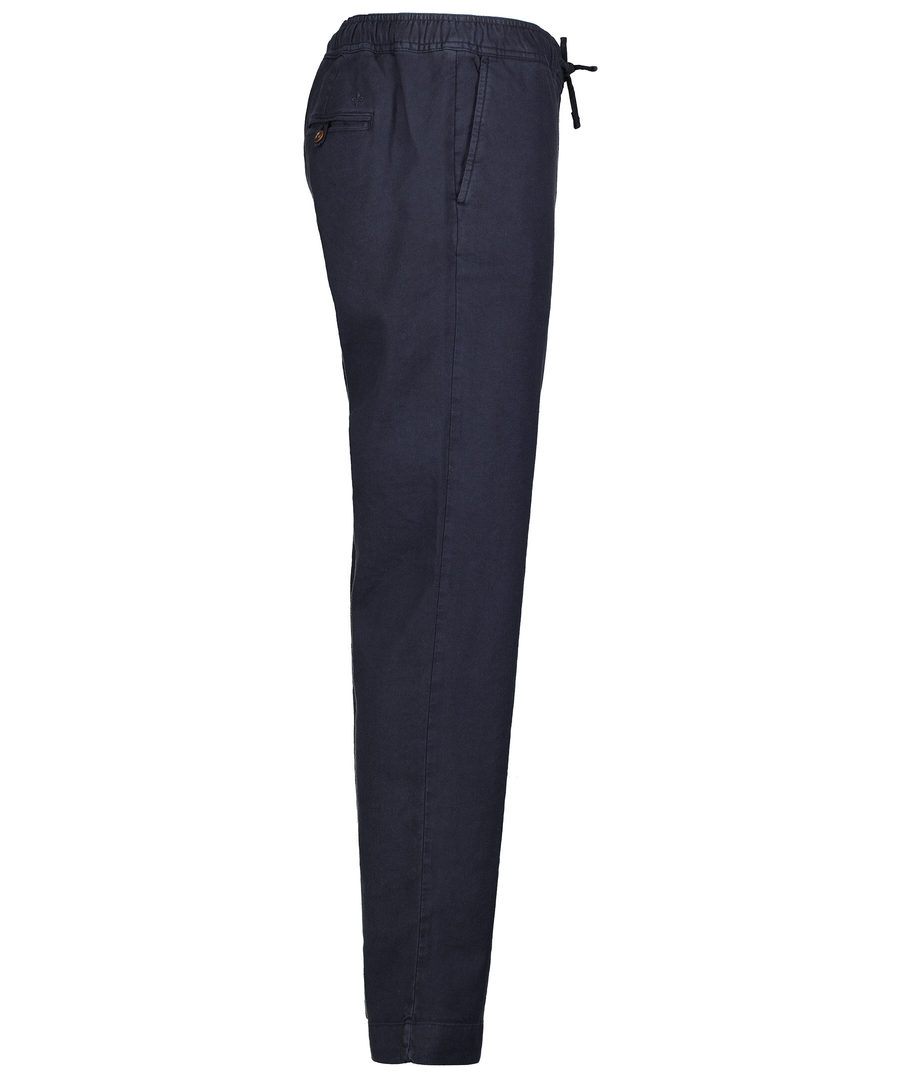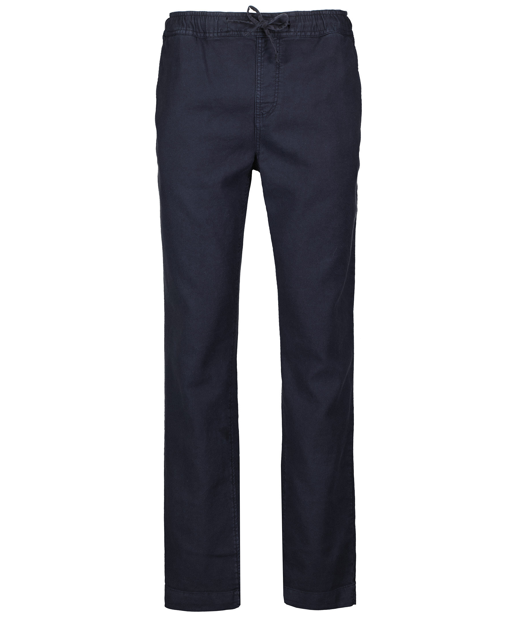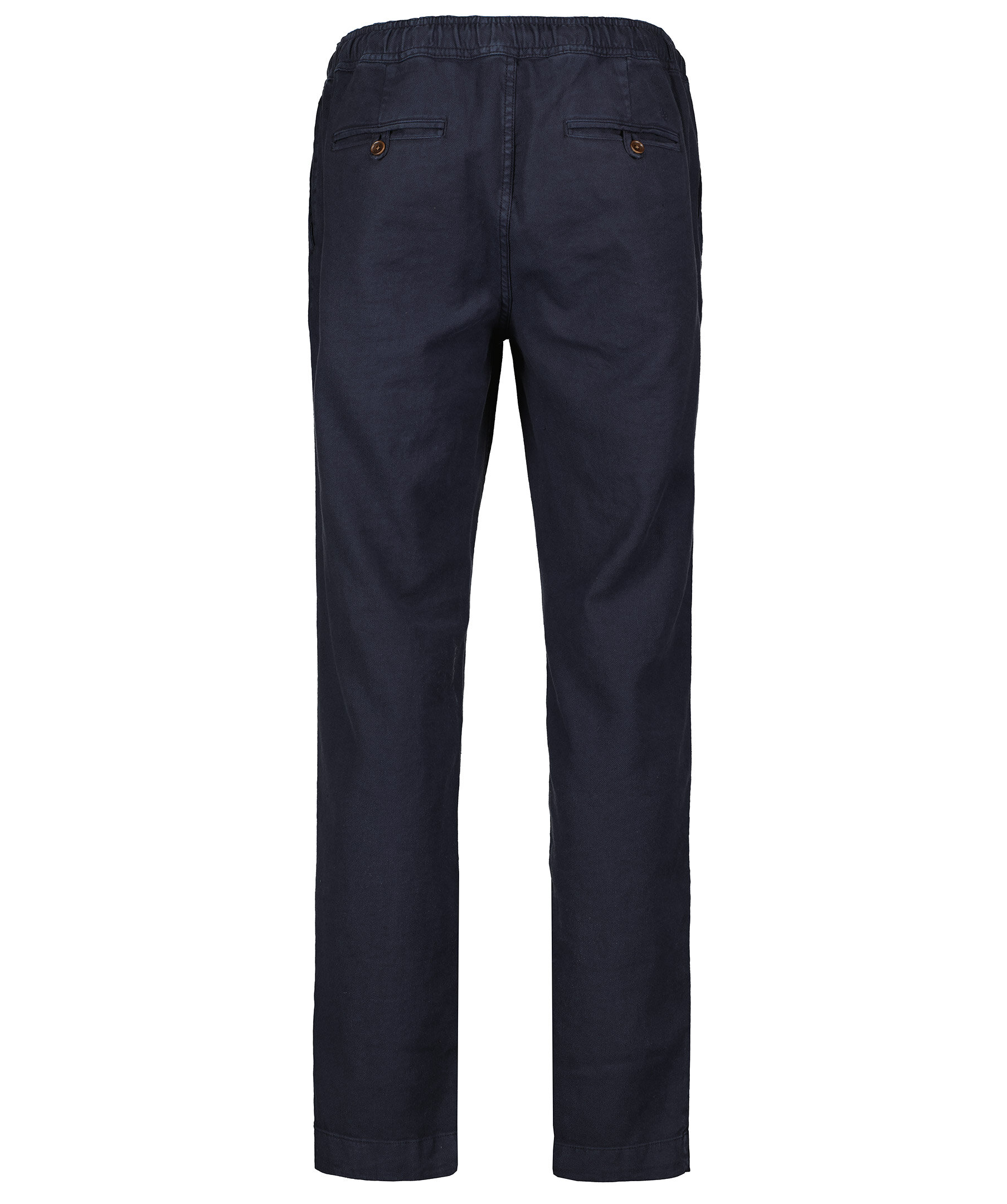 Mörkblå byxor från Morris. Tillverkade i Linne och bomullsblandning. Resår och dragsko i midjan. Två fickor framtill, bakfickor som stängs med knapp.