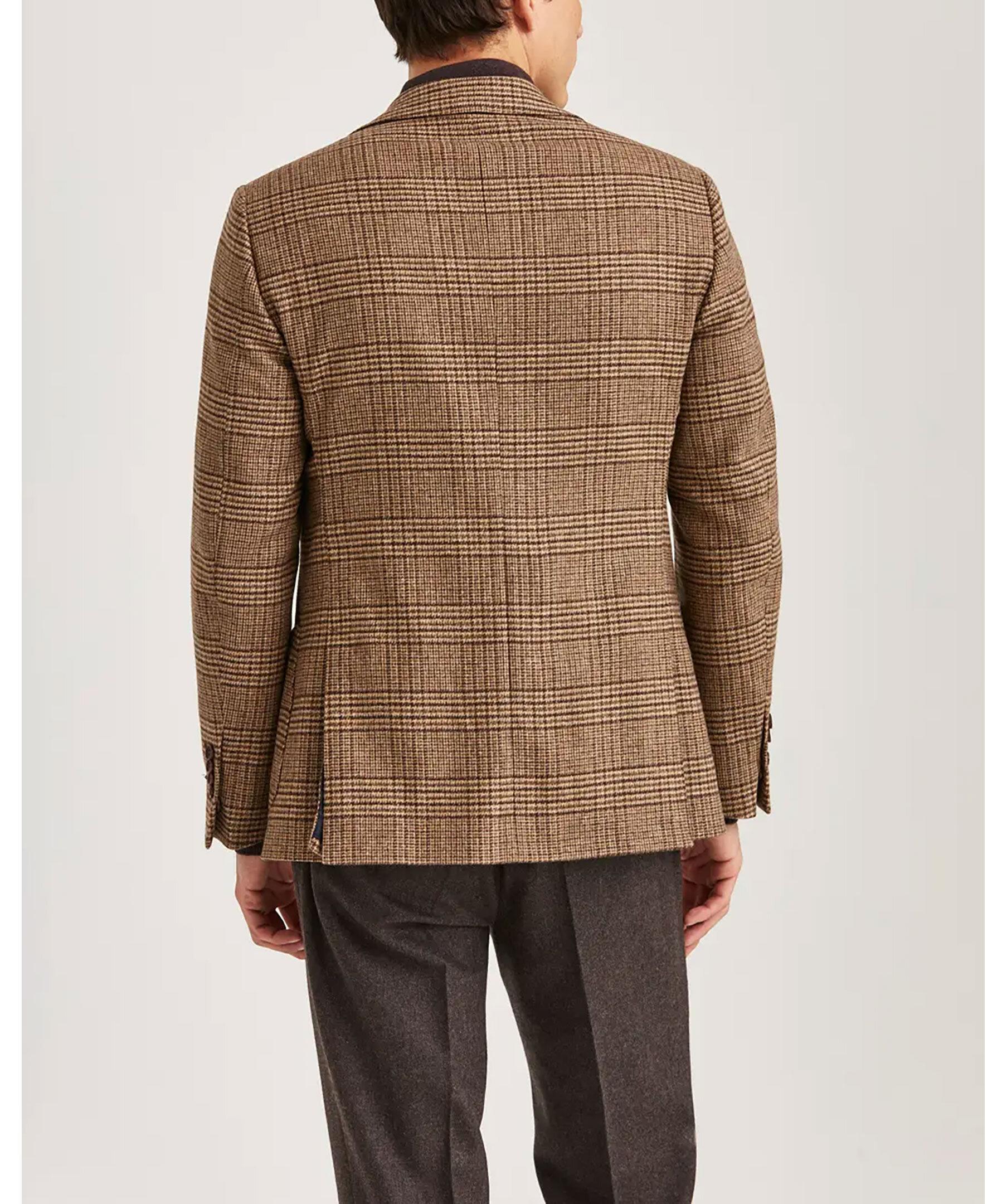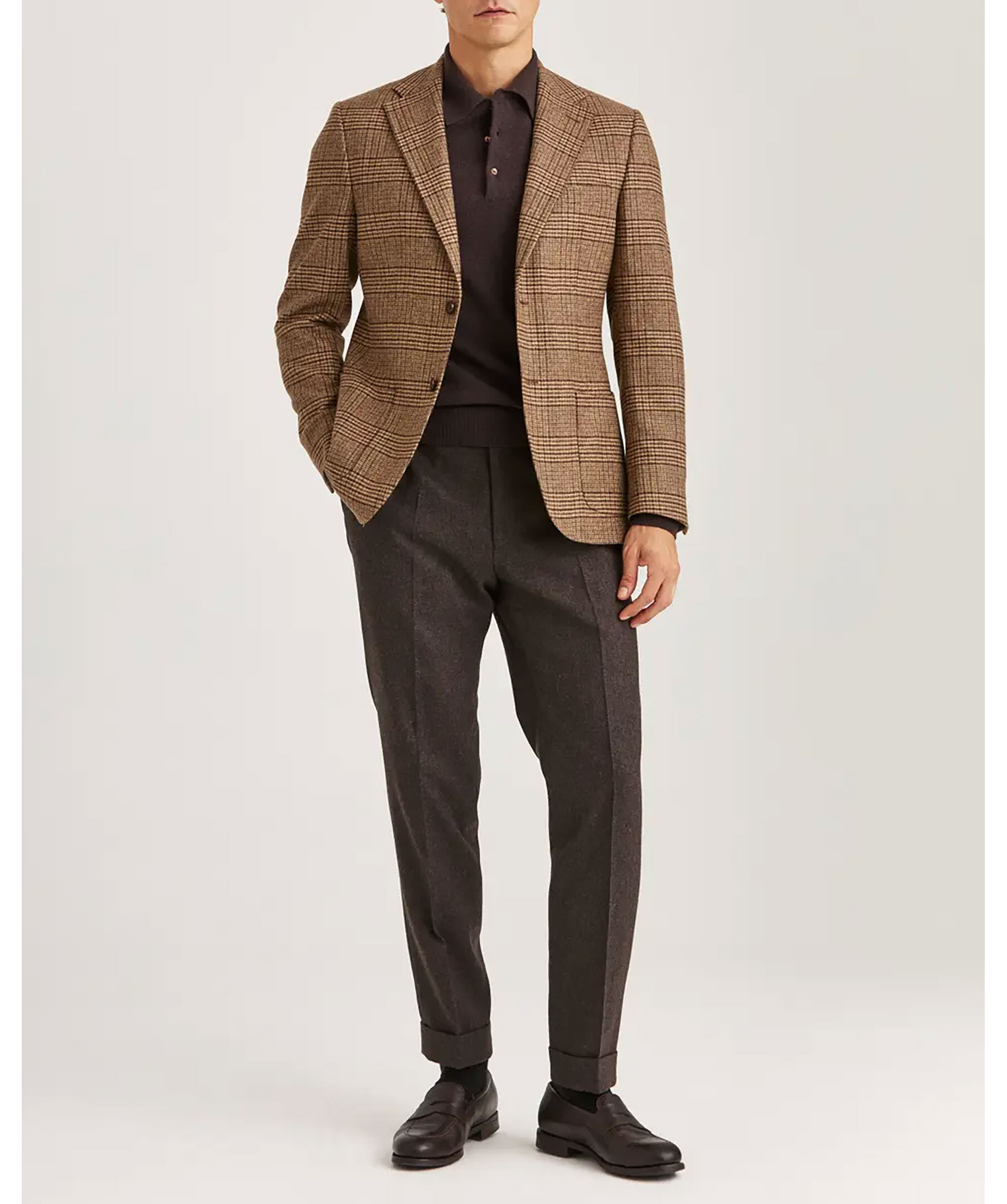 Rutig kavaj från Morris i en exklusiv ull- och silkesblandning, vävd av Ciatti i Italien. Tyget kombinerar ullens struktur med silkeslen känsla och ger en sofistikerad men avslappnad look. Bärs snyggt med en finstickad tröja och flanellbyxor för en stil som är elegant utan att bli för formell.