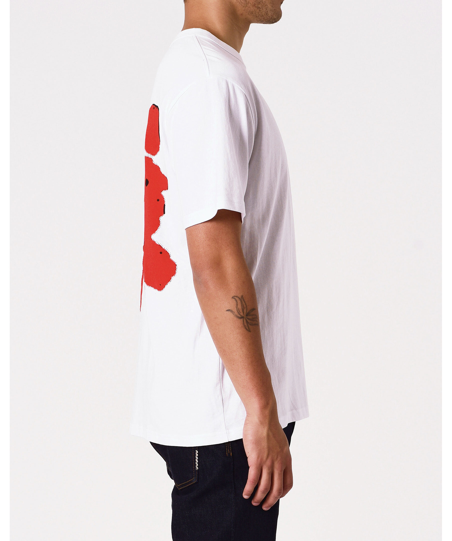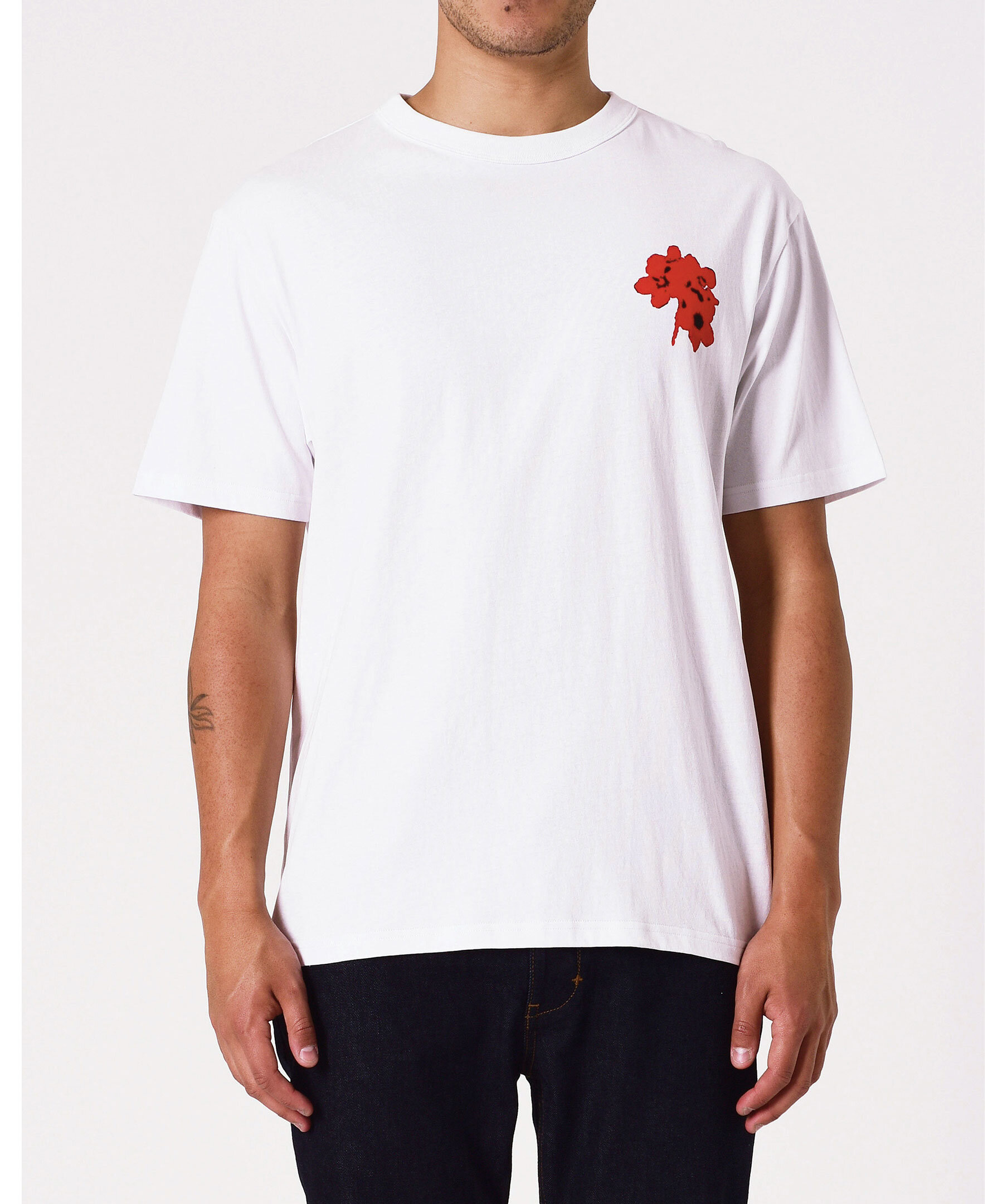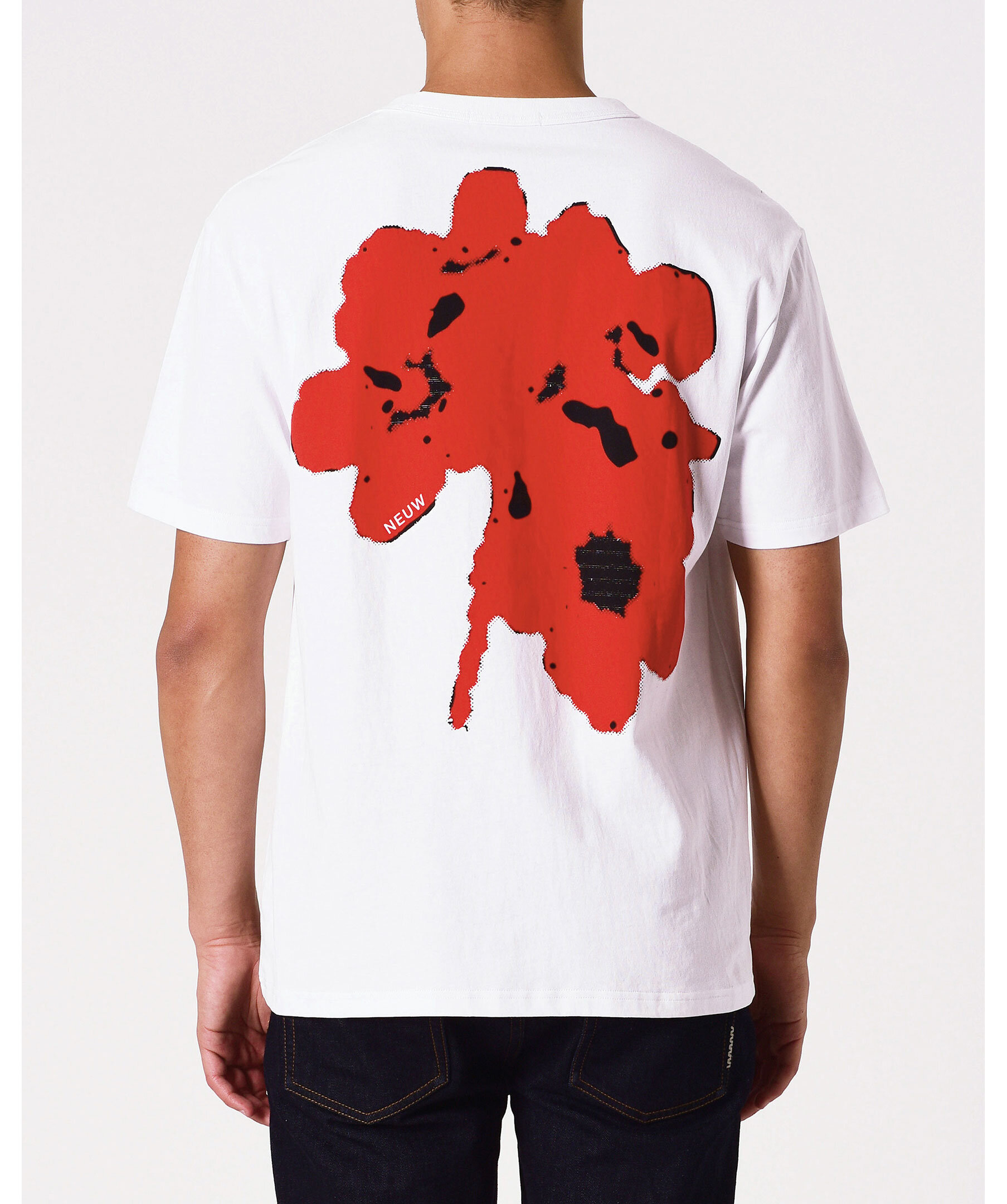 Vit t-shirt från Neuw. Tröjan har ett rött abstrakt blommönster på bröstet och ryggen. Tillverkad i premium bomullsjersey och har en avslappnad, boxig passform.