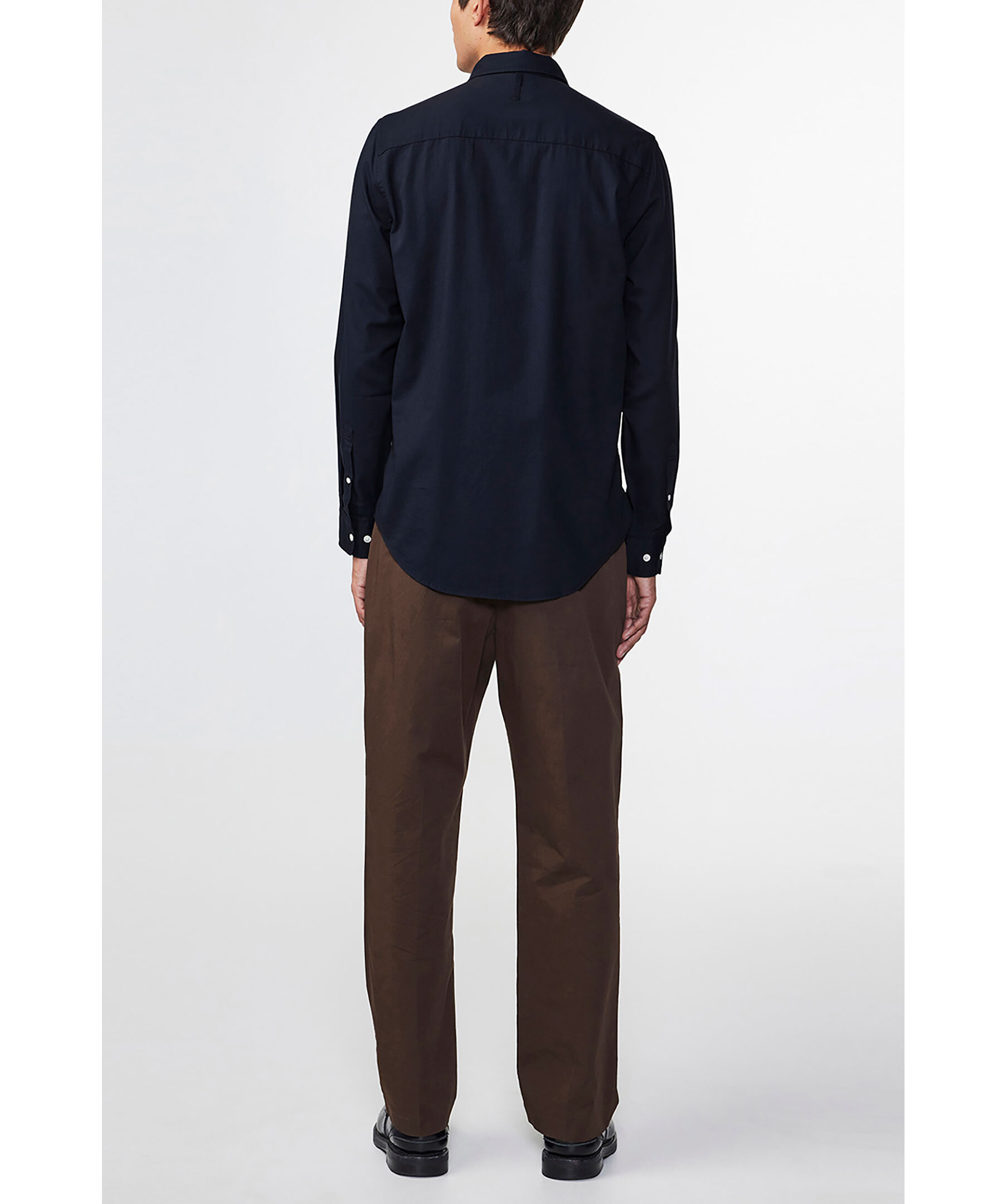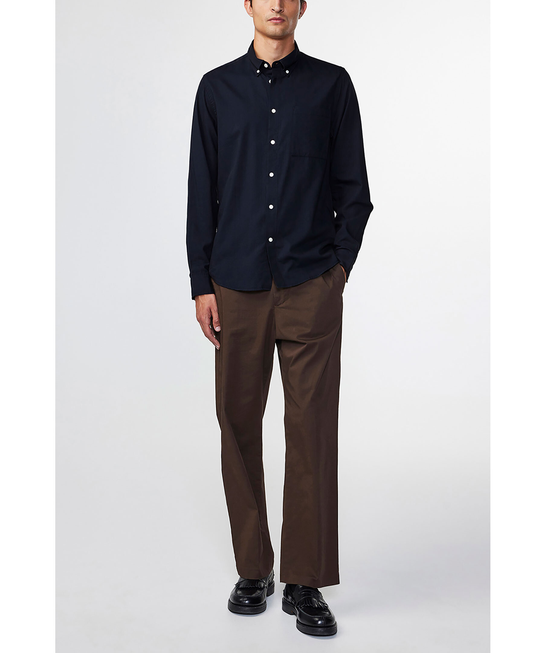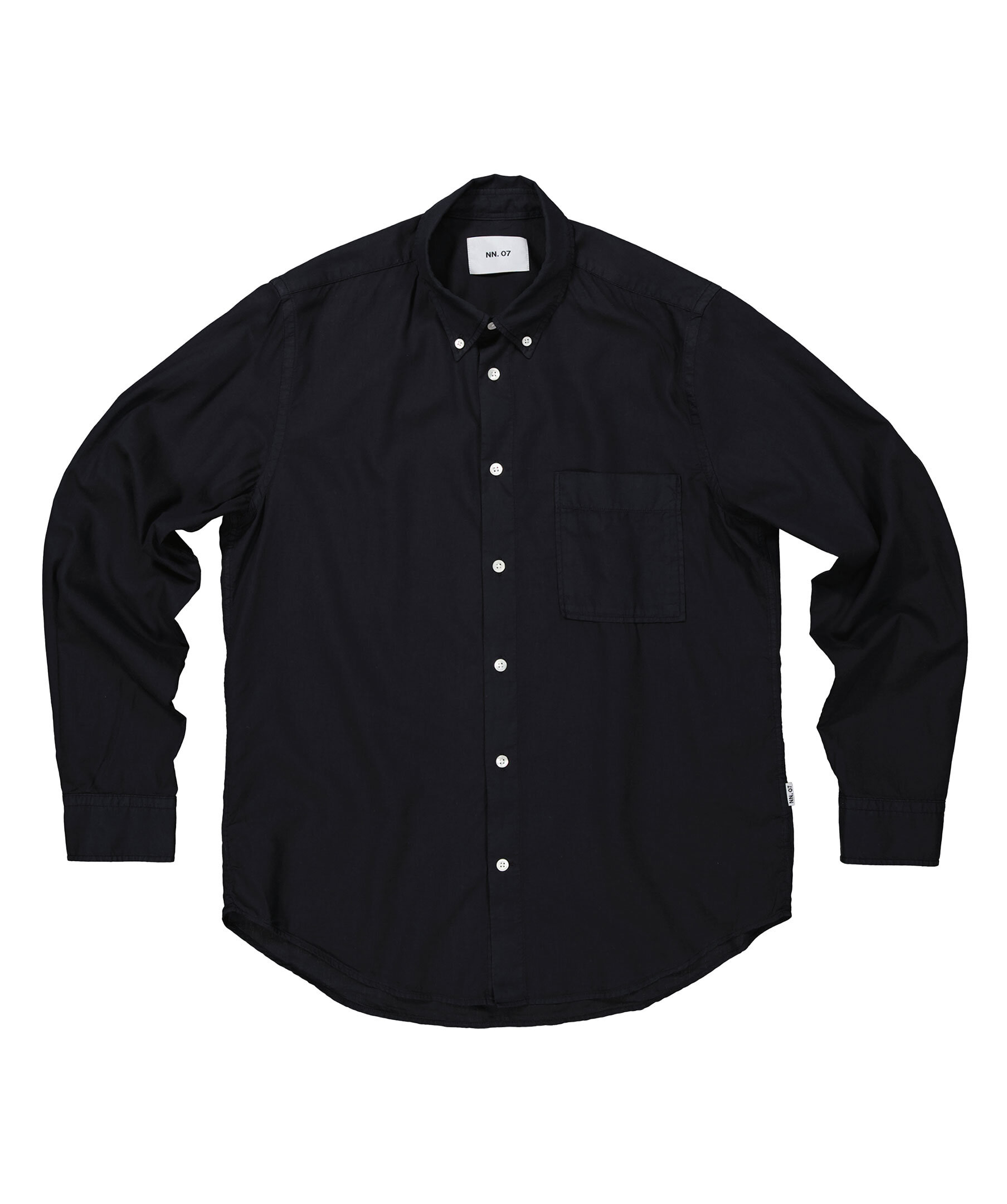 Svart skjorta från NN 07. Stängs framtill med knappar. Button-down krage. Bröstficka på vänster sida. Enkla manschetter. Tillverkad i bomulls blandning.