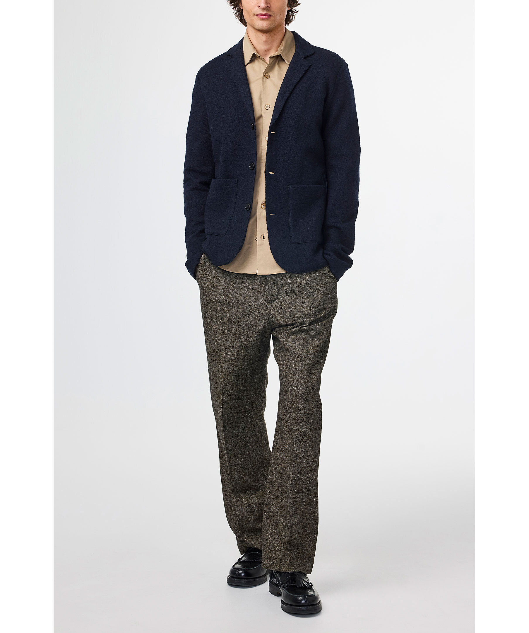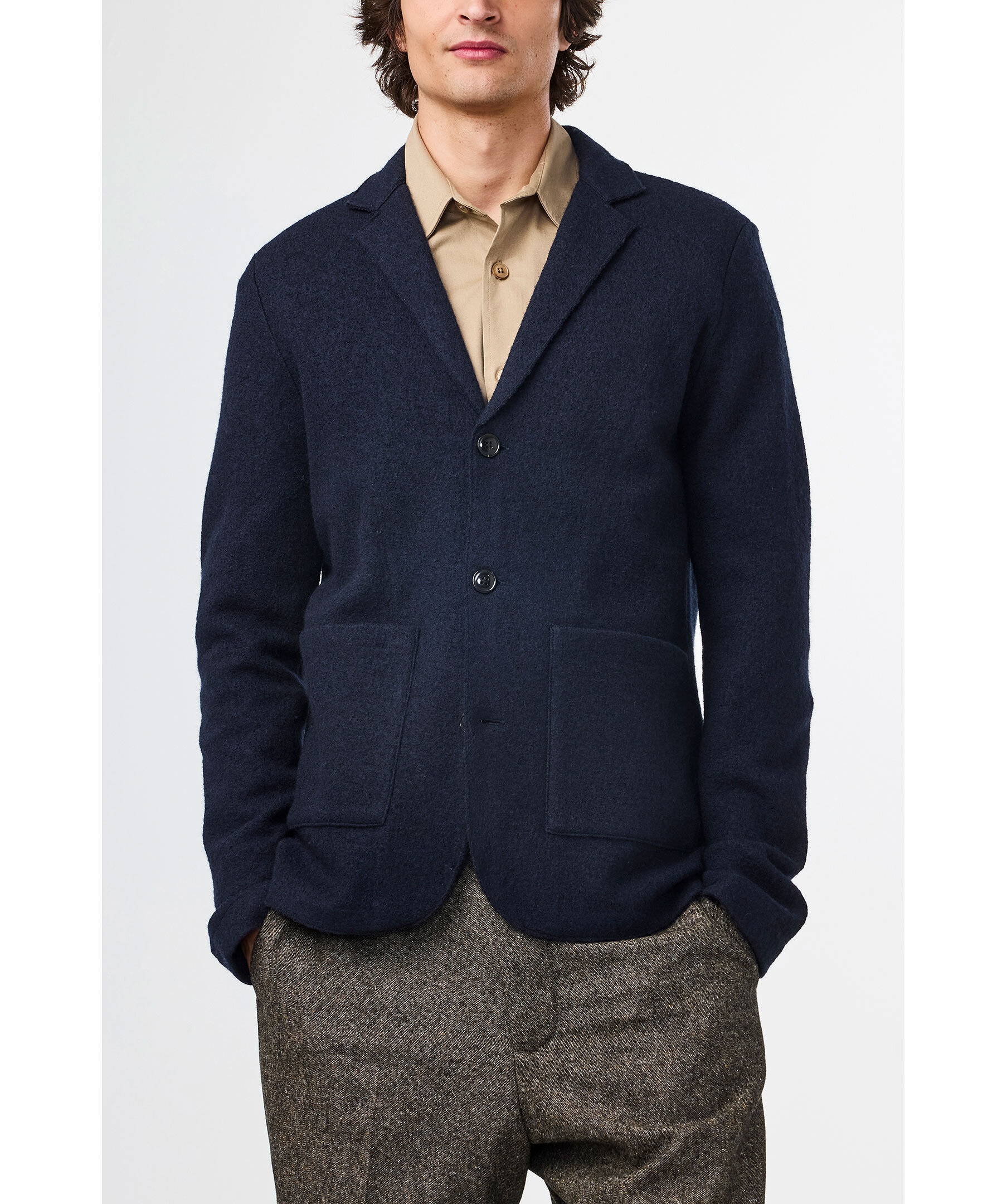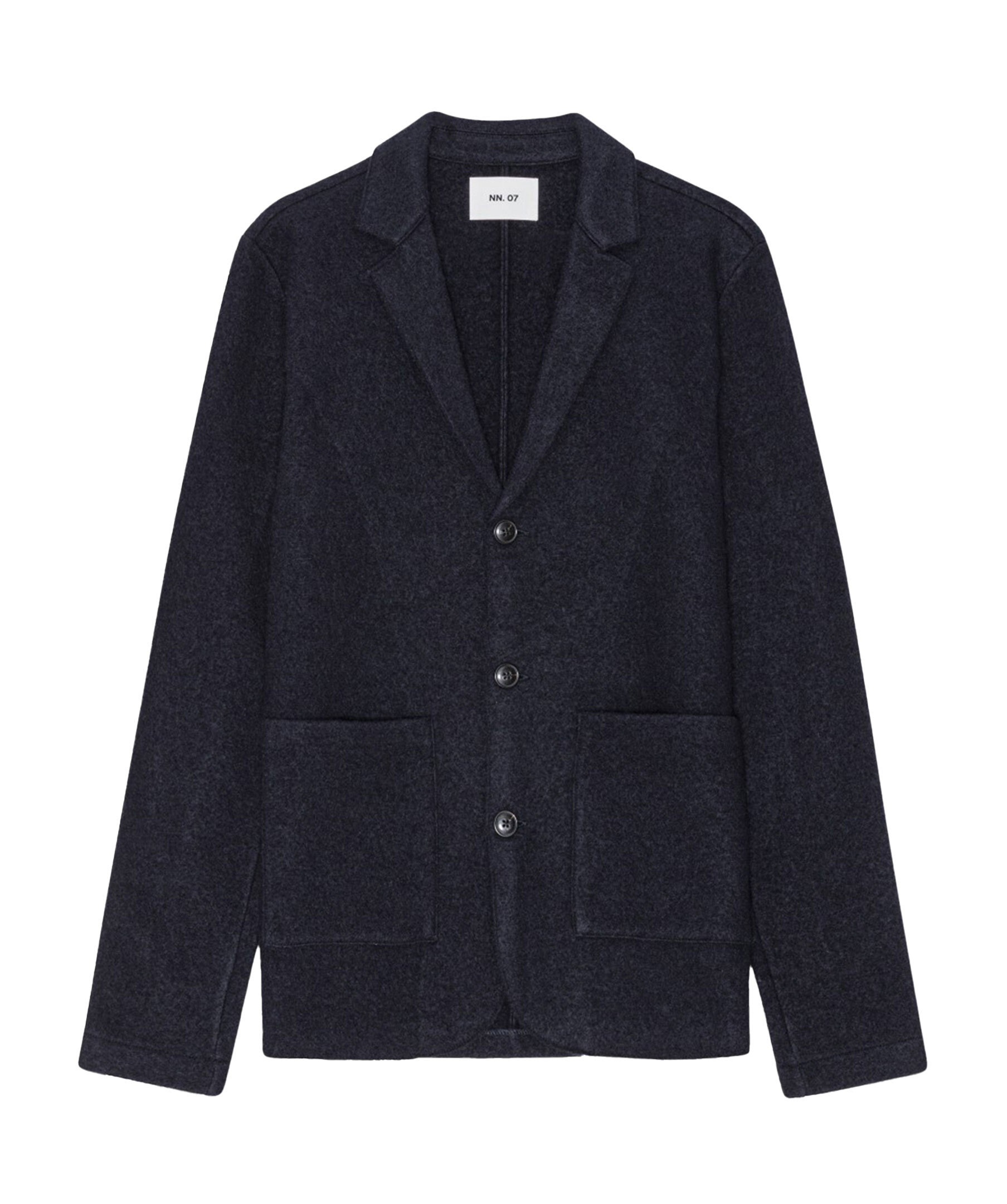 Mörkblå kavaj från NN 07. Kavajen stängs med knappstängning fram, har två påsydda framfickor och är tillverkad av mjuk och lätt merinoull.