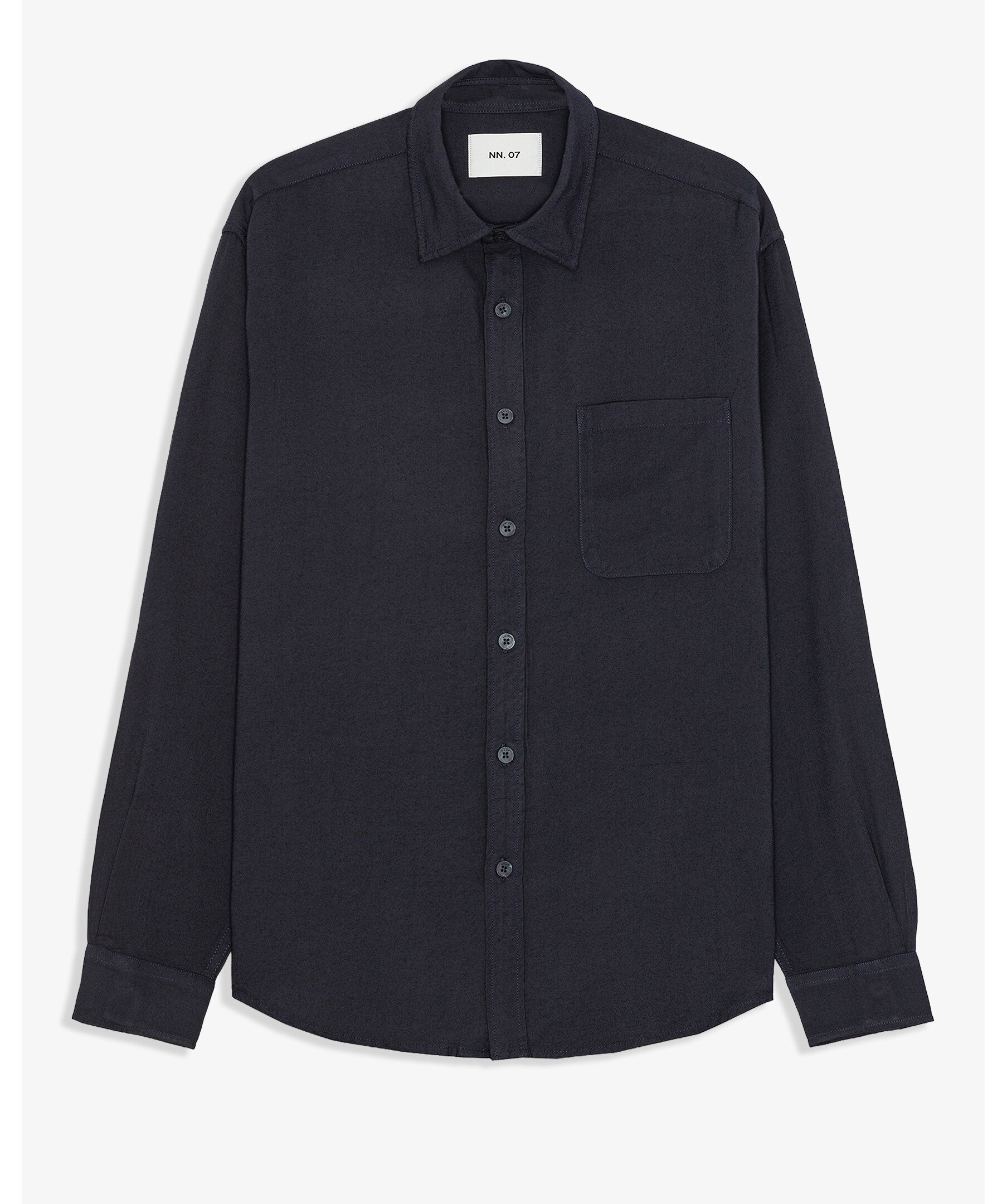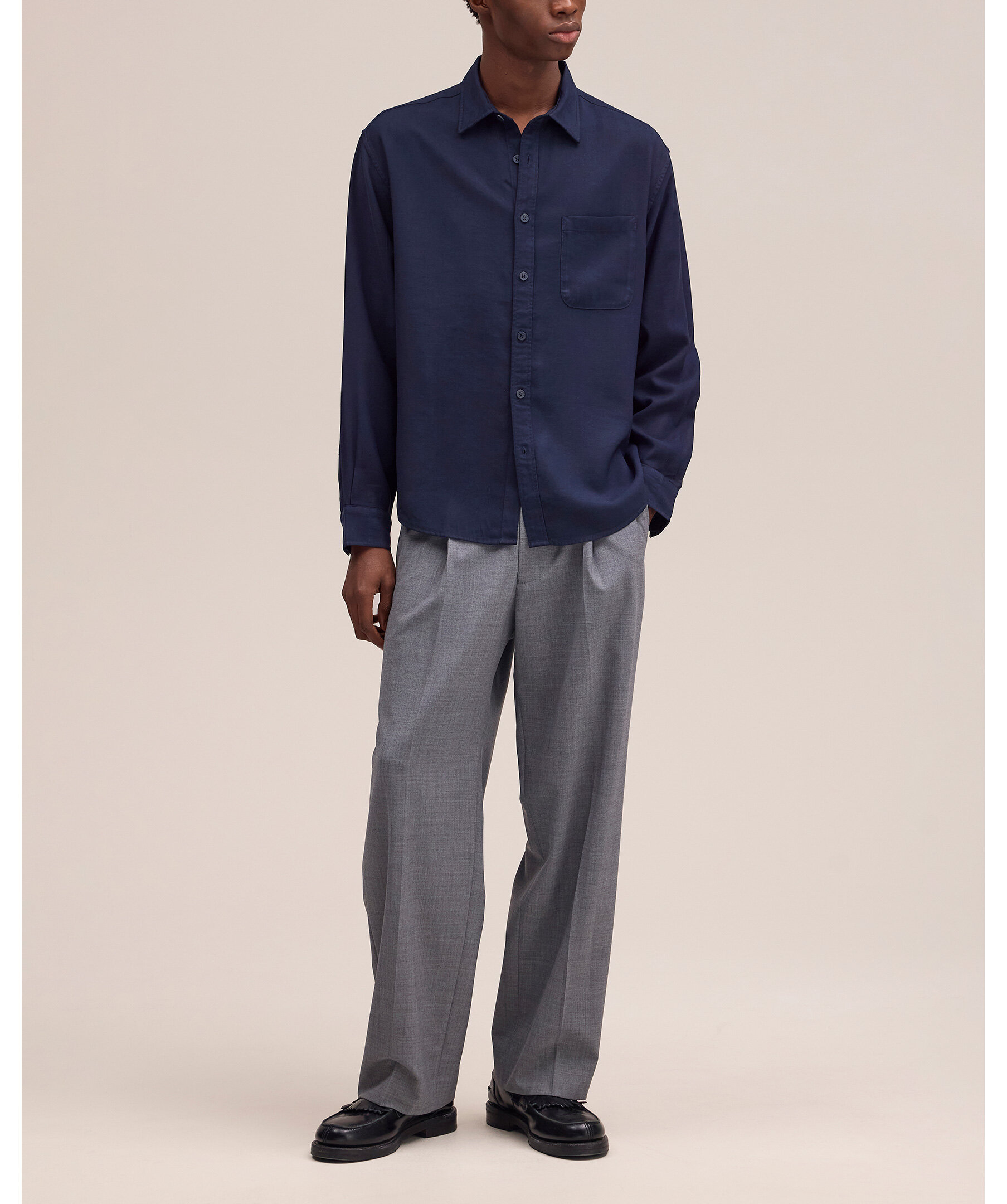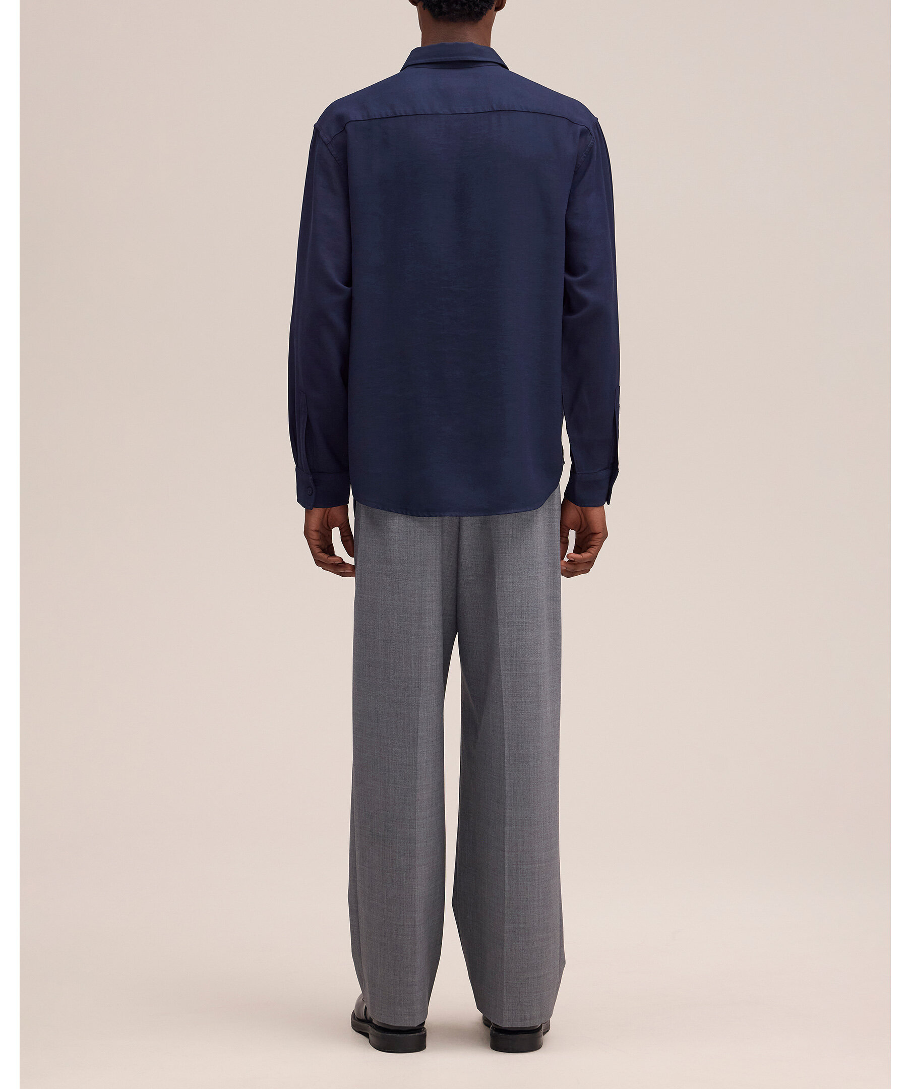 Mörkblå skjorta tillverkad av mjuk, fallande LENZING™ ECOVERO™ viskos-twill. Designad med bred knappslå, rundad fåll och lätt sänkta axlar.