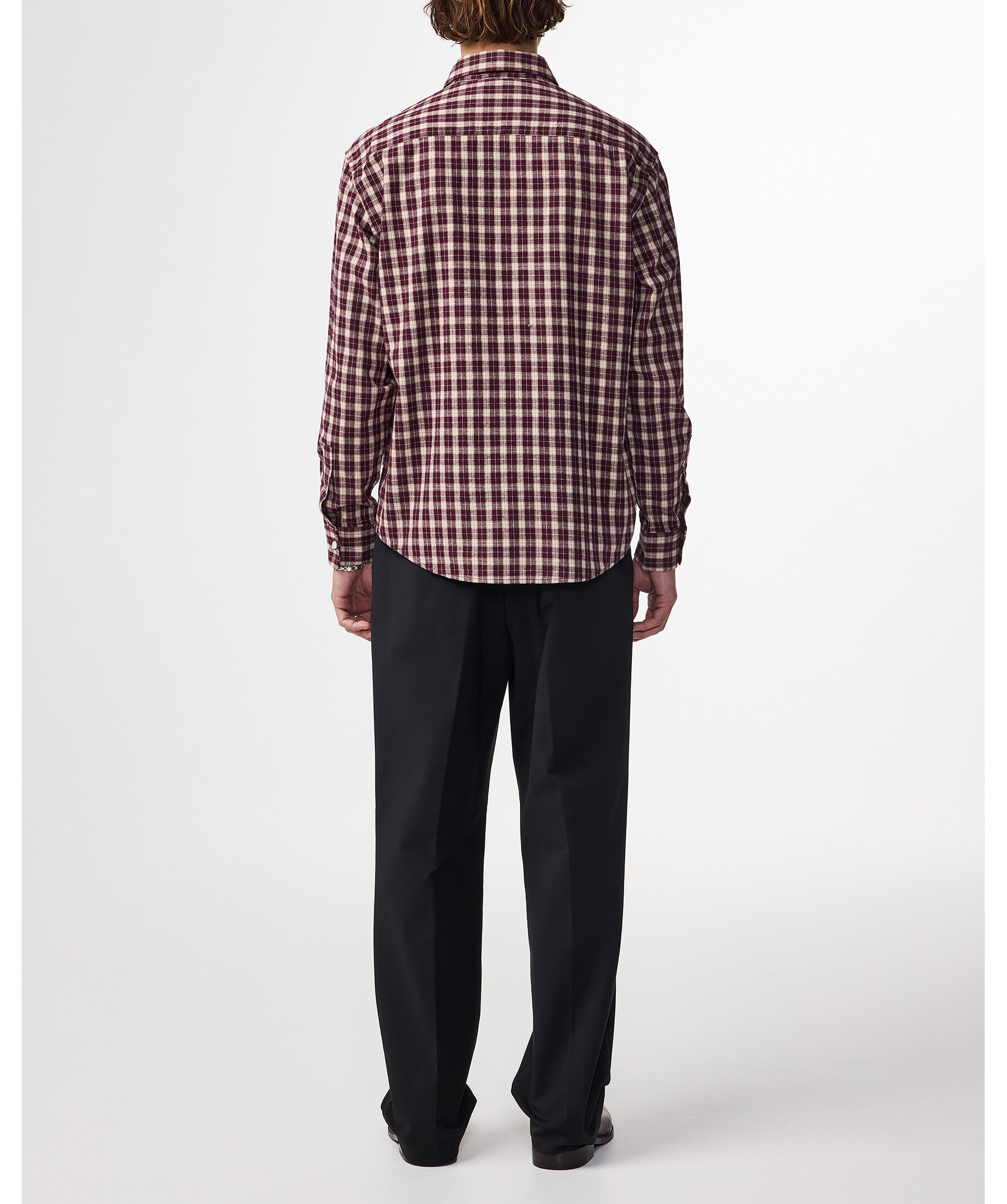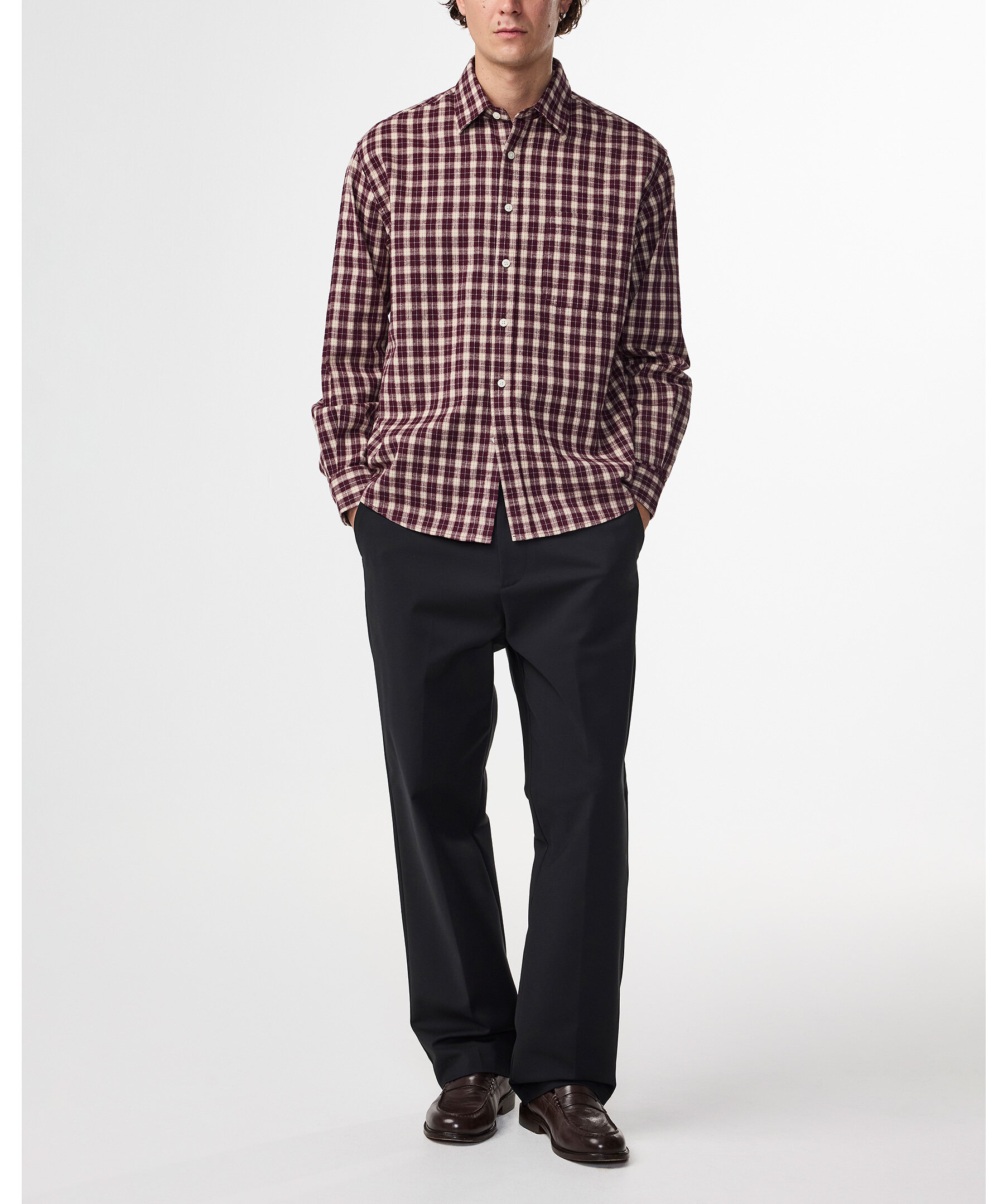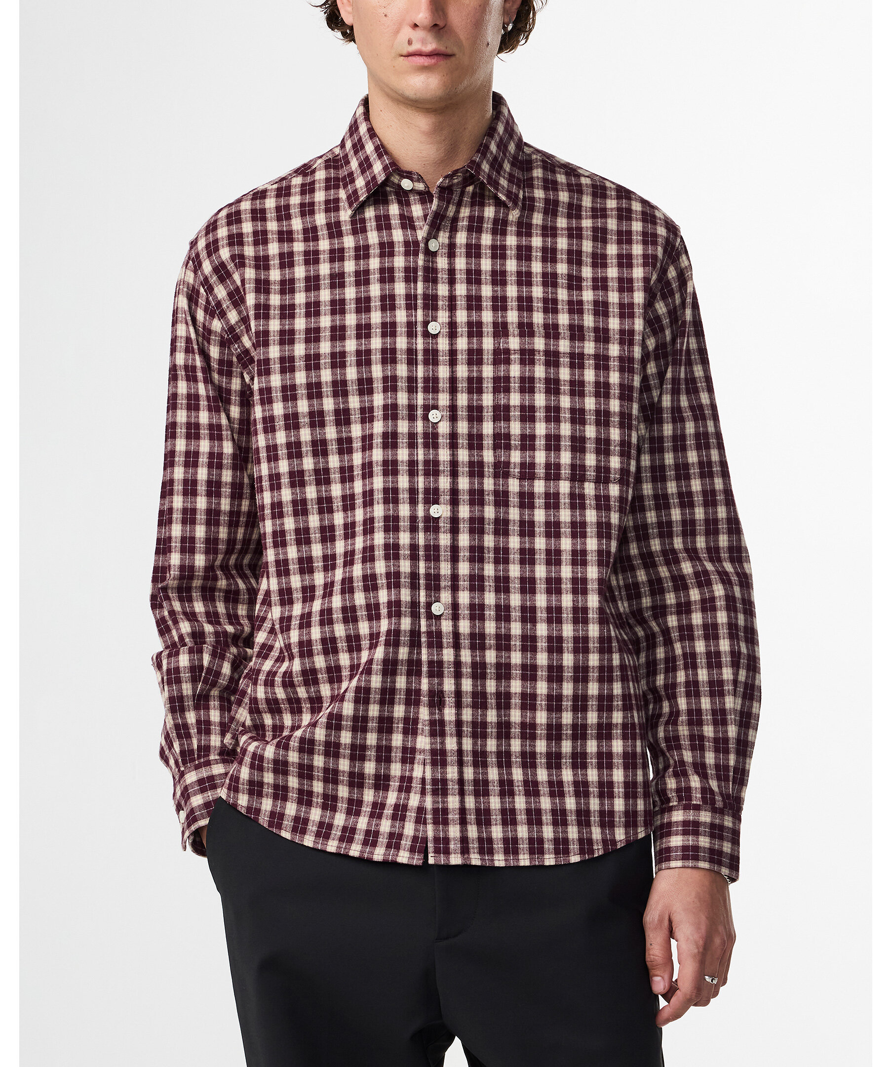 Vinröd, rutig flanellskjorta från NN 07. Stängs framtill med knappar. Spetsig krage. Bröstficka på vänster sida. Enkla manschetter vid ärmslut. Tillverkad i 100% ekologisk bomull.