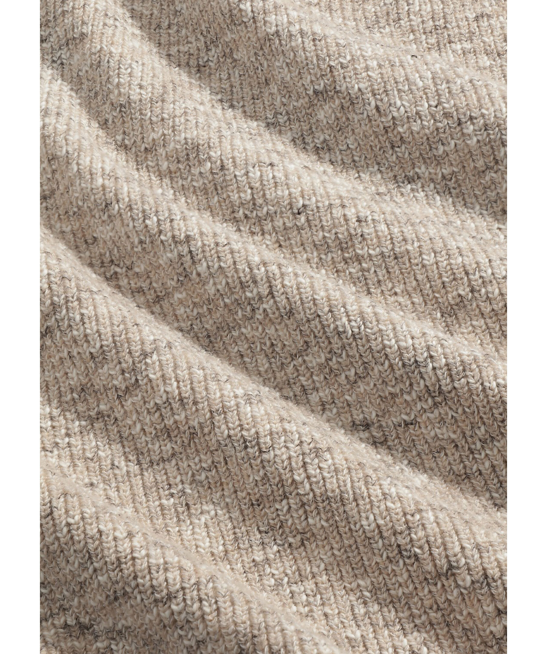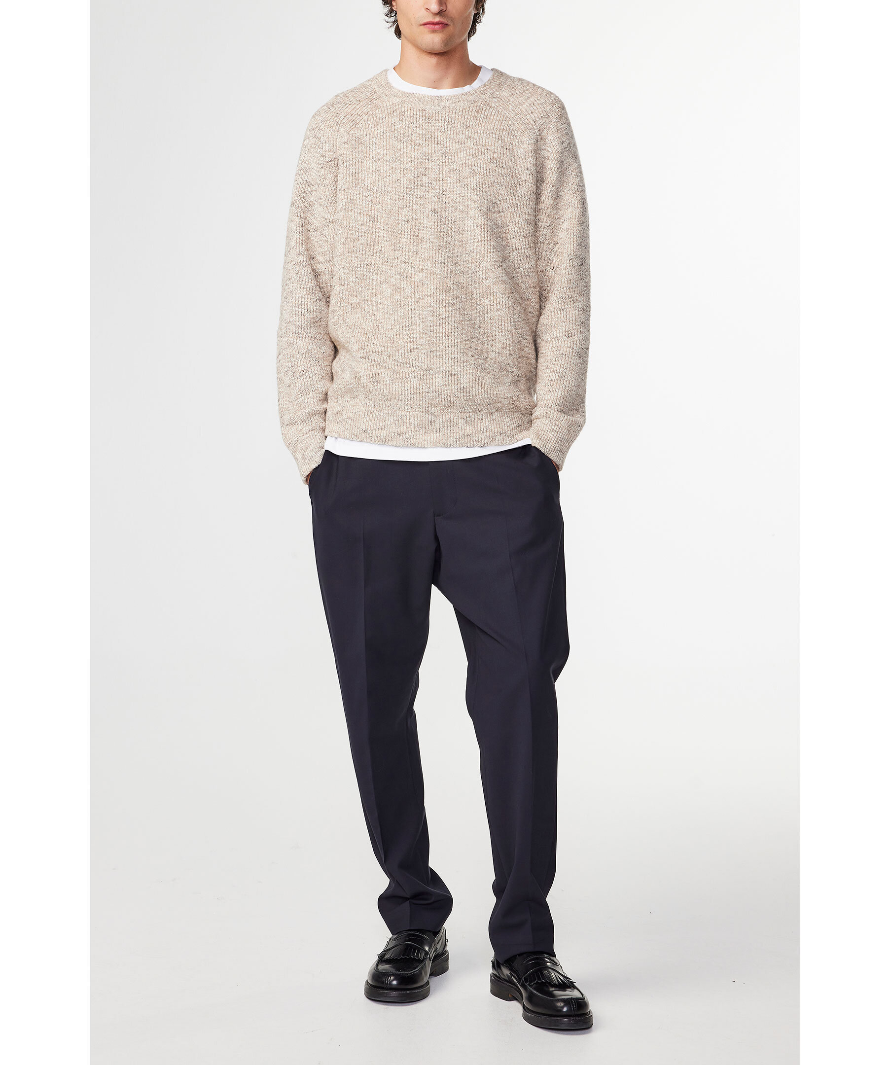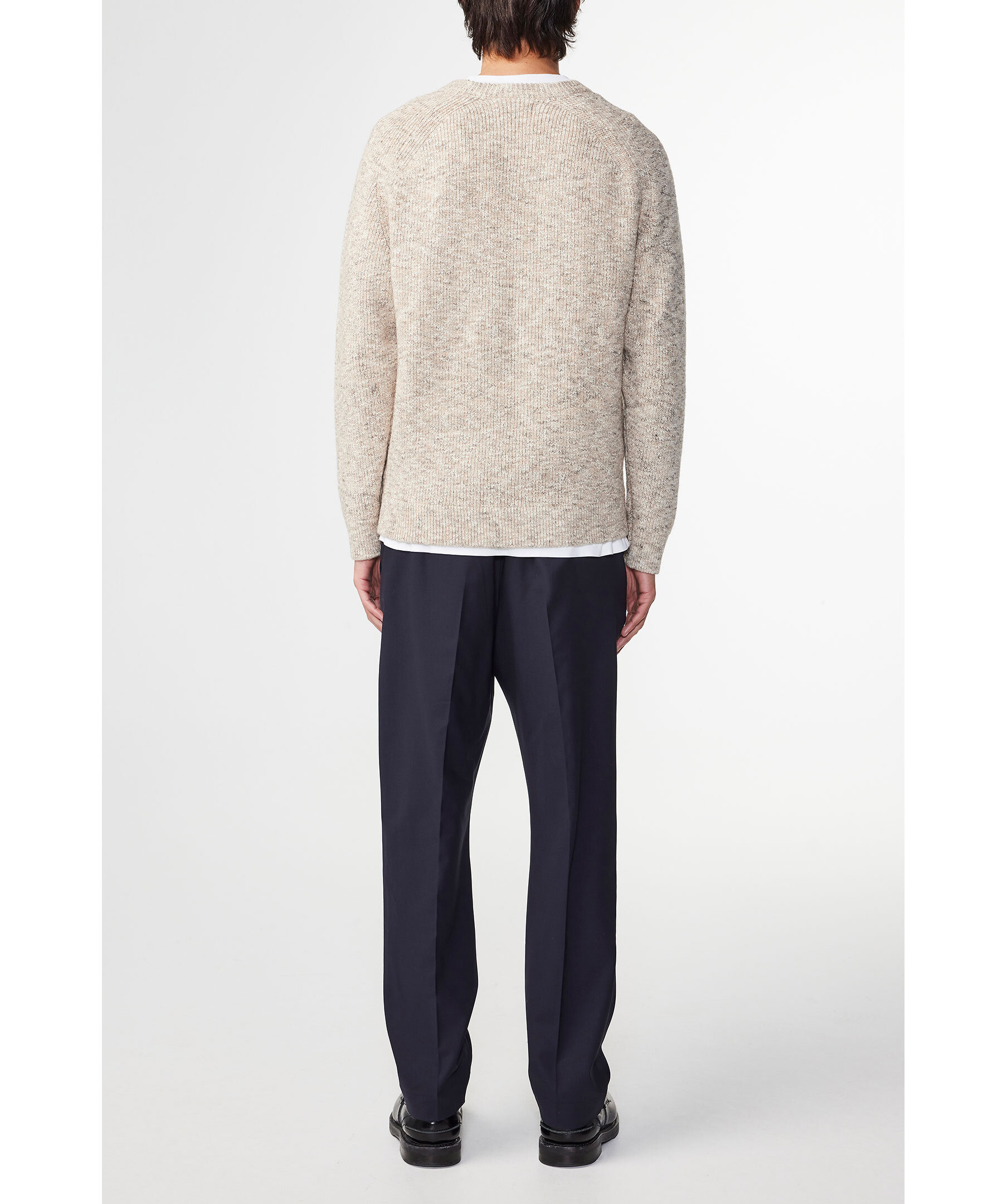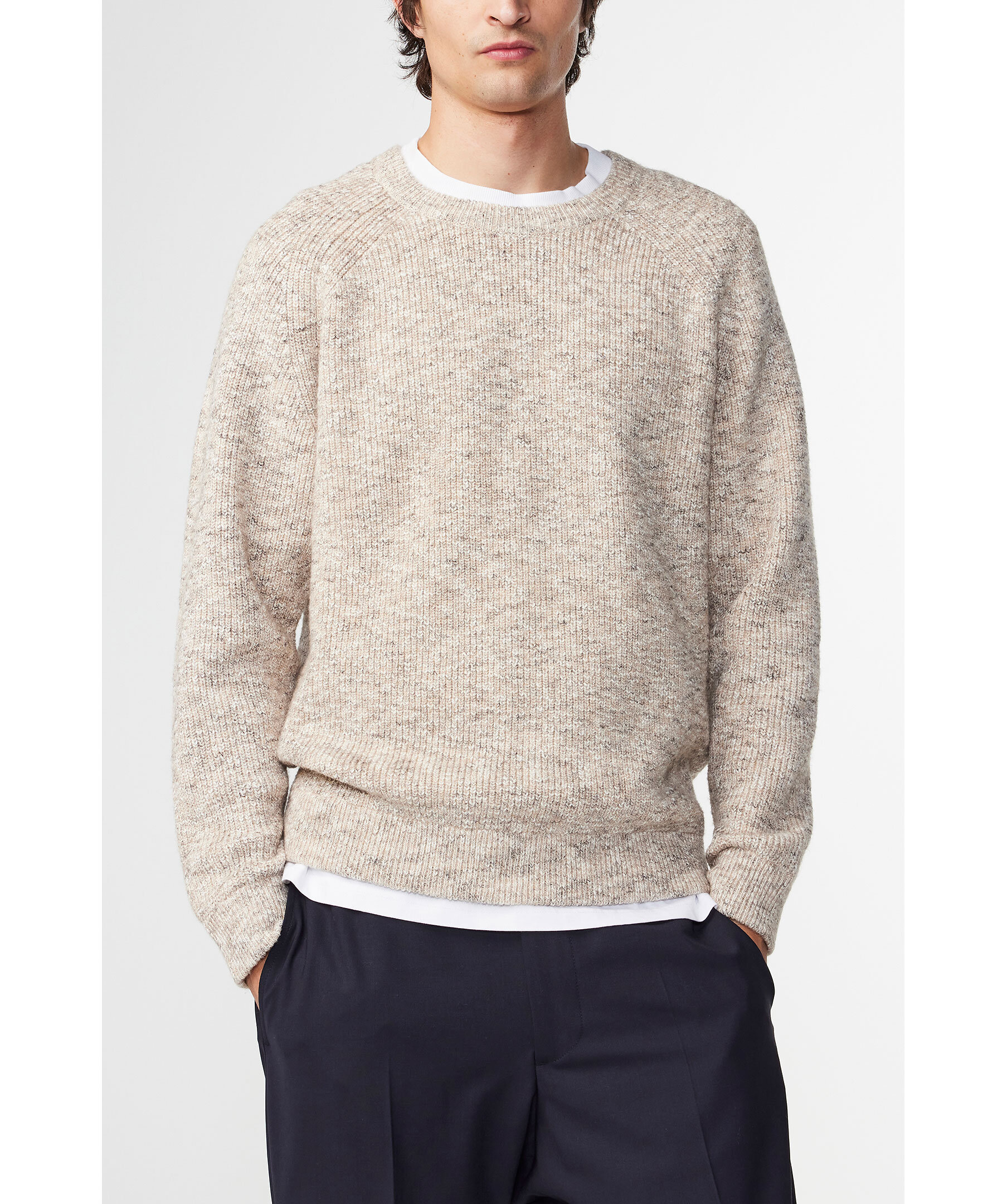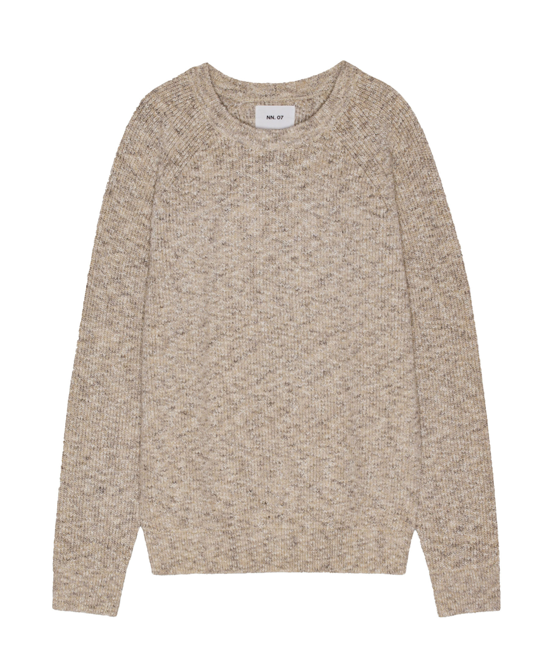 Havrefärgad, ribbstickad tröja från NN07. Tröjan har rund, ribbstickad halsringning samt ribbstickade muddar vid ärm- och plaggslut. Tillverkad i bouclégarn.