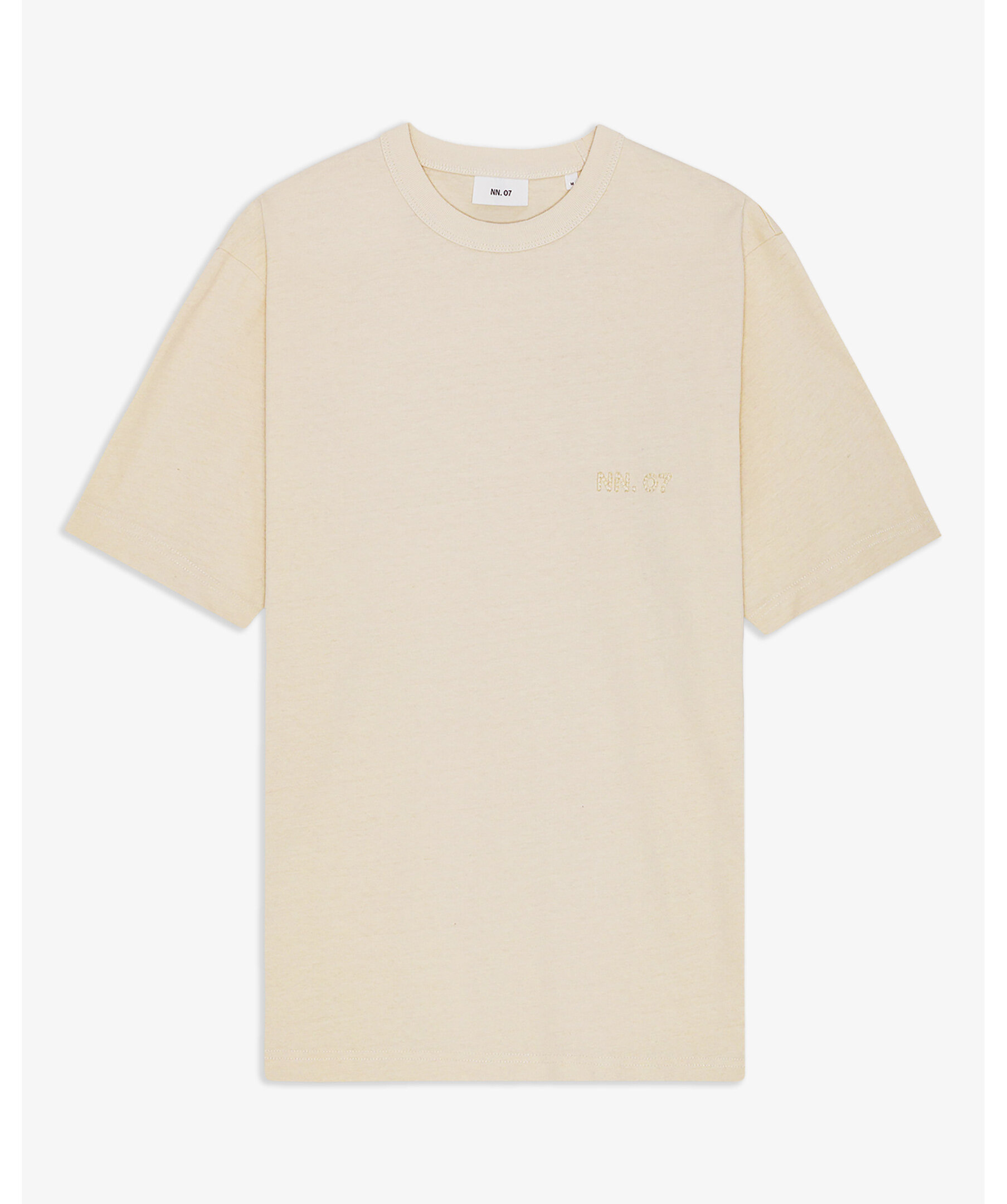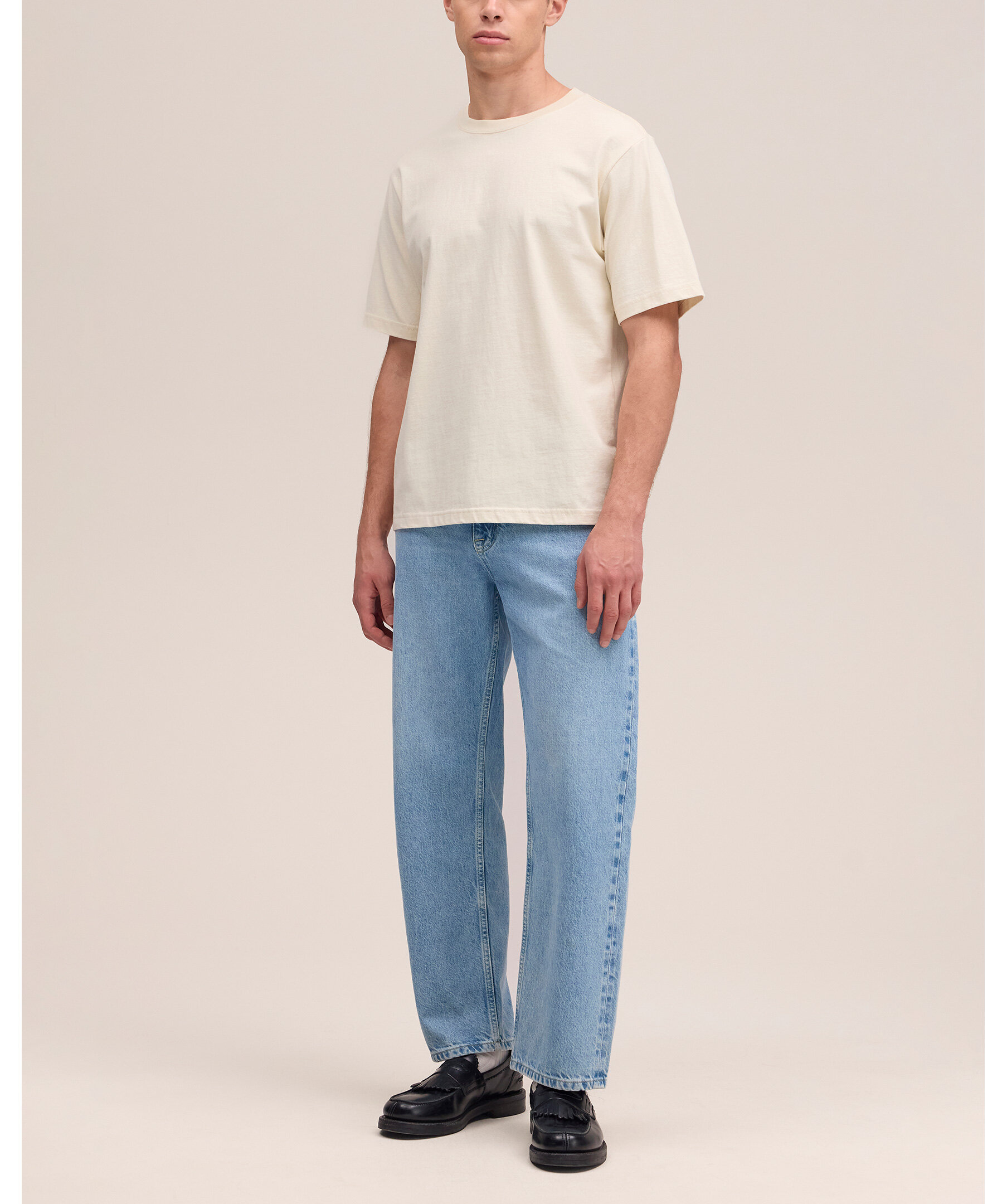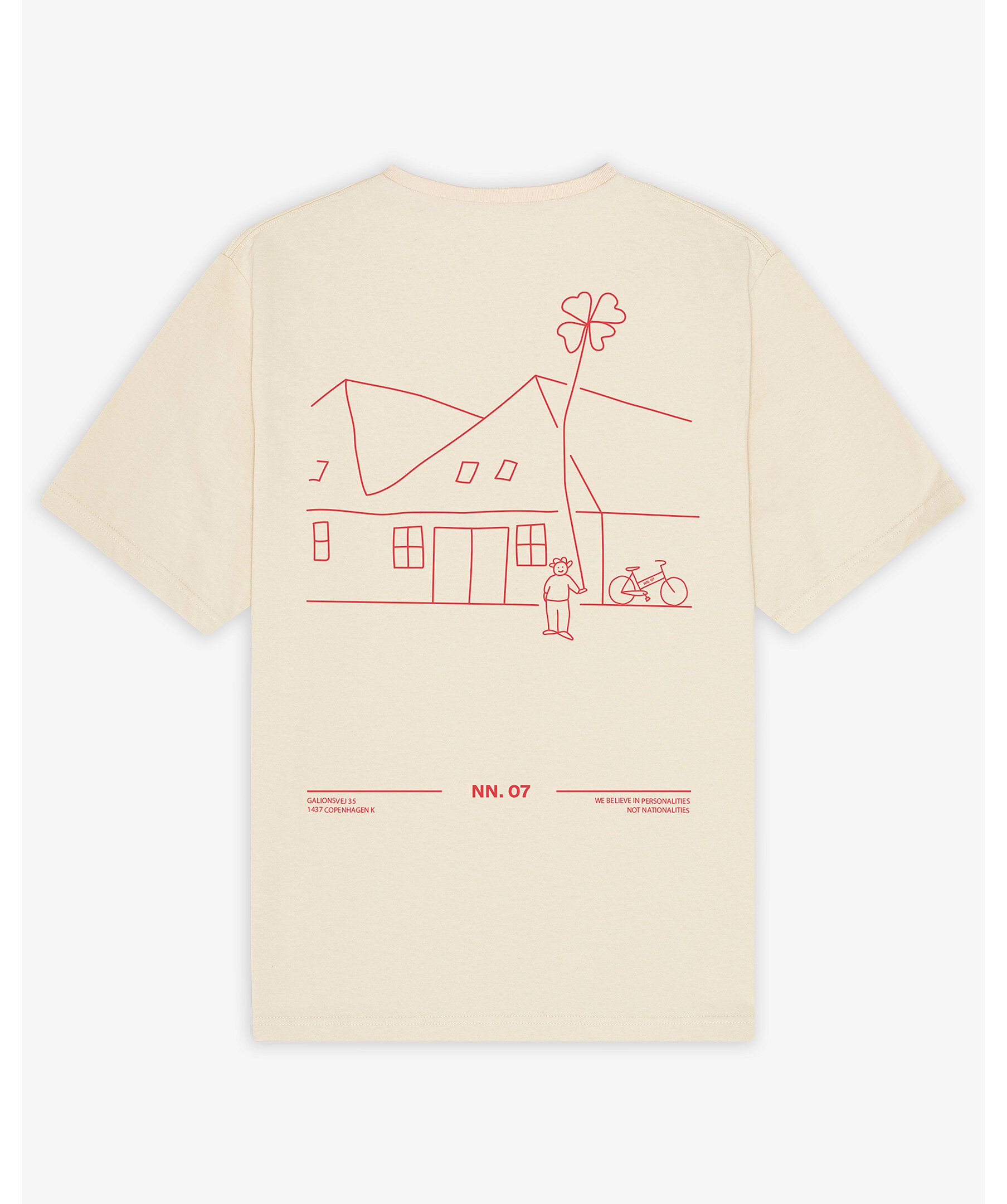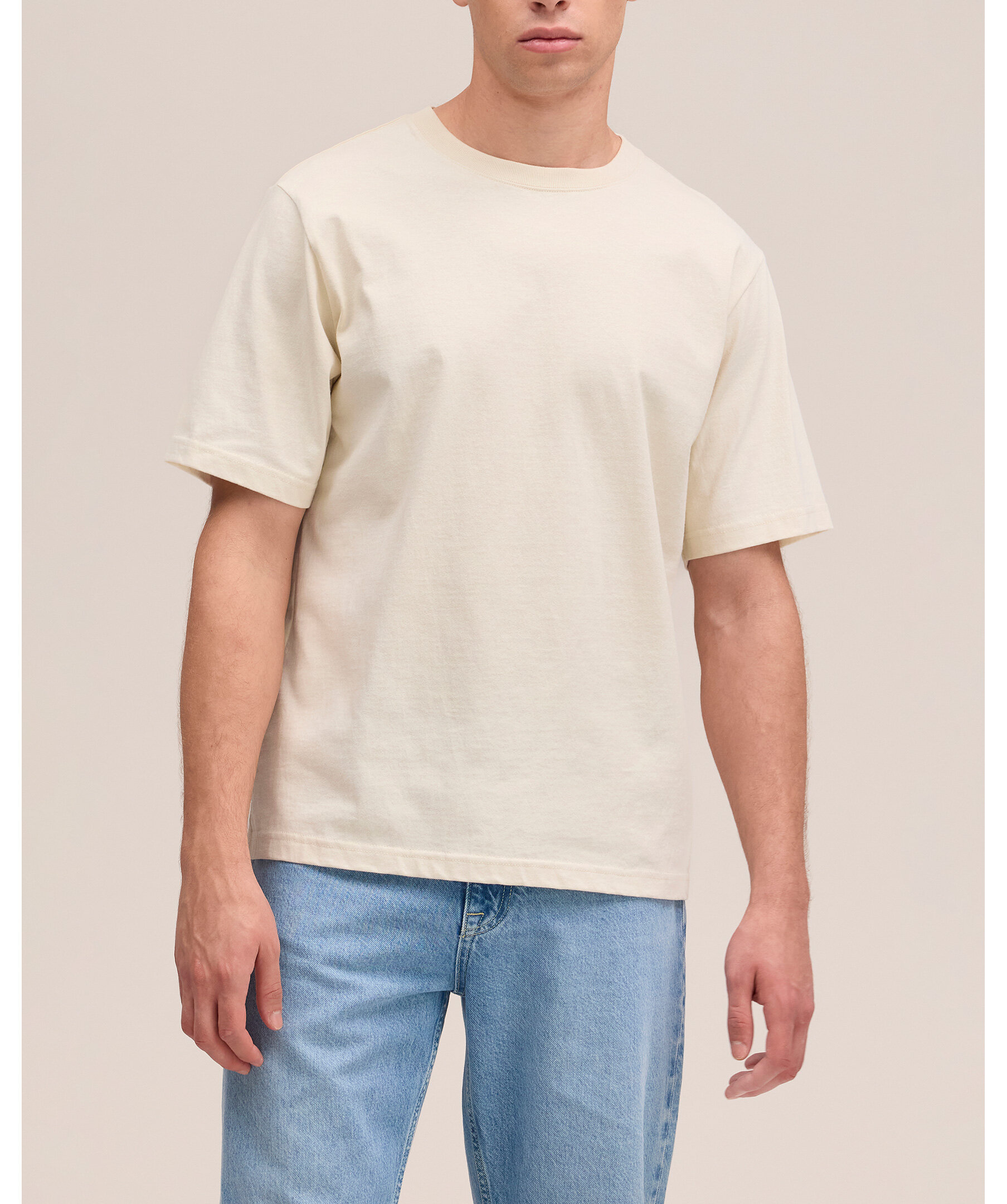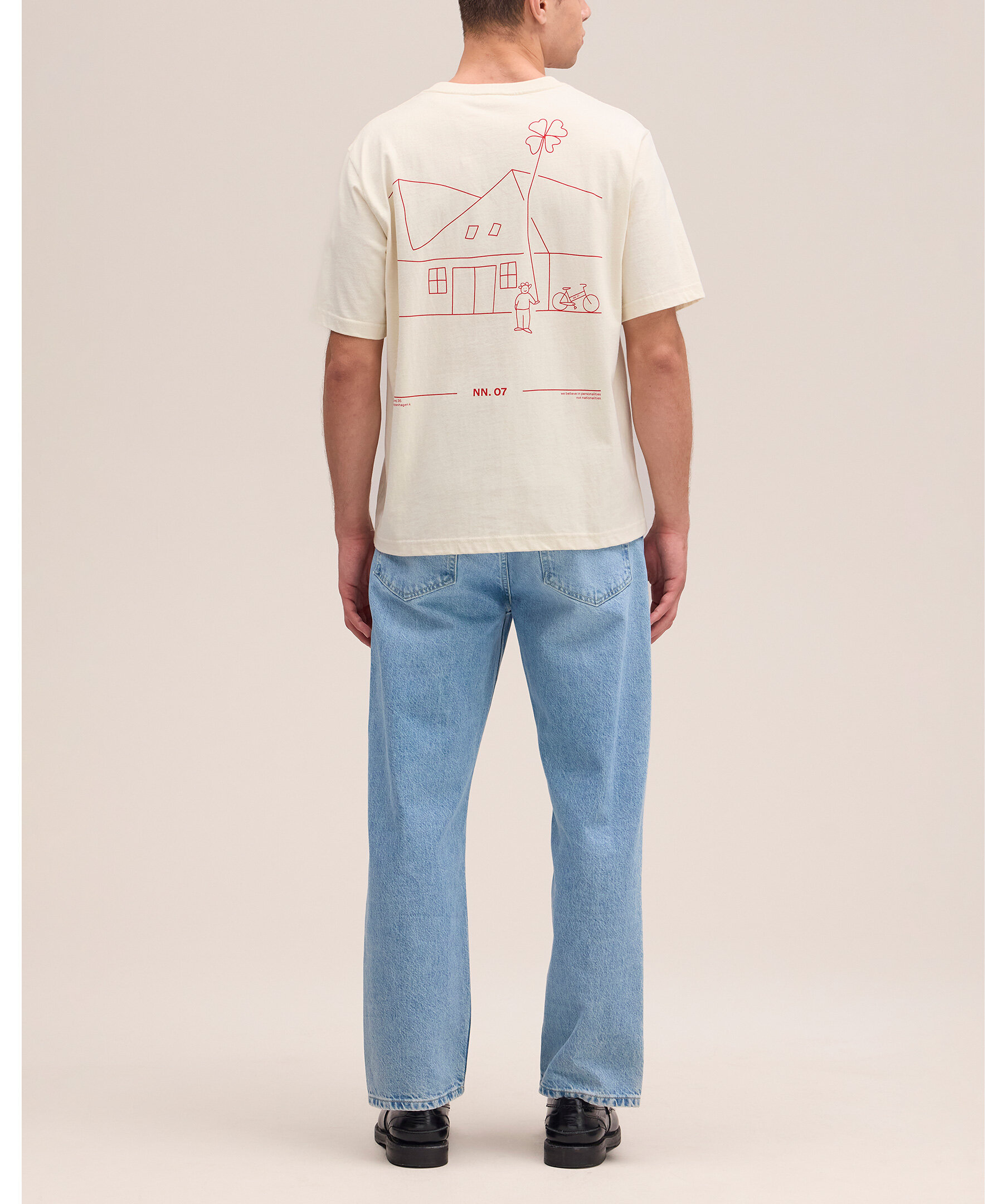 Cremévit t-shirt tillverkad av ekologisk bomullsjersey med en taktil, texturerad känsla. Har ett stort tryck på baksidan för en distinkt look.