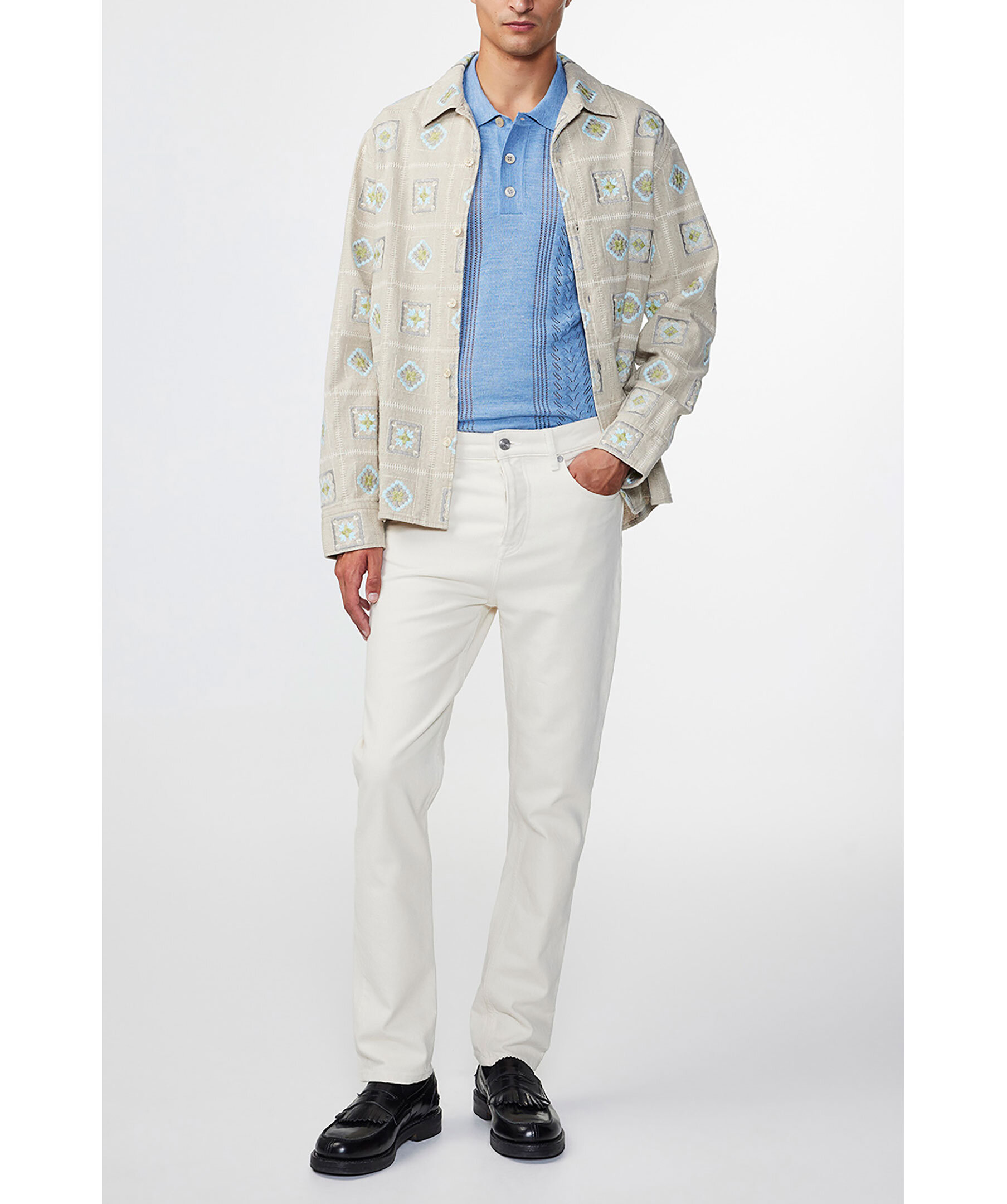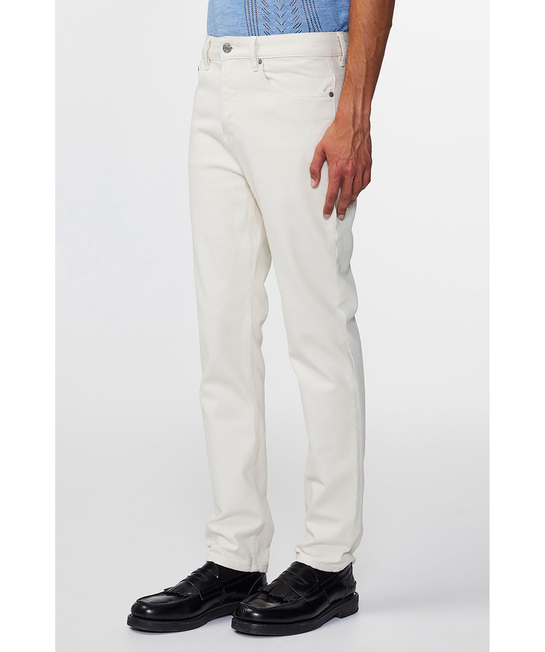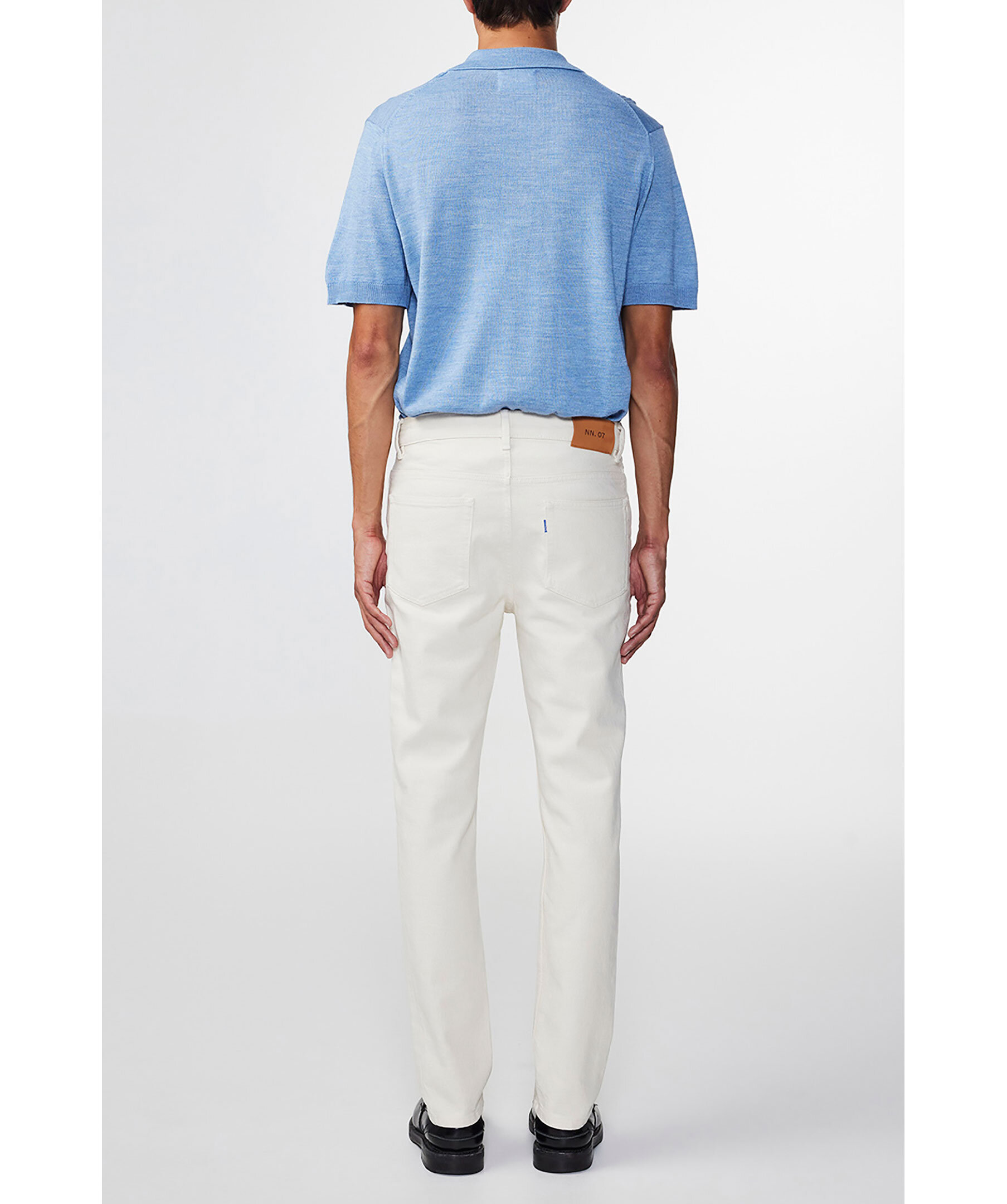Benvita jeans från NN07. Byxorna har fem fickor, bälteshällor i midjan, logotypgraverade knappar samt blått broderi längs ena bakfickan. Tillverkade i en bomullsblandning.